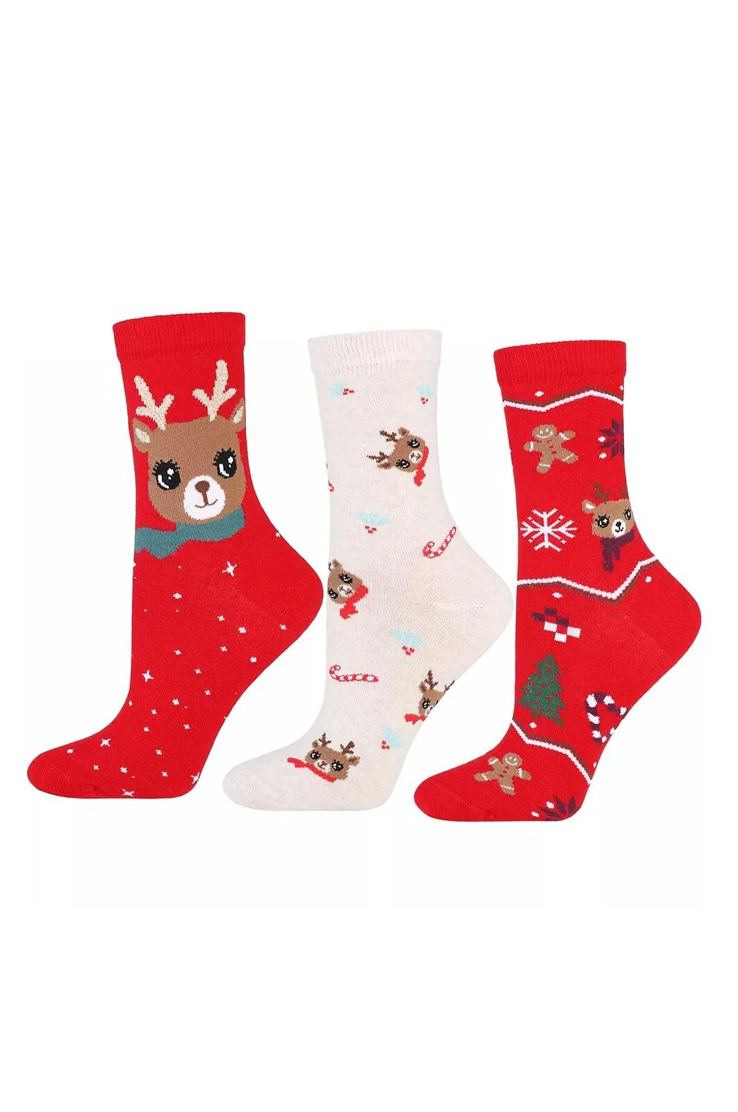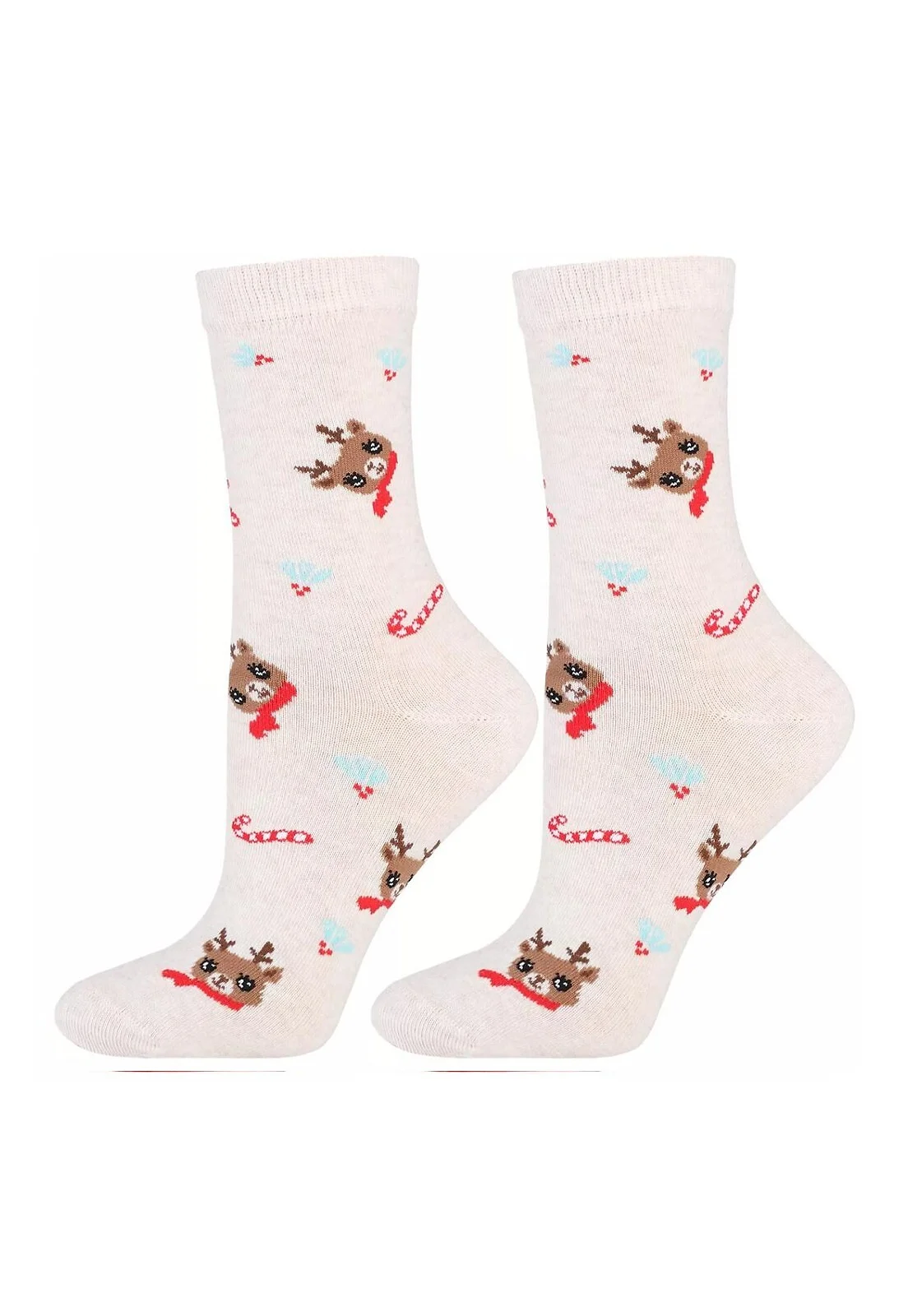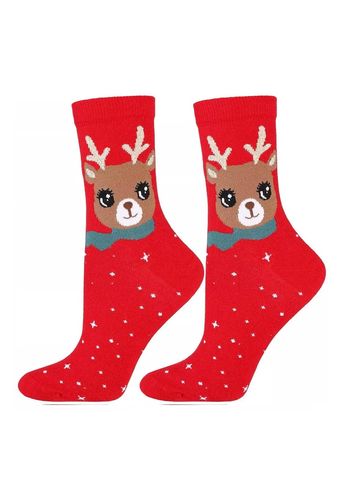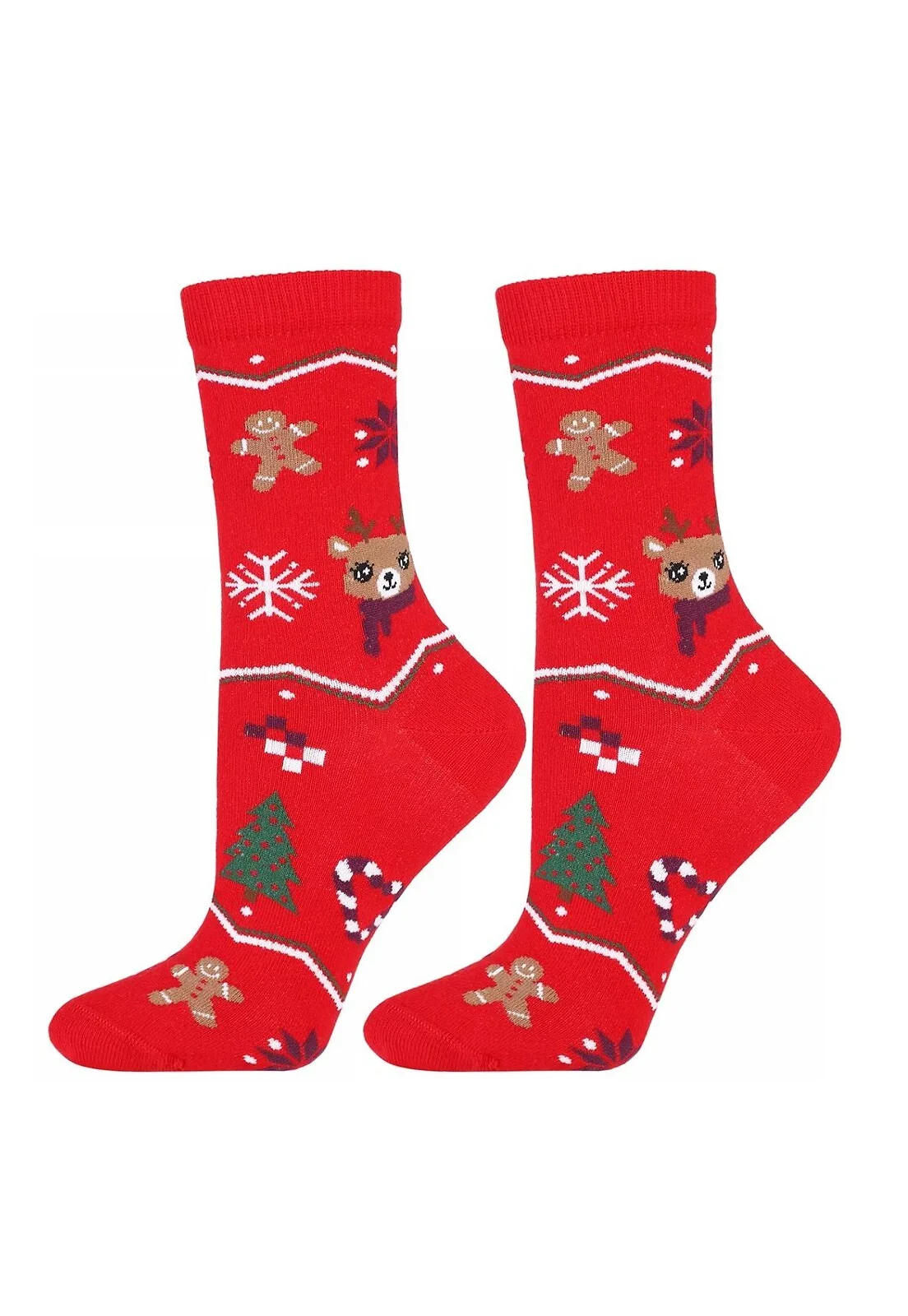 Skarpety damskie - wysokiej jakości bawełna - ozdobione kolorowymi świątecznymi wzorami - wygodny ściągacz - doskonałe prezent - dostępne kolory wybierane losowo: czerwony, jasny beżowy, czerwony Skład: 70% bawełna, 25% poliamid, 3% metalizowana przędza, 2% elastan