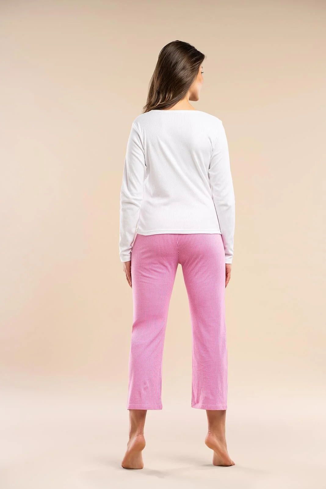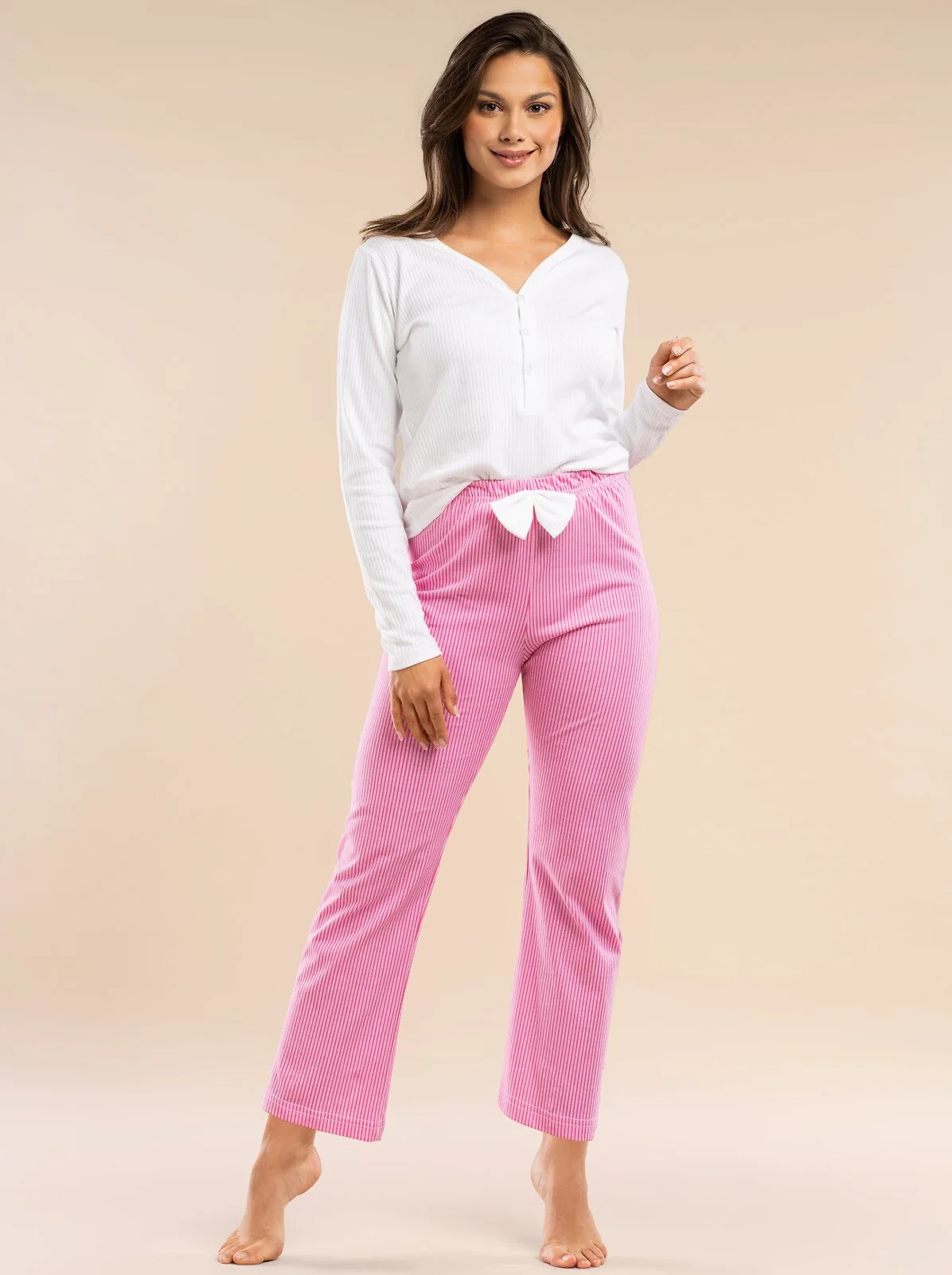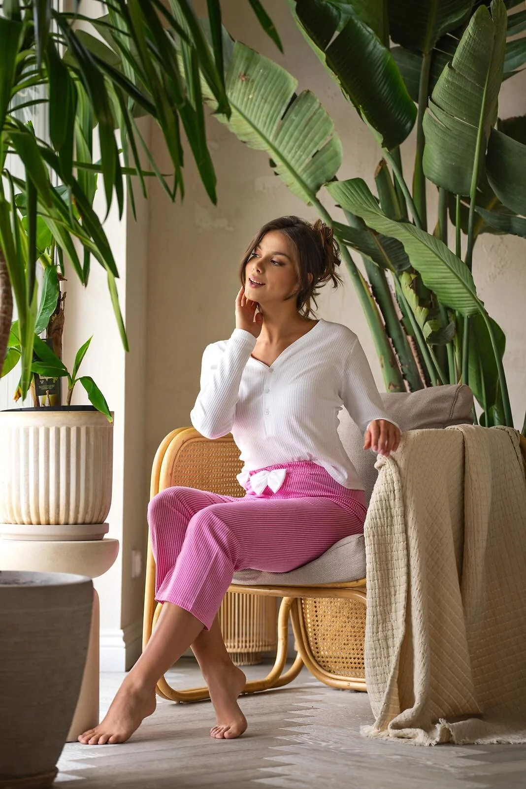 Piżama damska - wysokiej jakości bawełna - koszulka jednolita w prążek - długi rękaw - dekolt "V" zapinany na guziki - prosta, luźna nogawka - w pasie gumka obszyta bawełną - pakowana w foliowy woreczek   Skład: 100% bawełna