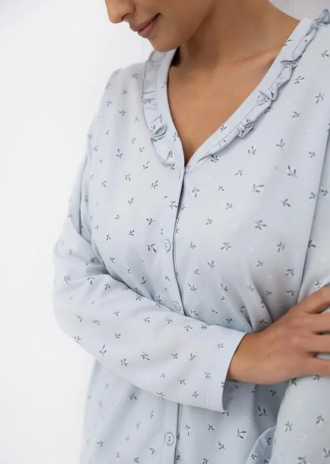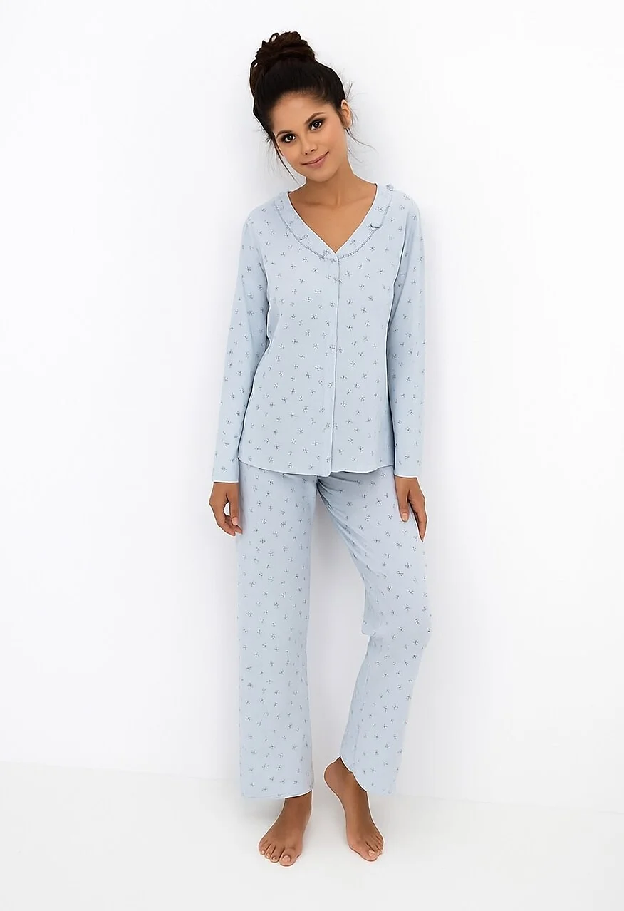 Piżama damska - wykonana z delikatnej, wzorzystej bawełny - koszulka zapinana na guziki - długi, prosty rękaw - dekolt ozdobiony falbanką - długie spodnie - w pasie satynowa kokardka   Skład: 100% bawełna