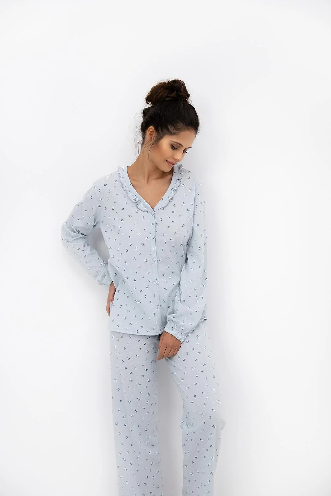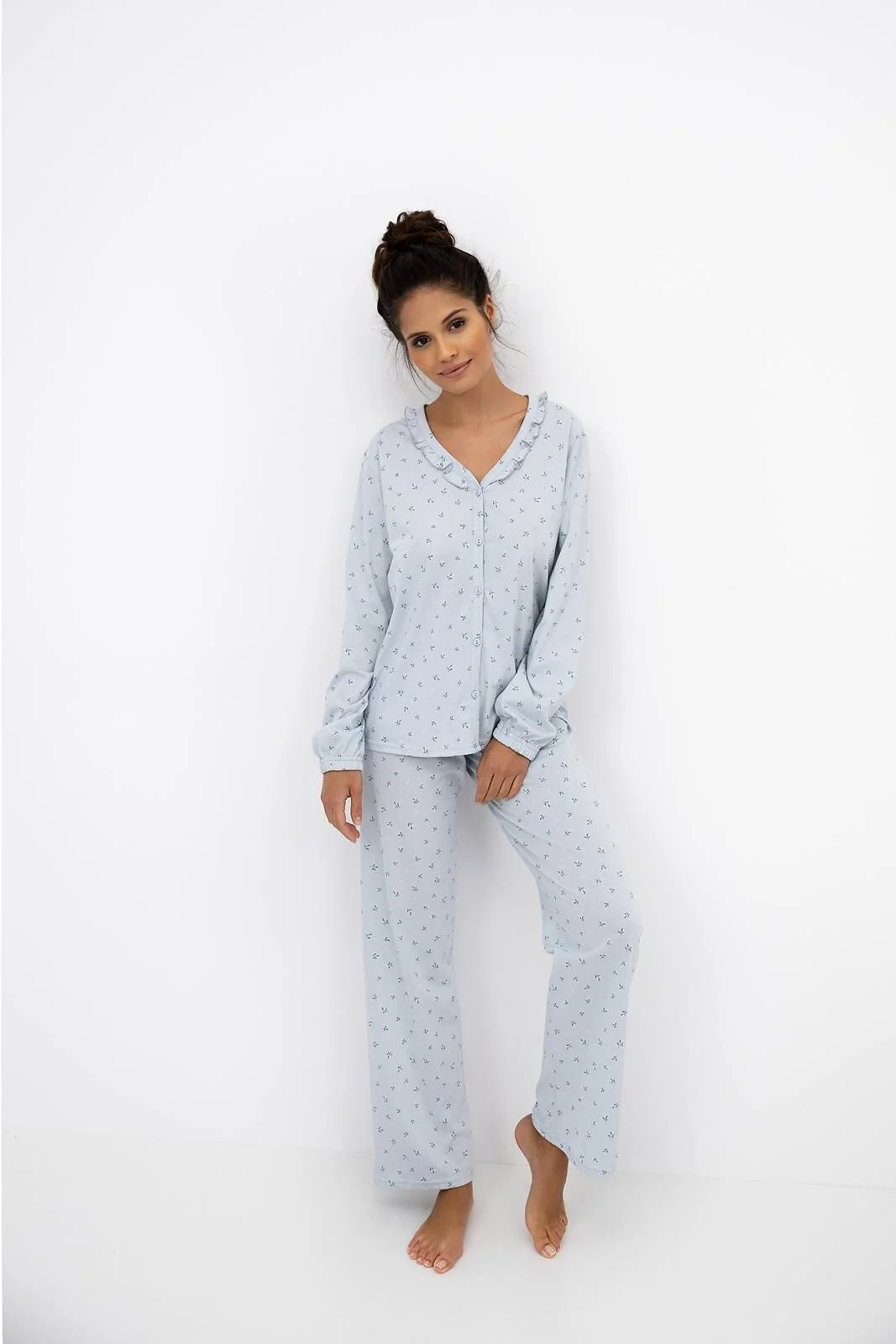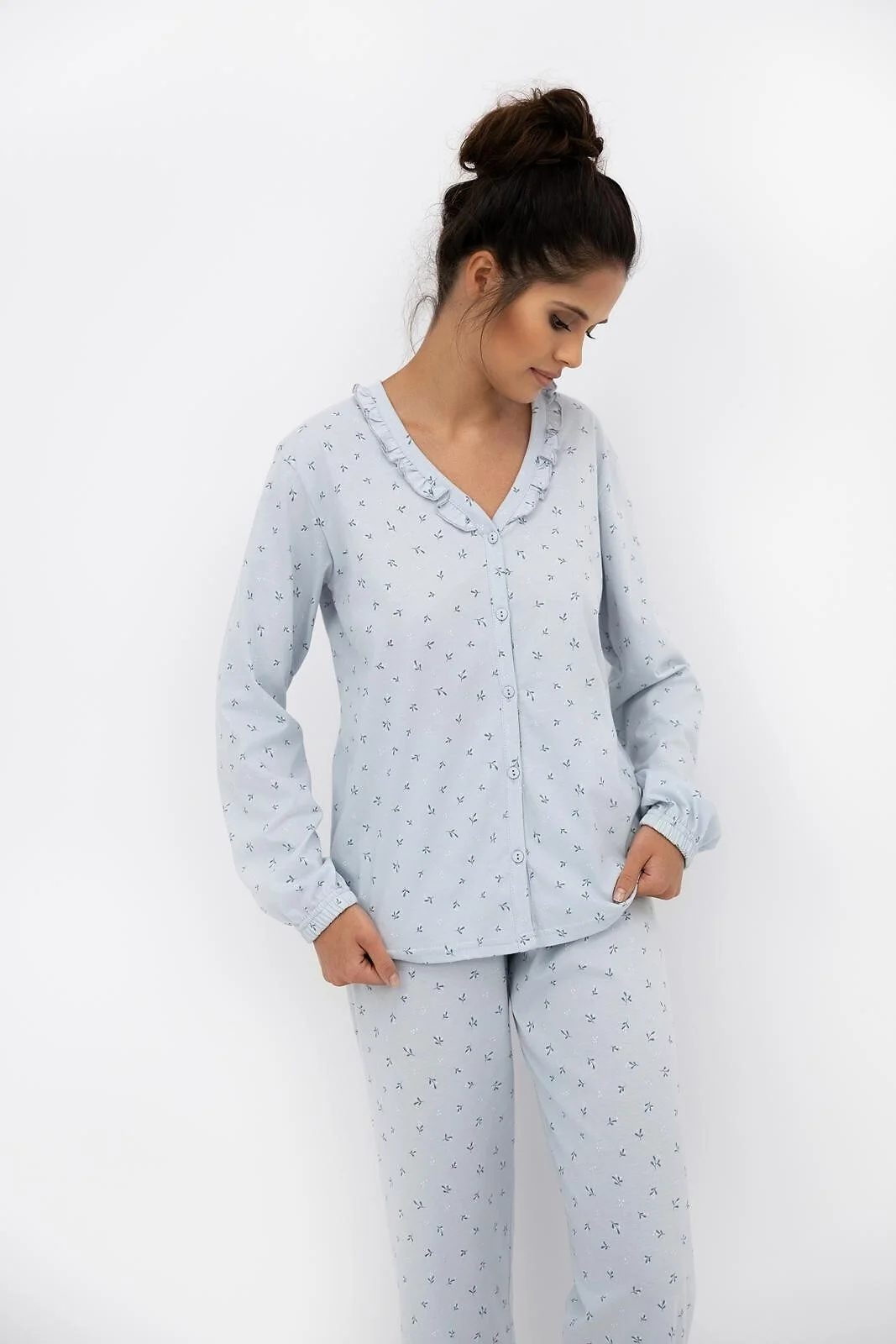 Piżama damska - wykonana z delikatnej, wzorzystej bawełny - koszulka zapinana na guziki - długi rękaw ze ściągaczem - dekolt ozdobiony falbanką - długie spodnie - w pasie satynowa kokardka   Skład: 100% bawełna