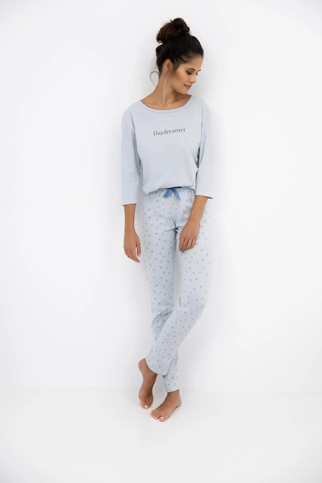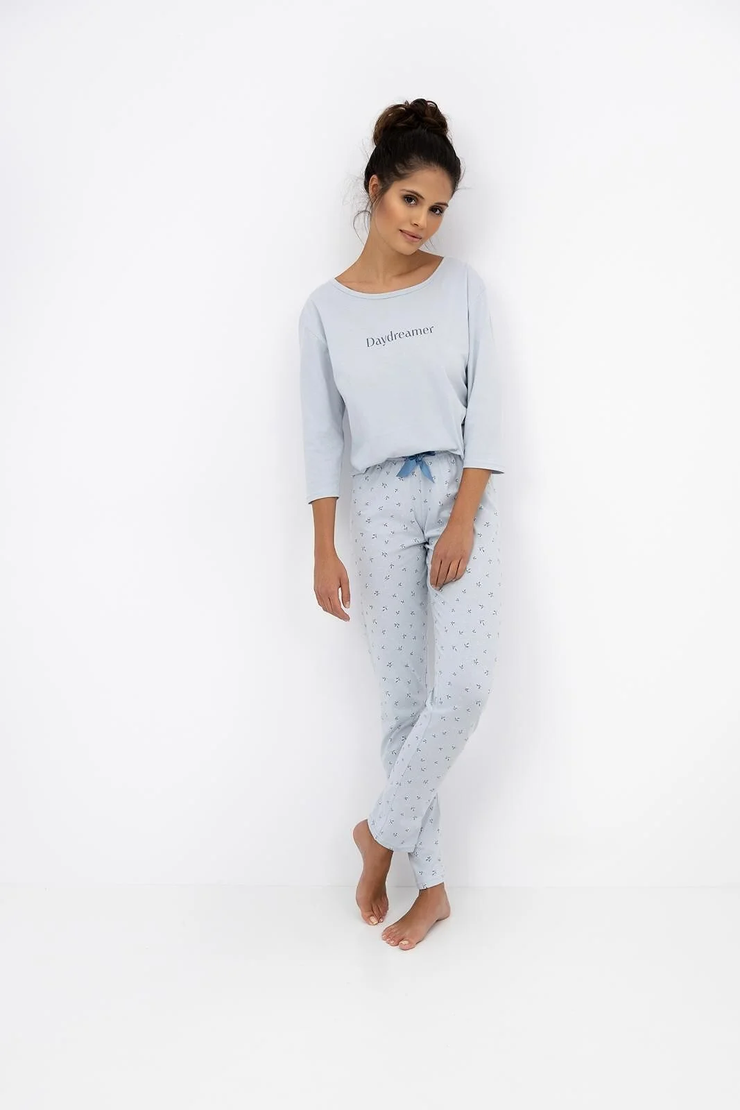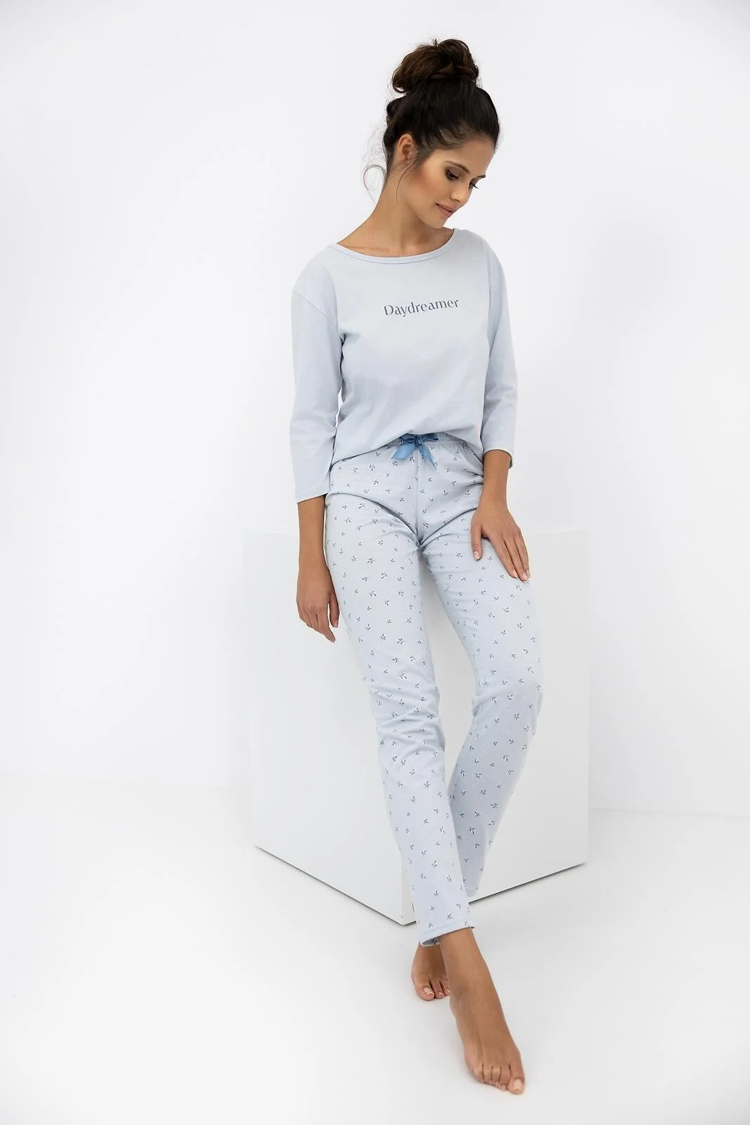 Bawełniana piżama damska - koszulka z rękawem 3/4 - dekolt okrągły - z przodu delikatny napis - spodnie długie, wzorzyste - w pasie wygodna gumka i ozdobna satynowa kokardka - pakowana w foliowy worek   Skład: 100% bawełna