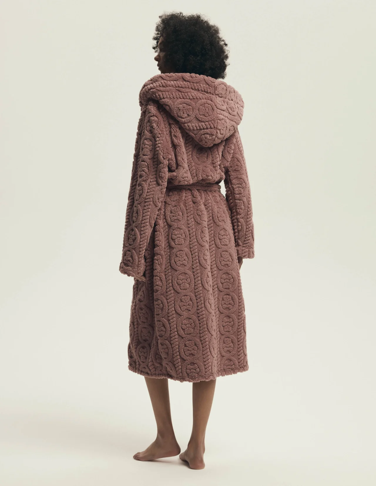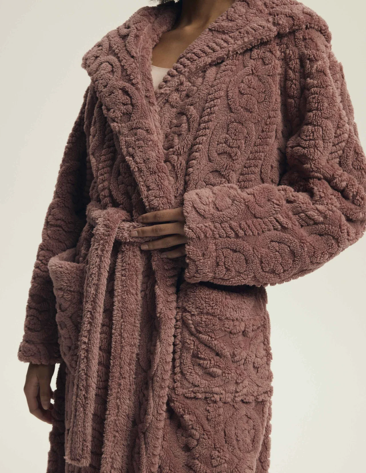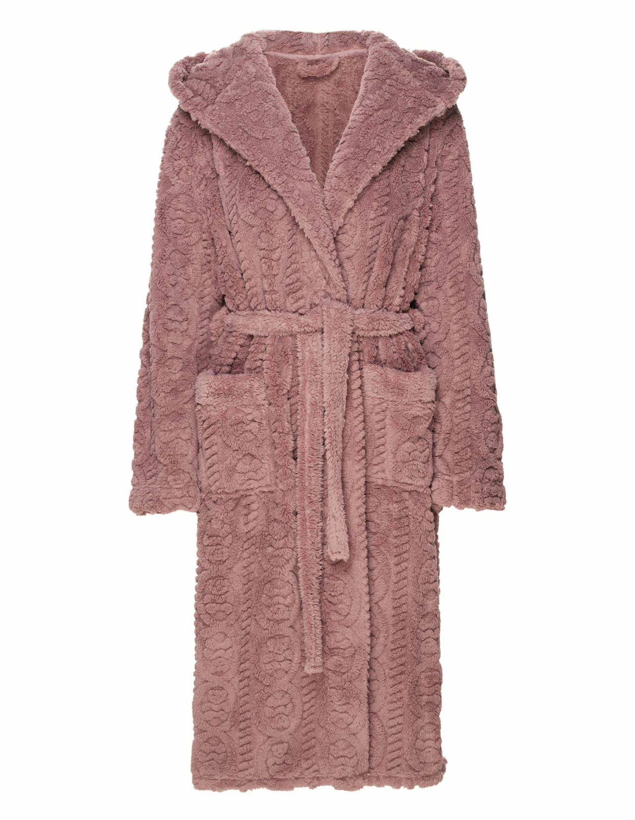 Długi damski szlafrok z kapturem, wykonany z miękkiej dzianiny z wytłaczanym, wypukłym wzorem. Ma długie rękawy, wiązanie w pasie oraz dwie wygodne, zewnętrzne kieszenie po bokach. Zapewnia ciepło, miękkość i elegancki wygląd.