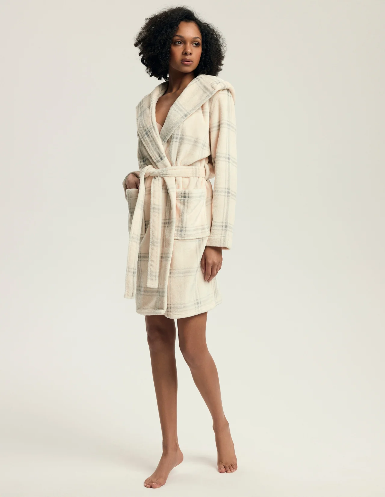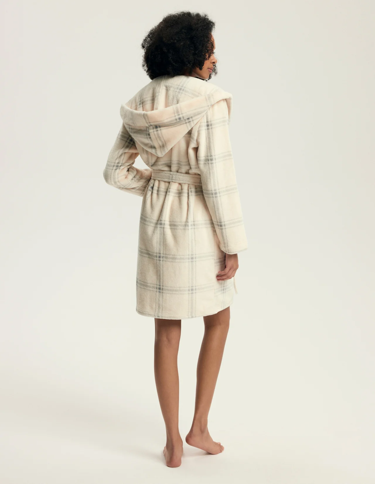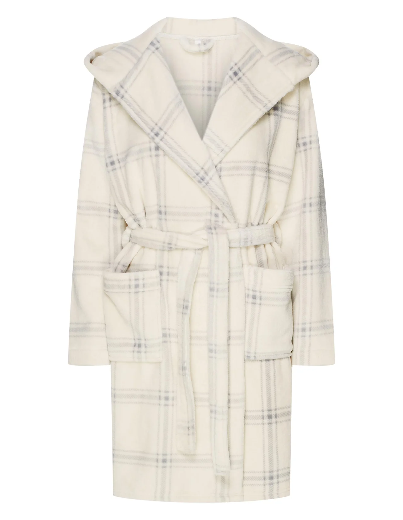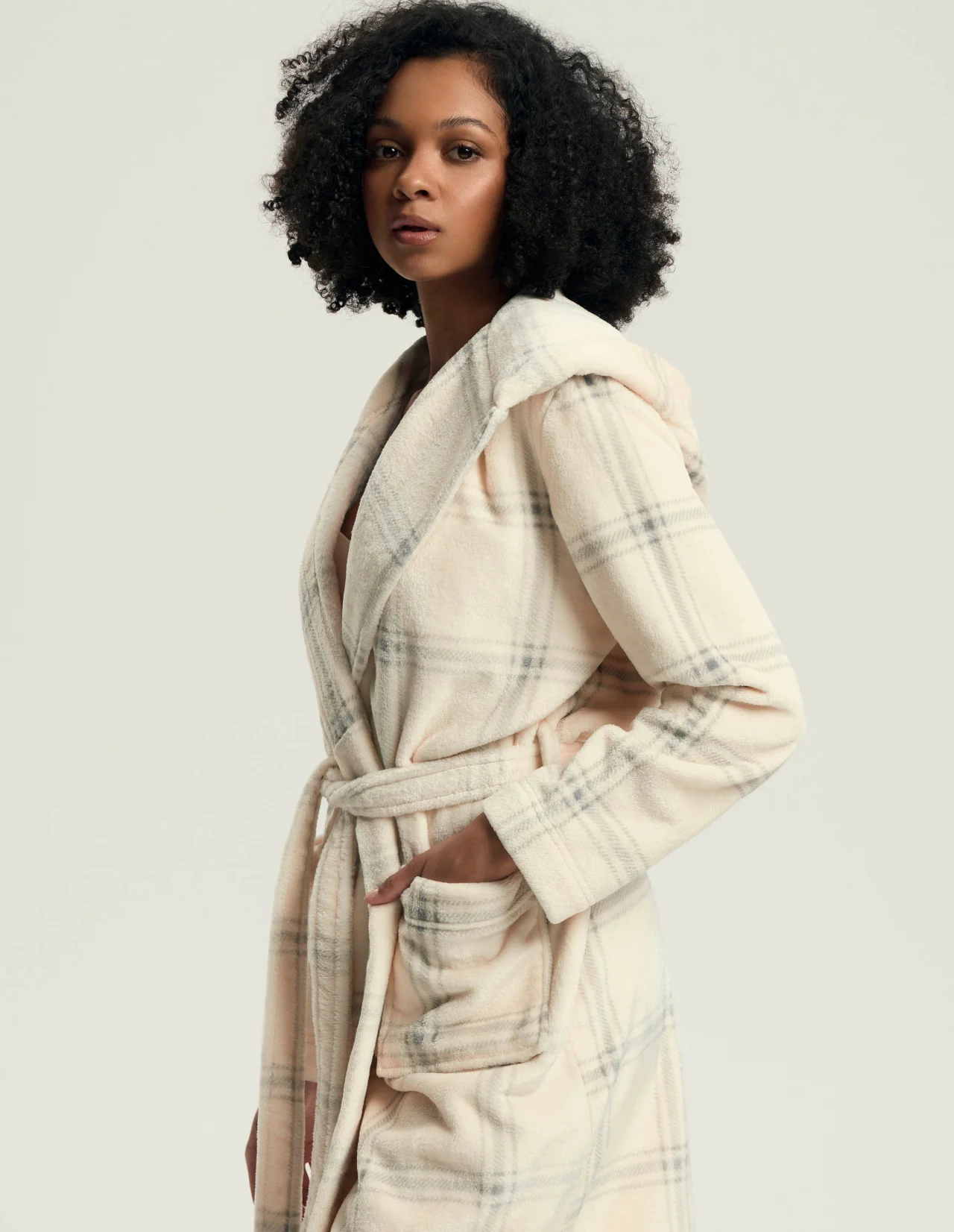 Damski szlafrok z kapturem, wykonany z miękkiej, gładkiej dzianiny ozdobionej subtelnym wzorem w kratę. Sięga do kolan, ma długie rękawy i wiązanie w pasie. Wyposażony w dwie zewnętrzne, wygodne kieszenie. Idealny na chłodniejsze dni, zapewnia ciepło i przytulny komfort.