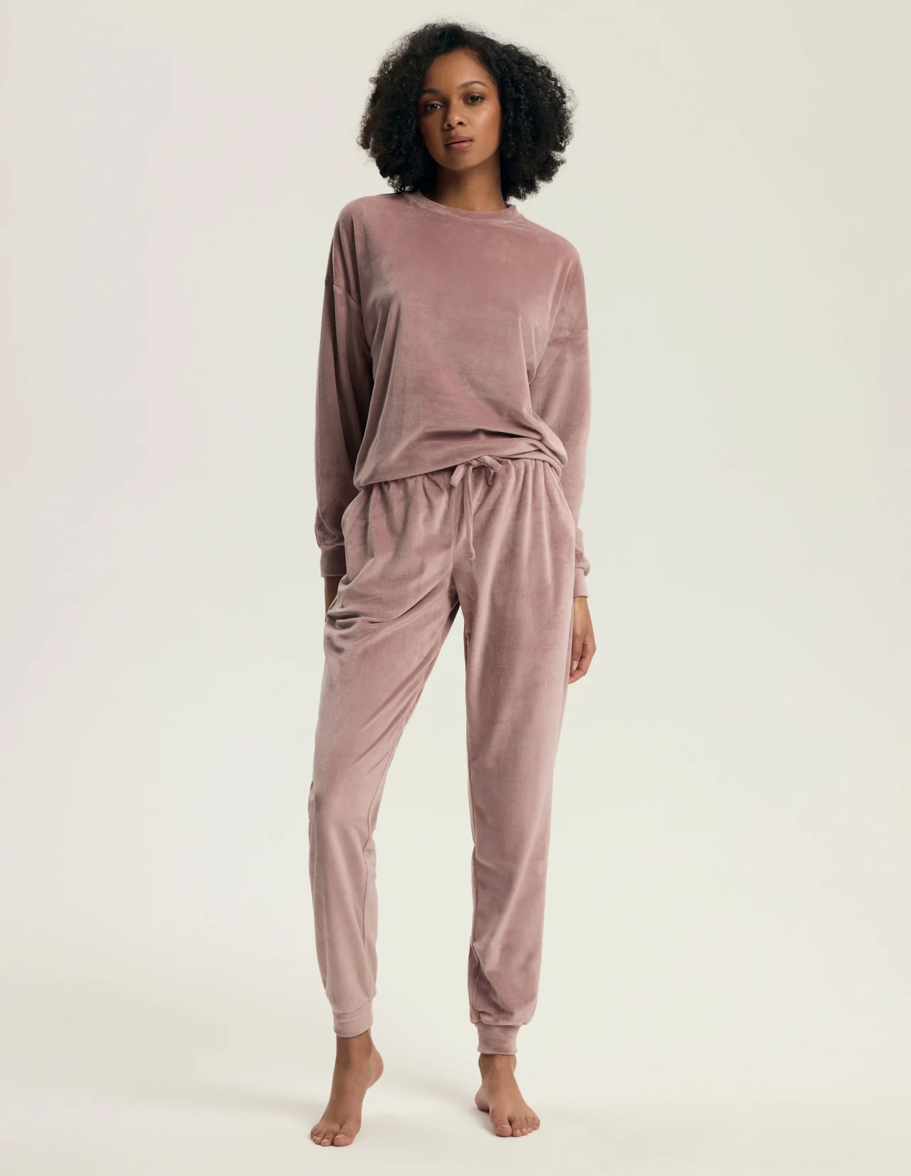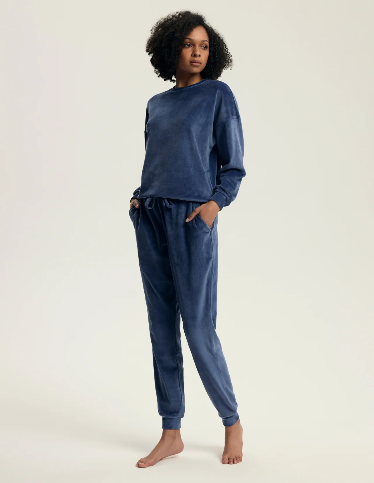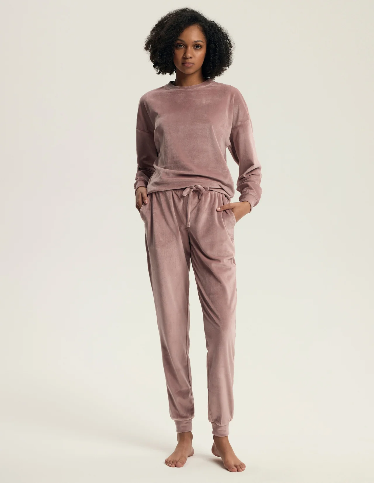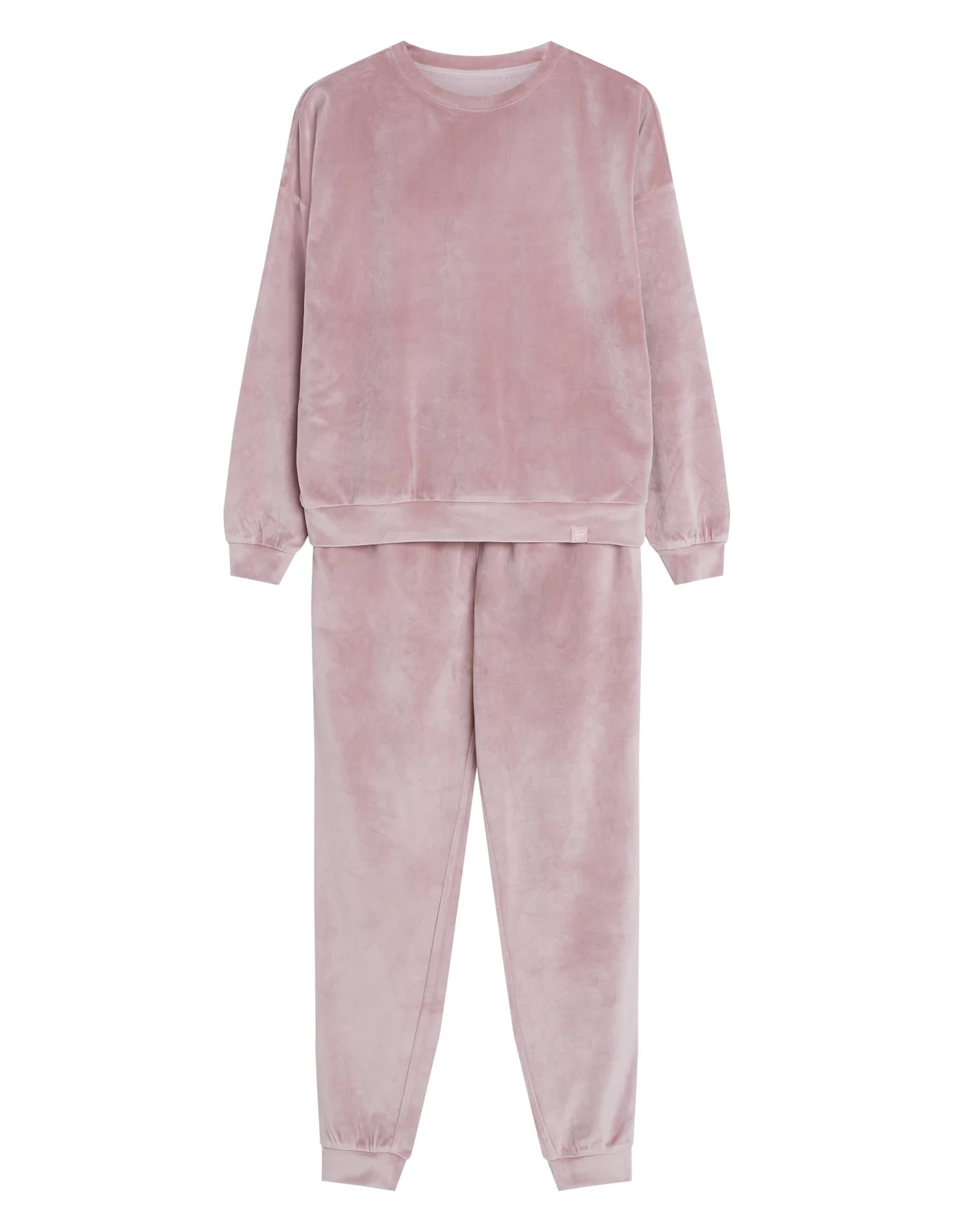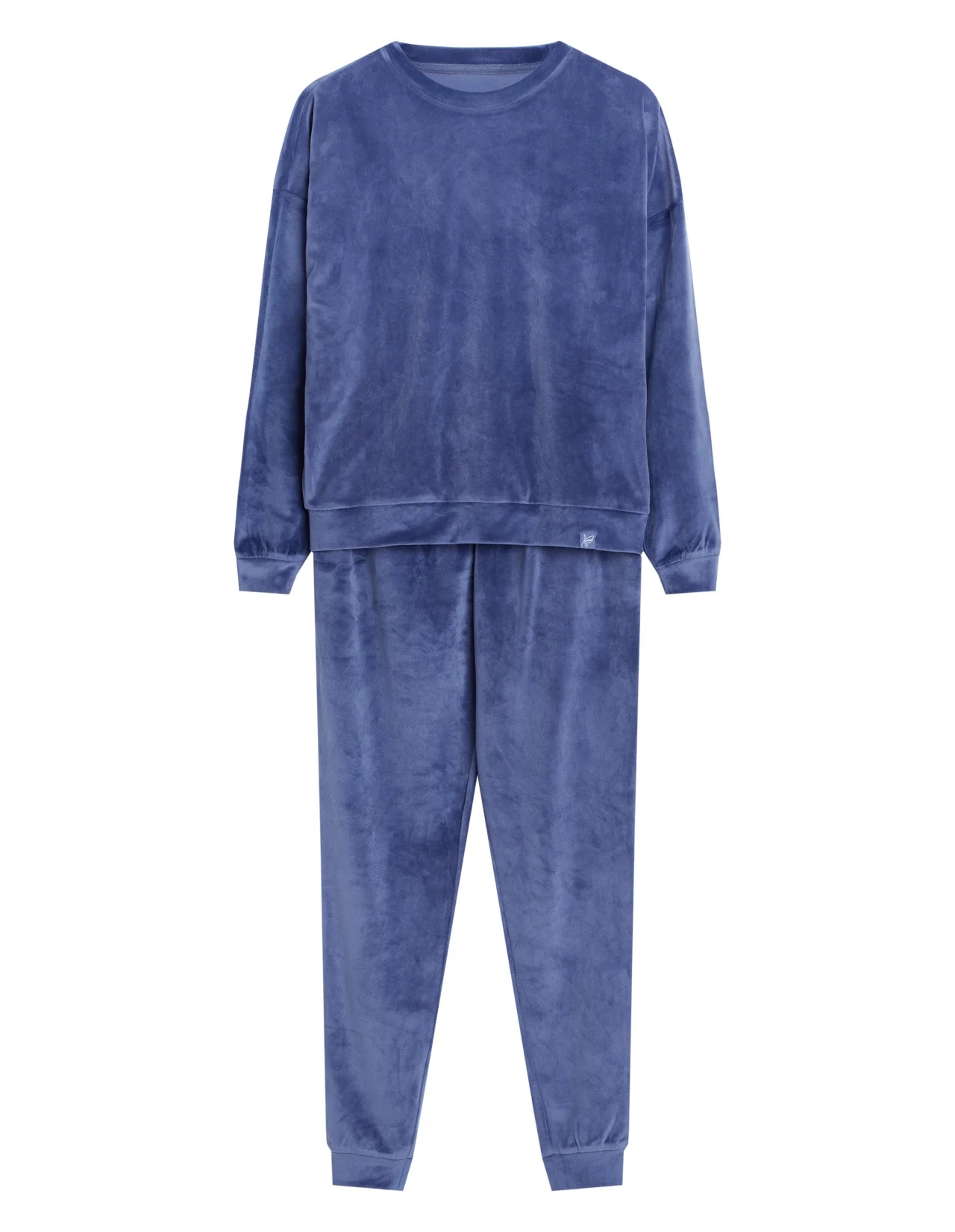 Damski, welurowy dres o luźnym i wygodnym kroju. Bluza z długim rękawem i okrągłym dekoltem, spodnie długie, jednolite. Dół bluzy, rękawy oraz nogawki zakończone ściągaczem. Idealny do codziennego wypoczynku i domowego komfortu.