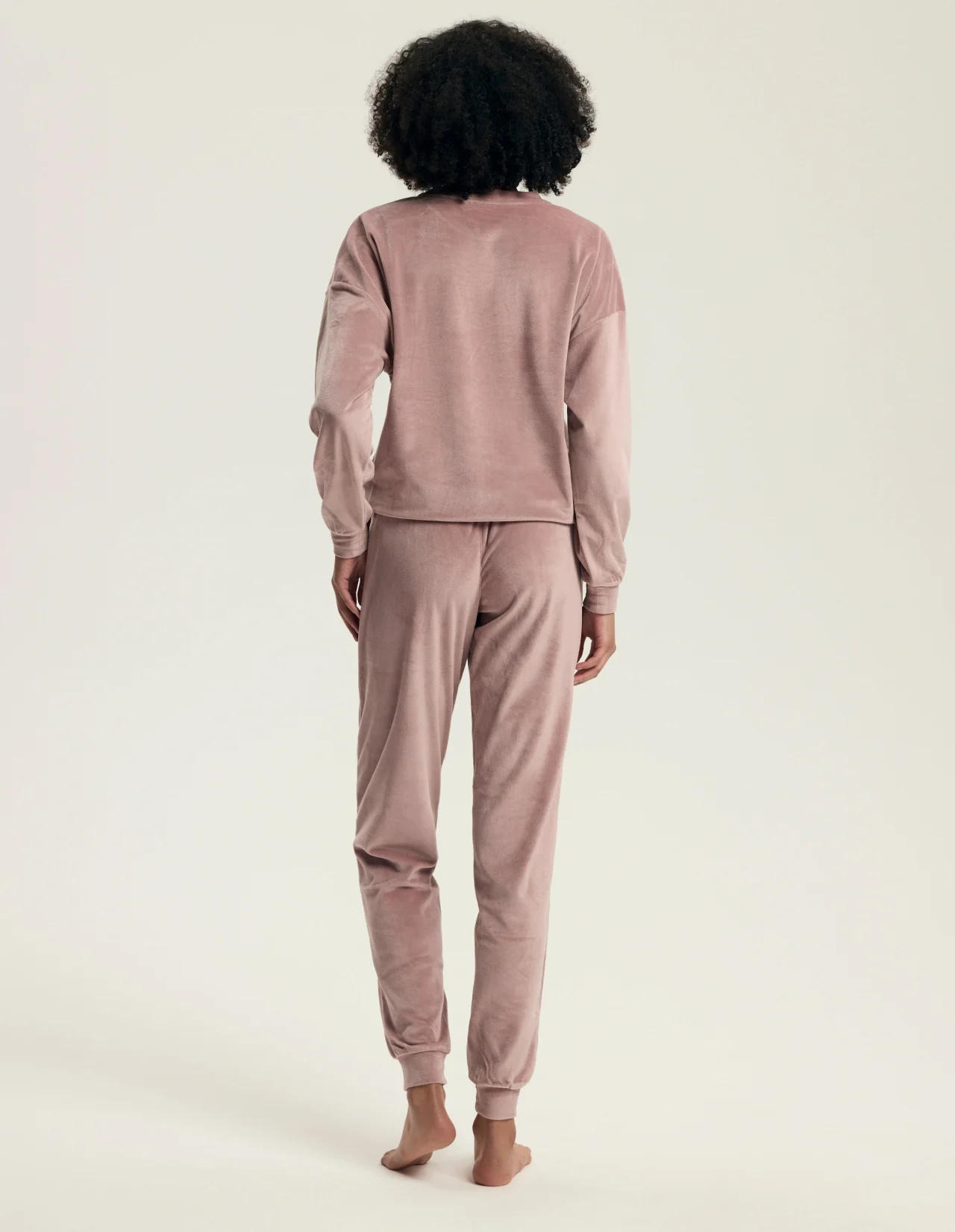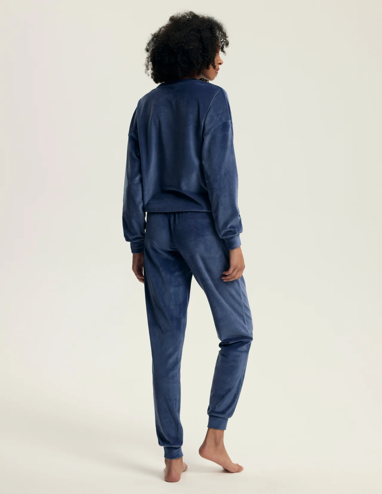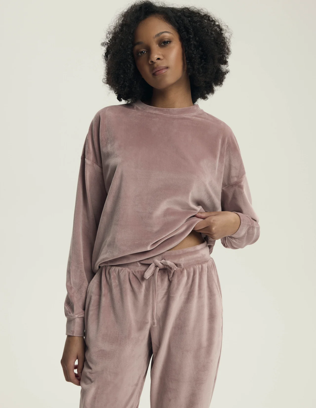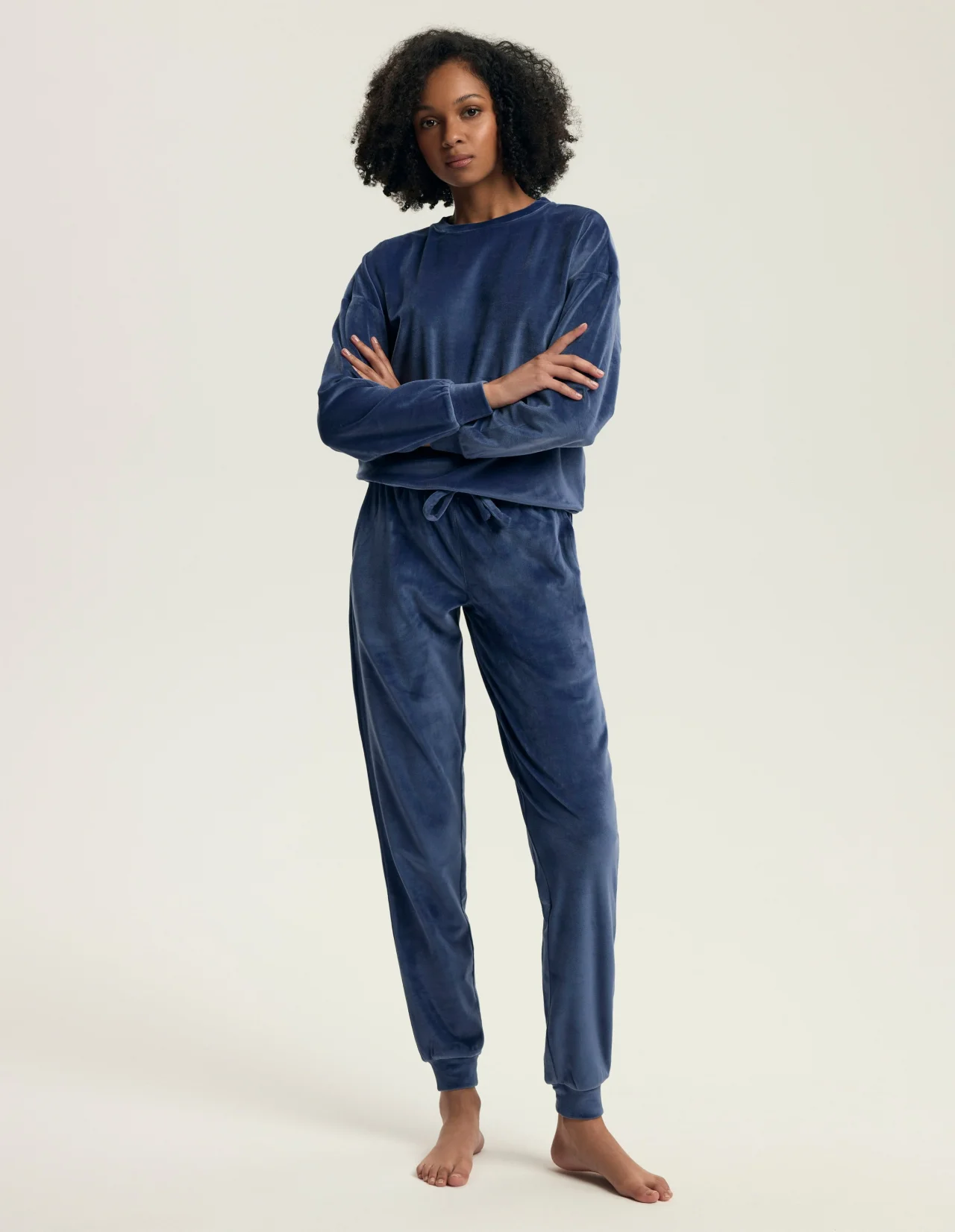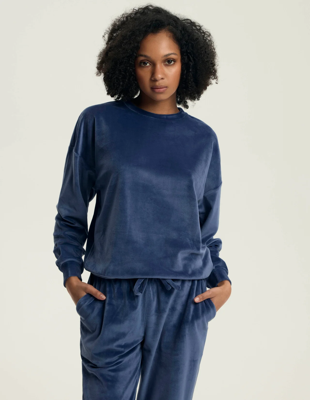 Damski, welurowy dres o luźnym i wygodnym kroju. Bluza z długim rękawem i okrągłym dekoltem, spodnie długie, jednolite. Dół bluzy, rękawy oraz nogawki zakończone ściągaczem. Idealny do codziennego wypoczynku i domowego komfortu.