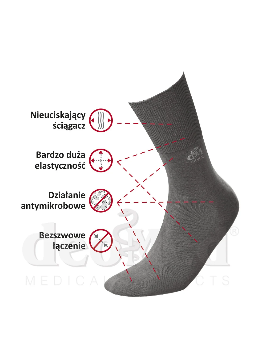 Skarpetki zdrowotne z jonami srebra - bezuciskowa cholewka - bezszwowe łączenia nad palcami gwarantują maksymalny komfort użytkowania - zawartość jonów srebra w przędzy Prolen Siltex hamuje rozwój mikrobów i zapobiegaja przykremu zapachowi podczas noszenia - zapewniaja skuteczne działanie antygrzybiczne i antybakteryjne   Skład: 72% bawełna, 25% prolen siltex (polipropylen), 3% elastan