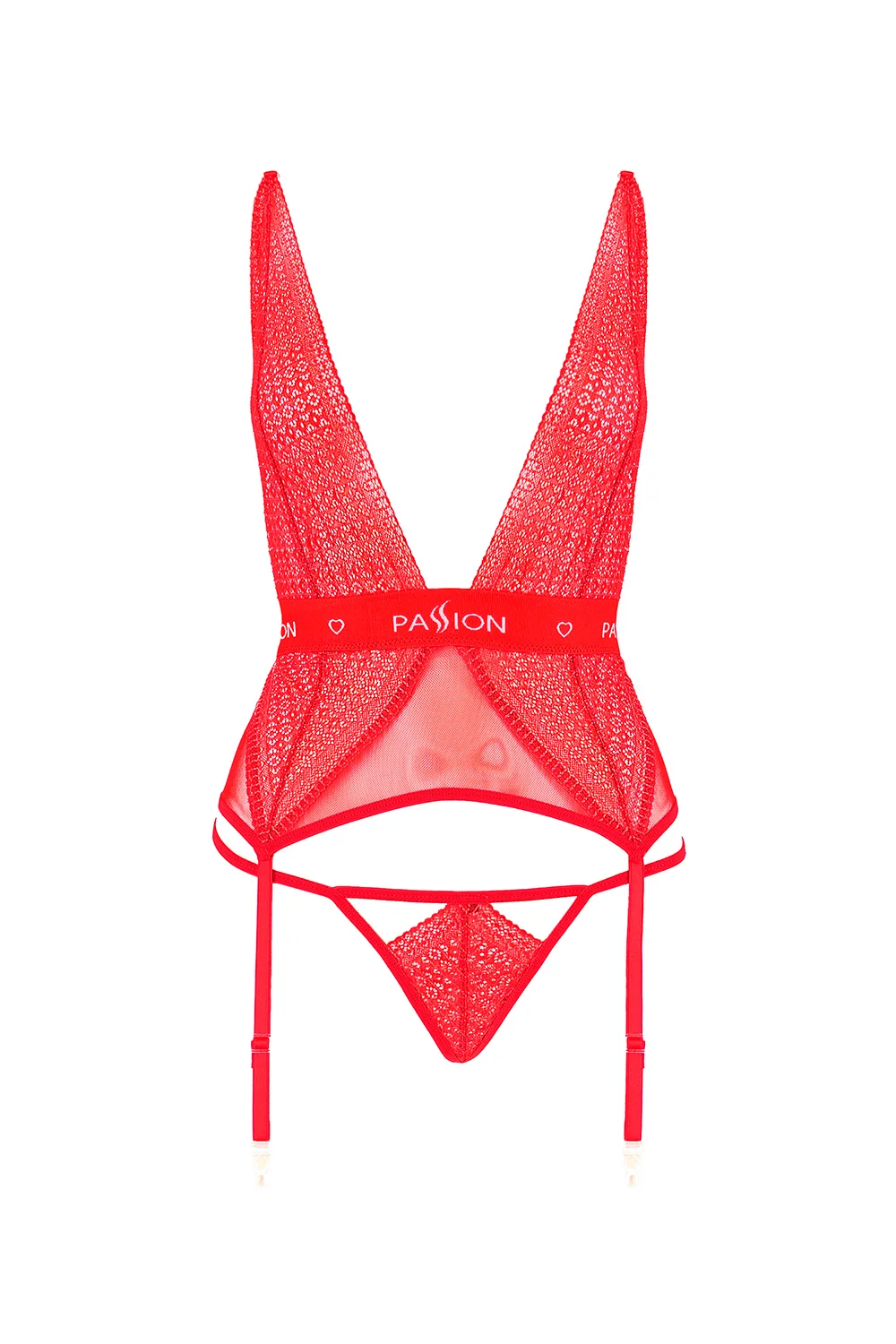 • Gorset marki Passion. Model Mirajane corset. Produkt został wykonany z 75% poliester, 15% poliamid, 10% elastan. Miejsce zapięcia: tył. Produkt posiada regulowane ramiączka. Troczki są regulowane. Produkt damski. Pas z troczkami. Gorset zapinany na haftki. Majtki biodrówki.