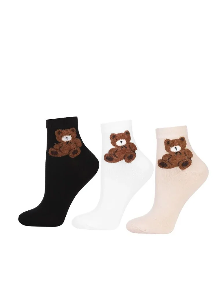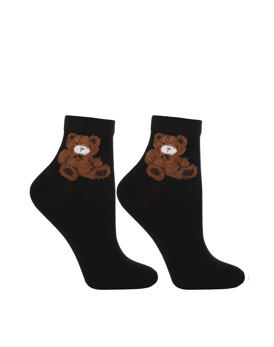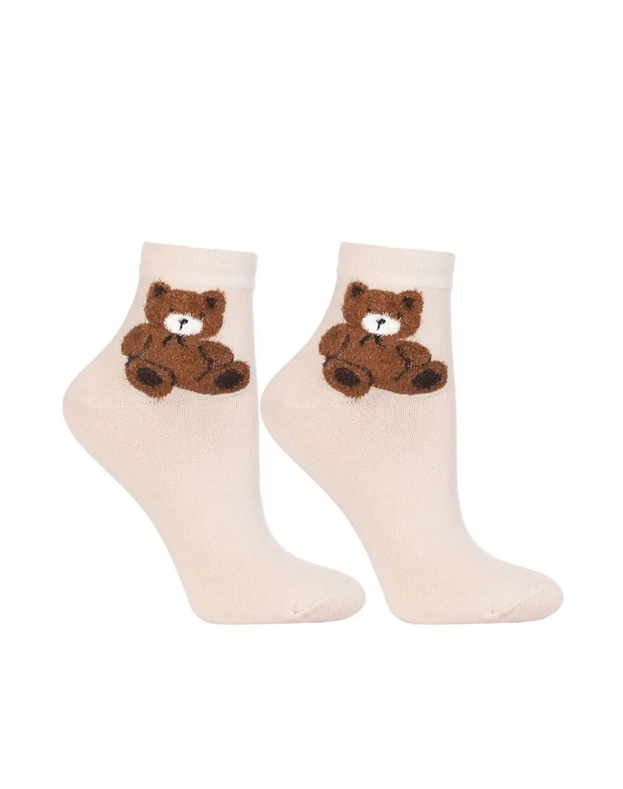Skarpetki damskie - wykonane z wysokiej jakości bawełny - ozdobiona wzorem z puchatym misiem - doskonale sprawdzą się w codziennych stylizacjach - idealnie dopasowują się do stóp - zapewniają wysoki komfort noszenia - dostępne kolory: ecru, beżowy, czarny - wybierane losowo Skład: 65% bawełna, 25% poliester, 5% poliamid, 5% elastan