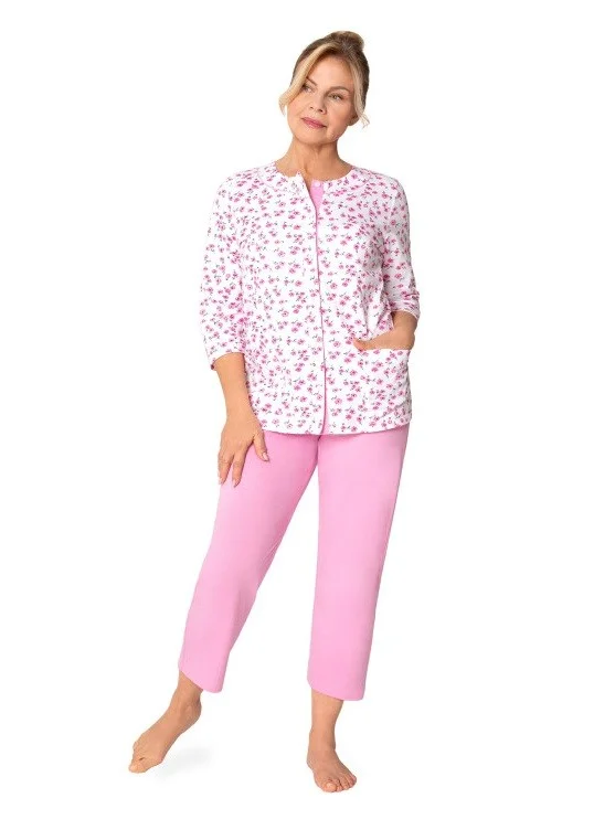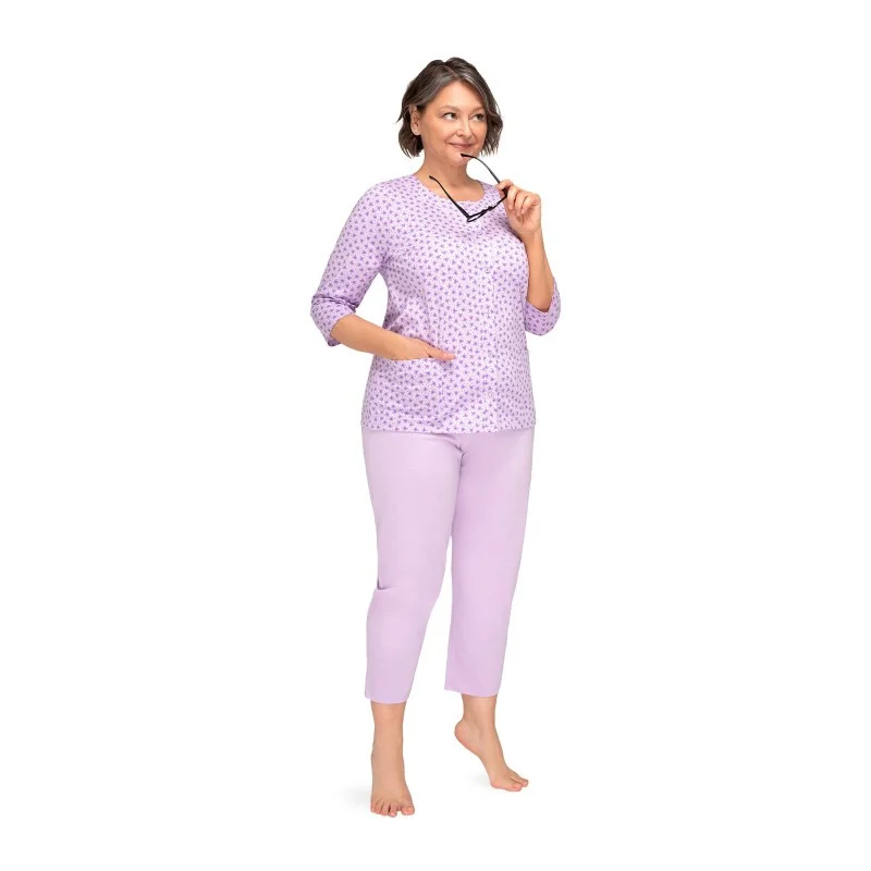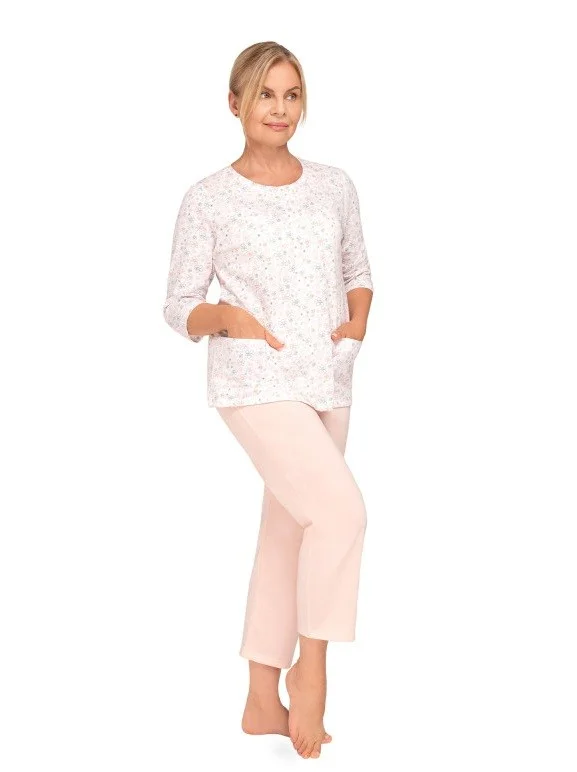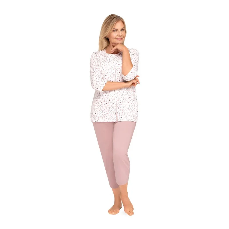 Piżama damska w listki Martel Maria II 201 3/4, jest wykonana z naturalnych materiałów. Miękki i przyjemny w dotyku materiał nie krępuje ruchów i gwarantuje komfort podczas chodzenia i spania. Zaprojektowana długość 3/4, zarówno nogawek jak i rękawów, pozwala na utrzymanie optymalnej temperatury ciała o każdej porze roku. Piżama Maria II, posiada górną część w drobny i delikatny print w formie listków. Bluza posiada łódkowe wykończenie pod szyją i zapięcie zasłonięte plisą. Całość tworzy przyjemny i bardzo komfortowy komplet do spania.