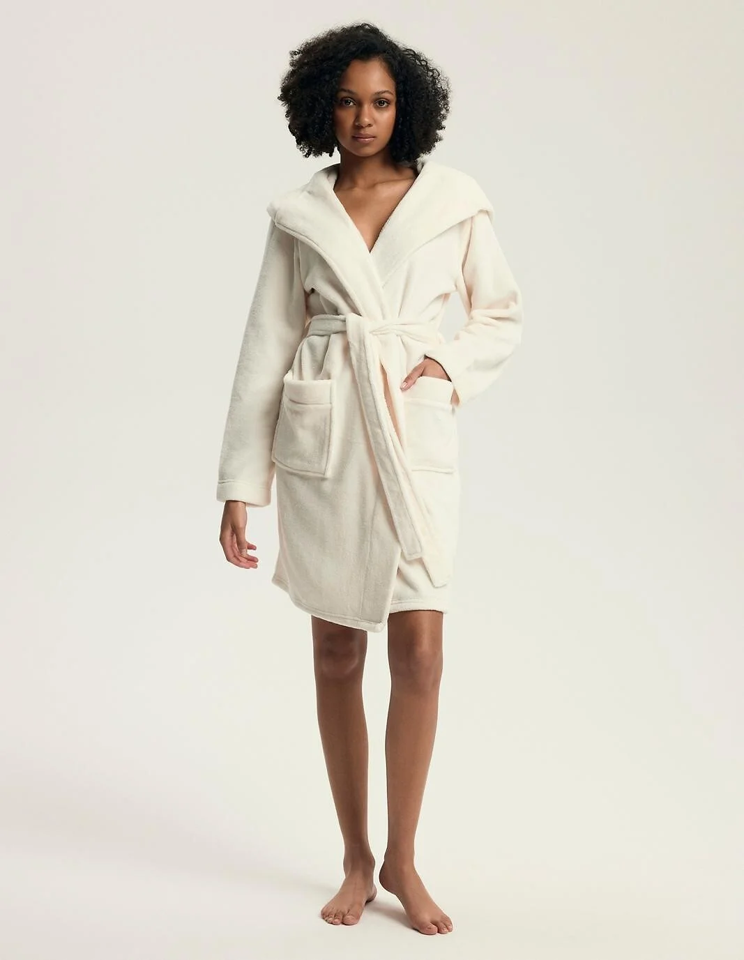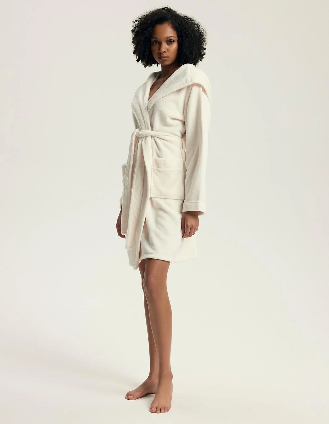 Szlafrok damski z kapturem - miękka, cieńsza dzianina typu soft - długi rękaw - wiązany w pasie, z kieszeniami - długość przed kolano    Skład: 100% poliester