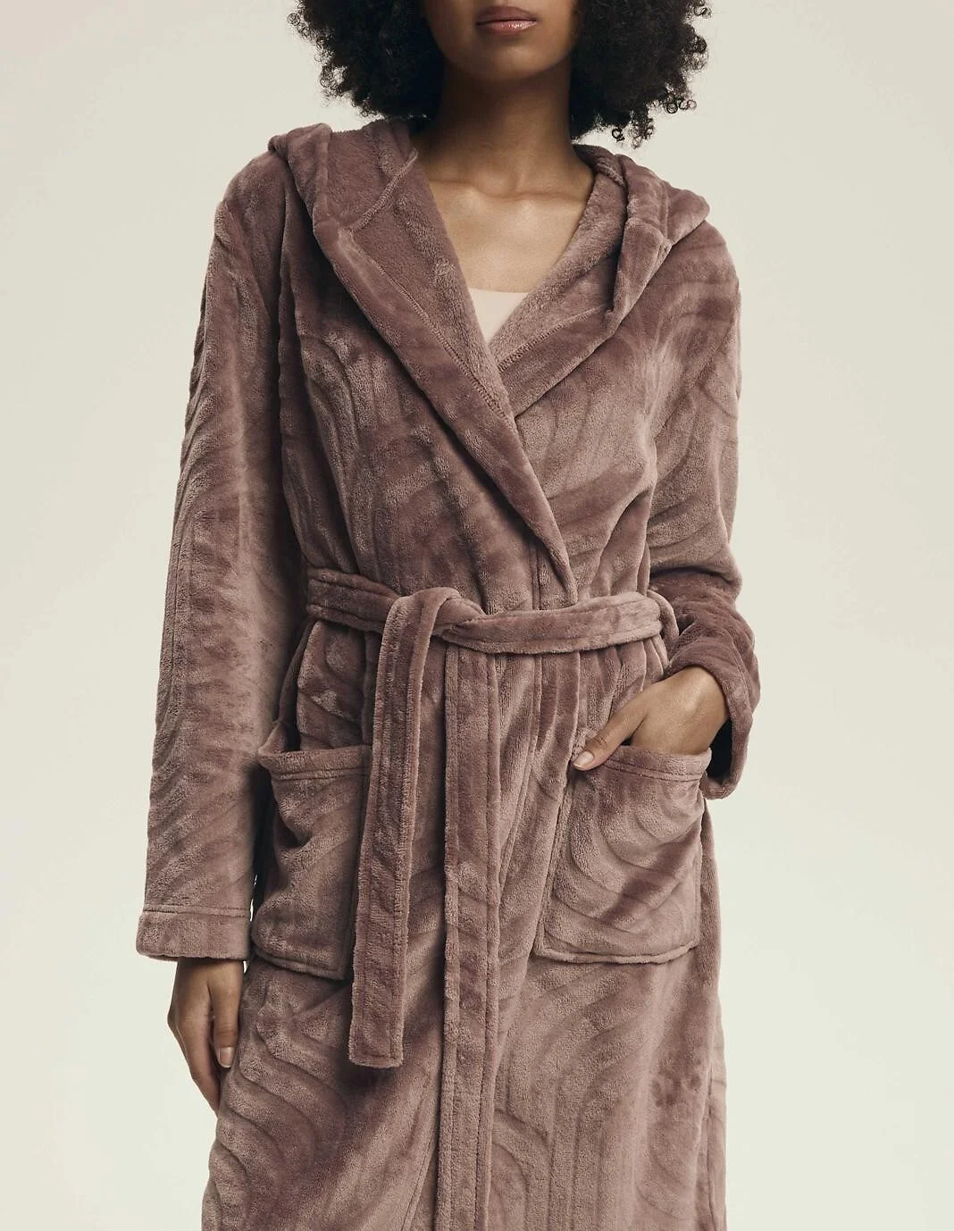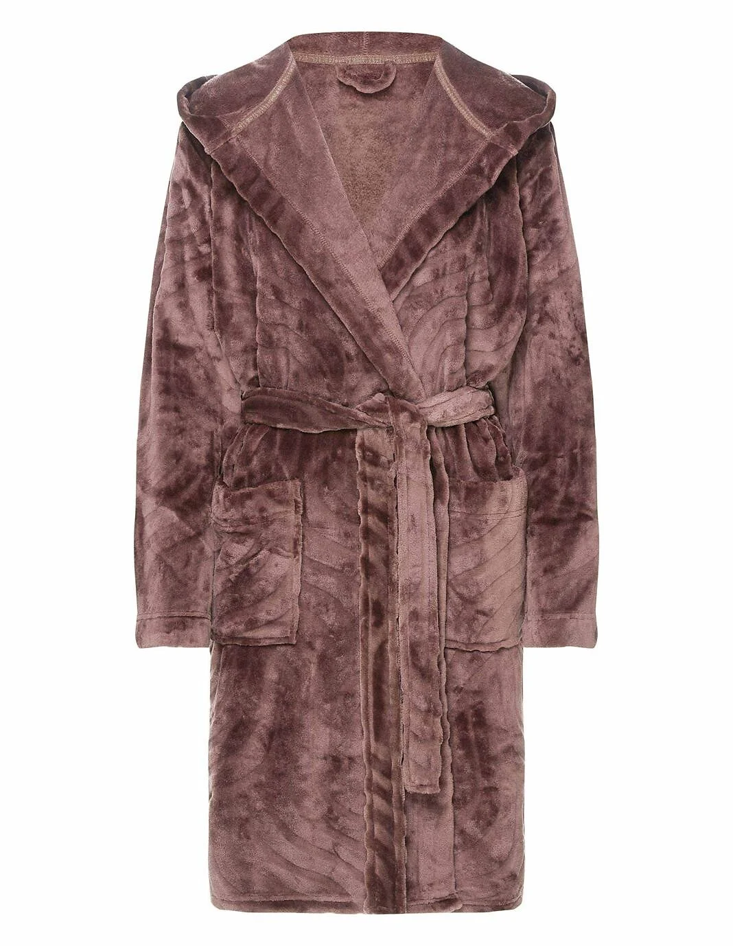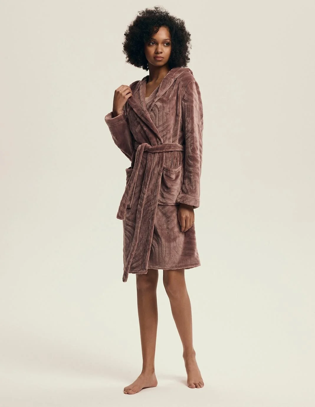 Krótki szlafrok damski z kapturem - miękka, ciepła dziania - geometryczny, wytłaczany wzór - długi rękaw - wiązany w pasie, z kieszeniami   Skład: 100% poliester