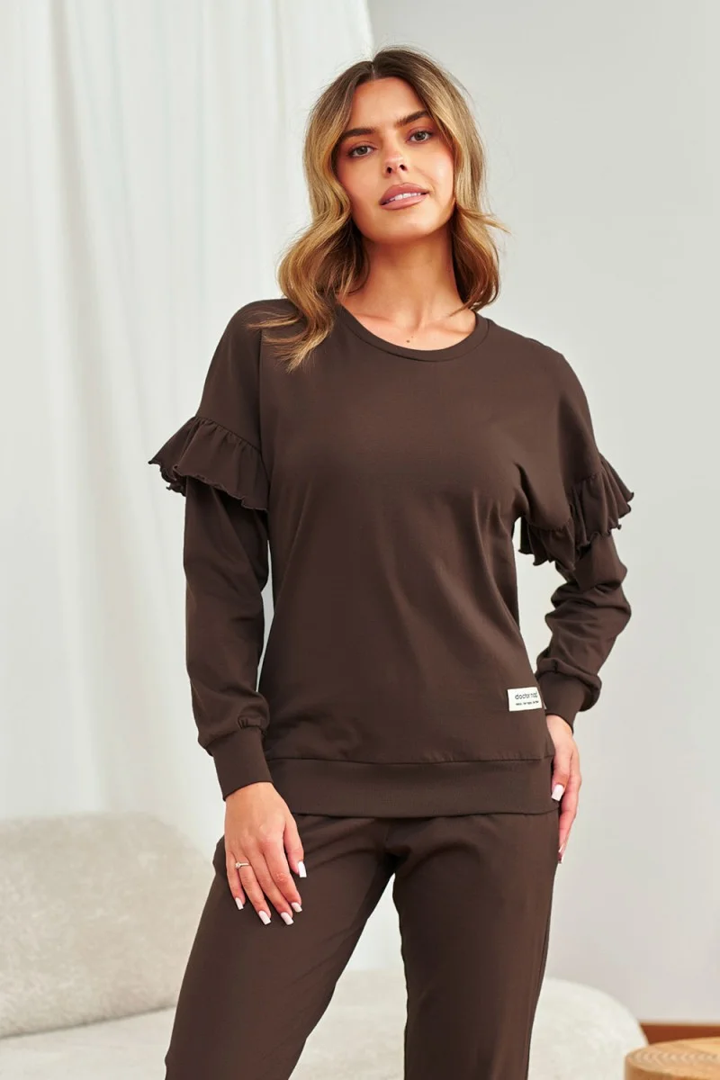 Brązowy komplet damski z falbankami - kobiecy twist na domowy relaks Ten komplet to idealne połączenie komfortu z subtelną kobiecością. Klasyczna forma została przełamana delikatnymi falbankami na rękawach, które dodają uroku i wyróżniają ten model spośród innych domowych stylizacji. Wygodna bluza z długim rękawem i spodnie z nogawkami zakończonymi ściągaczem tworzą spójny, a zarazem stylowy zestaw - idealny na leniwe poranki, spokojne wieczory i cały dzień w domowym rytmie. Komplet został uszyty z miękkiej, 100% bawełnianej dzianiny, która jest przyjemna dla skóry i oddychająca - zapewnia komfort zarówno podczas snu, jak i codziennego odpoczynku. To zestaw, który z powodzeniem zastąpi zarówno piżamę, jak i domowy dres. Cechy produktu: 100% dzianina bawełniana - naturalna, oddychająca, miękka Falbanki na rękawach - kobiecy i oryginalny akcent Elastyczne ściągacze przy rękawach i nogawkach - wygodne dopasowanie Spodnie z praktycznymi kieszeniami Wyprodukowany w Polsce - gwarancja lokalnej jakości Komplet idealny dla kobiet, które chcą połączyć wygodę z dziewczęcym stylem - bez względu na porę dnia.