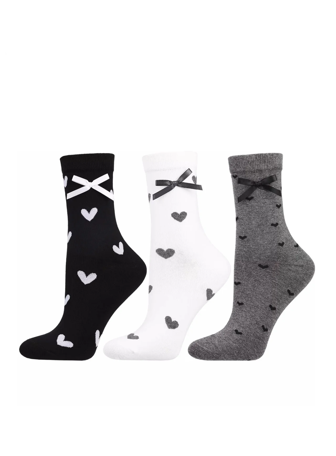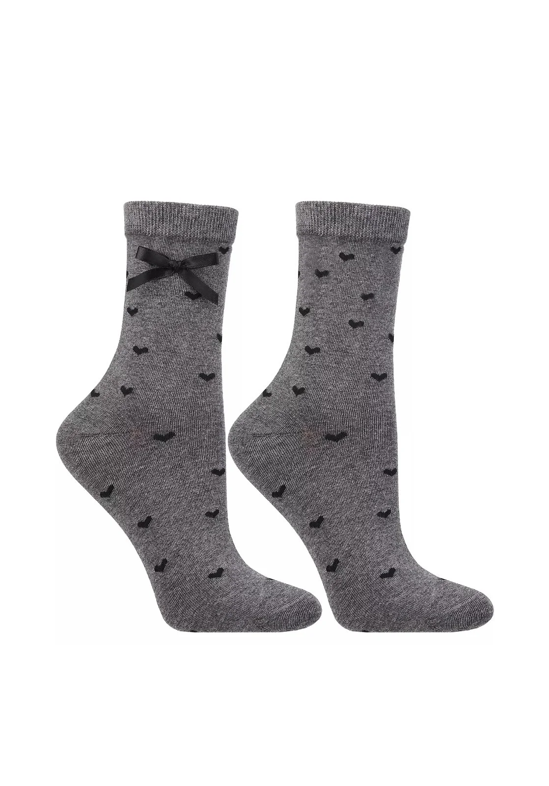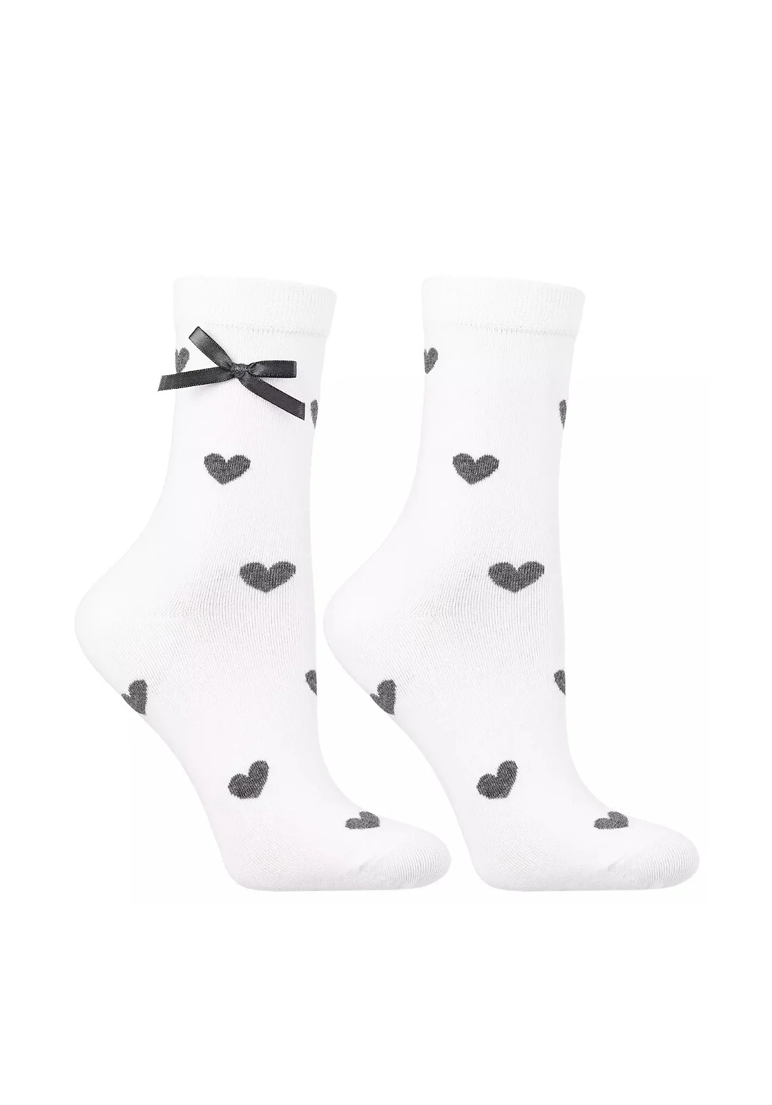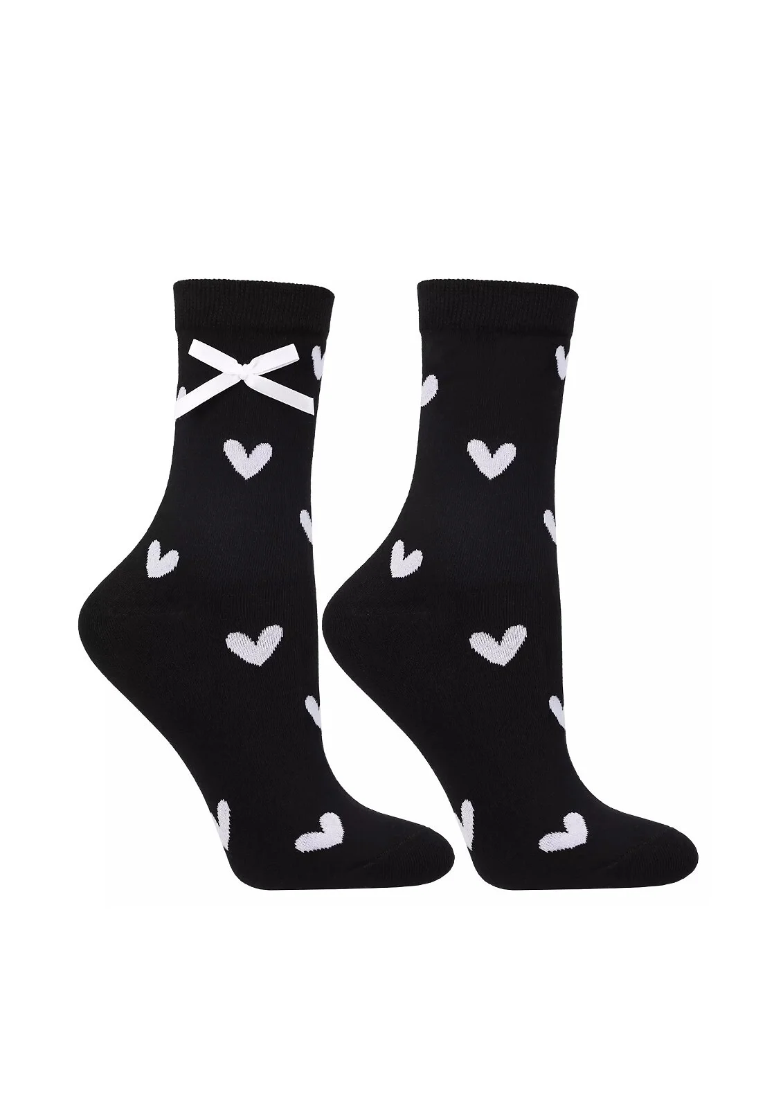 Skarpety damskie - wysokiej jakości bawełna - ozdobione wzorem w serca i kokardką - wygodny ściągacz - dostępne kolory wybierane losowo: biały, czarny, grafitowy Skład: 69% bawełna, 28% poliamid, 3% elastan