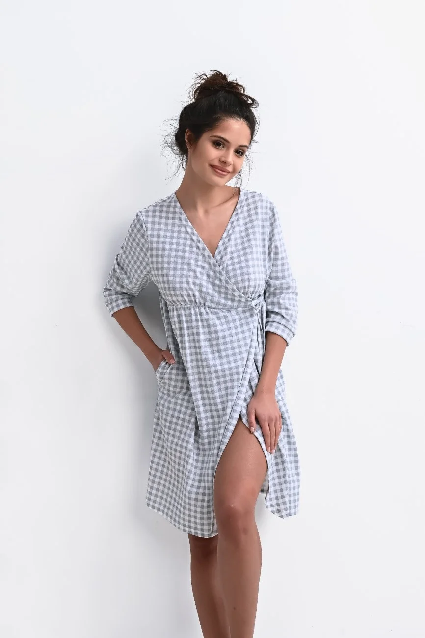 Cienki szlafrok dla kobiet w ciąży i mam karmiących z wysokiej jakości bawełny z rękawem 3/4 pod linią biustu delikatnie marszczony kieszenie