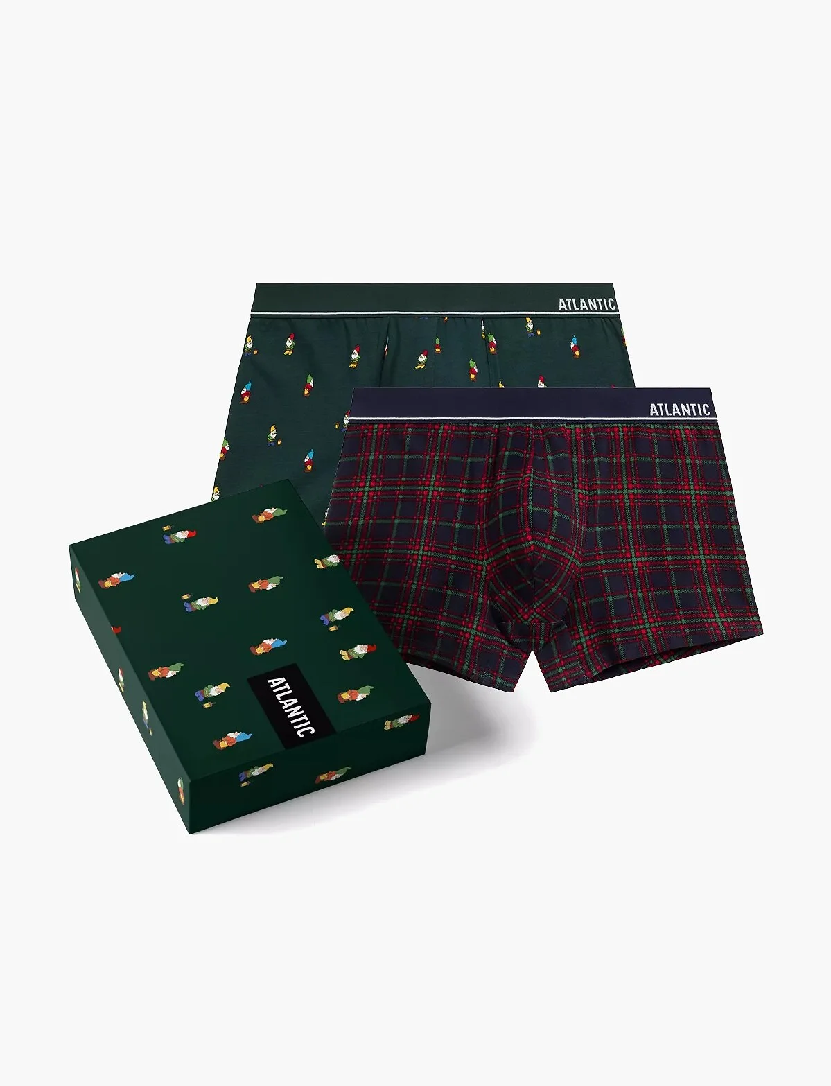 Bokserki męskie - wysokiej jakości bawełna - ozdobione kolorowym wzorem - w pasie szeroka guma z napisem "ATLANTIC" - pakowane w pudełko po dwie sztuki   Skład: 95% bawełna, 5% elastan