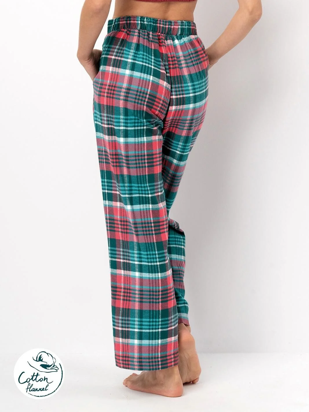 Damskie spodnie piżamowe o prostym i wygodnym kroju, uszyte z miękkiej, ciepłej flaneli w kratę. Posiadają praktyczne kieszenie po bokach oraz ozdobne zaszewki z przodu, które zapewniają swobodę ruchów. W pasie elastyczna guma obszyta bawełną — przód gładki, tył delikatnie marszczony. Idealne na chłodniejsze noce i domowy relaks.