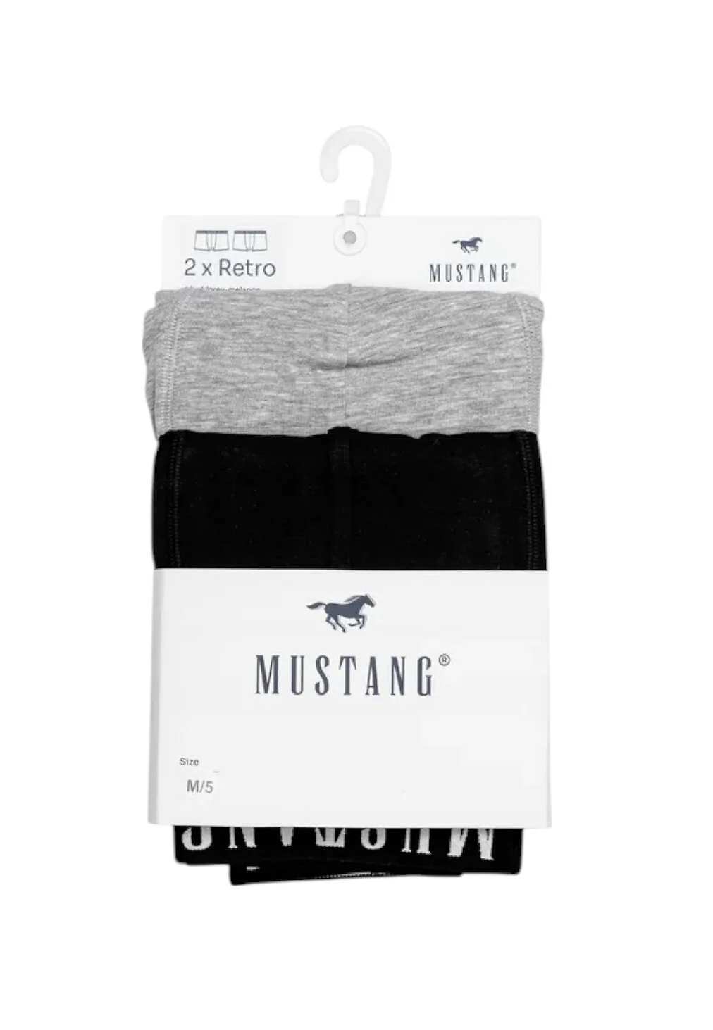 Bokserki męskie - z wysokiej jakości bawełny - w pasie szeroka, wygodna guma z logo marki MUSTANG - płaskie szwy sprawiają, że bielizna w żaden sposób nie krępuje ruchów - pakowane po dwie sztuki Skład: kolor czarny 95% bawełna, 5% elastan; kolor szary 90% bawełna, 5% wiskoza, 5% elastan