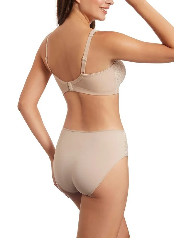 Biustonosz typu soft, bez fiszbin - miseczki z wytłaczanym wzorem - wewnętrzna strona z miłej dla ciała tkaniny - szersze ramiączka z regulacją - obwód z gładkiej mikrofibry, bez bocznej fiszbiny - zapięcie na dwie haftki z czterostopniową regulacją obwodu Skład: 82% poliamid, 18% elastan