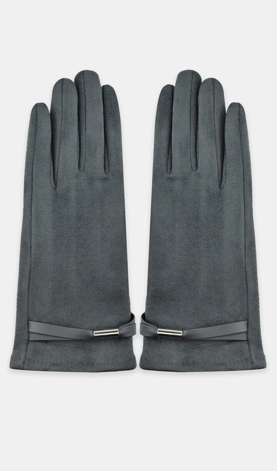 Rękawiczki damskie - palczaste - gładkie, jednolite - wykonane z miłego materiału imitującego zamsz - nadgarstek zdobią paski z efektowna sprzączka - stylowy i funkcjonalny dodatek na chłodniejsze dni   Skład: 100% poliester