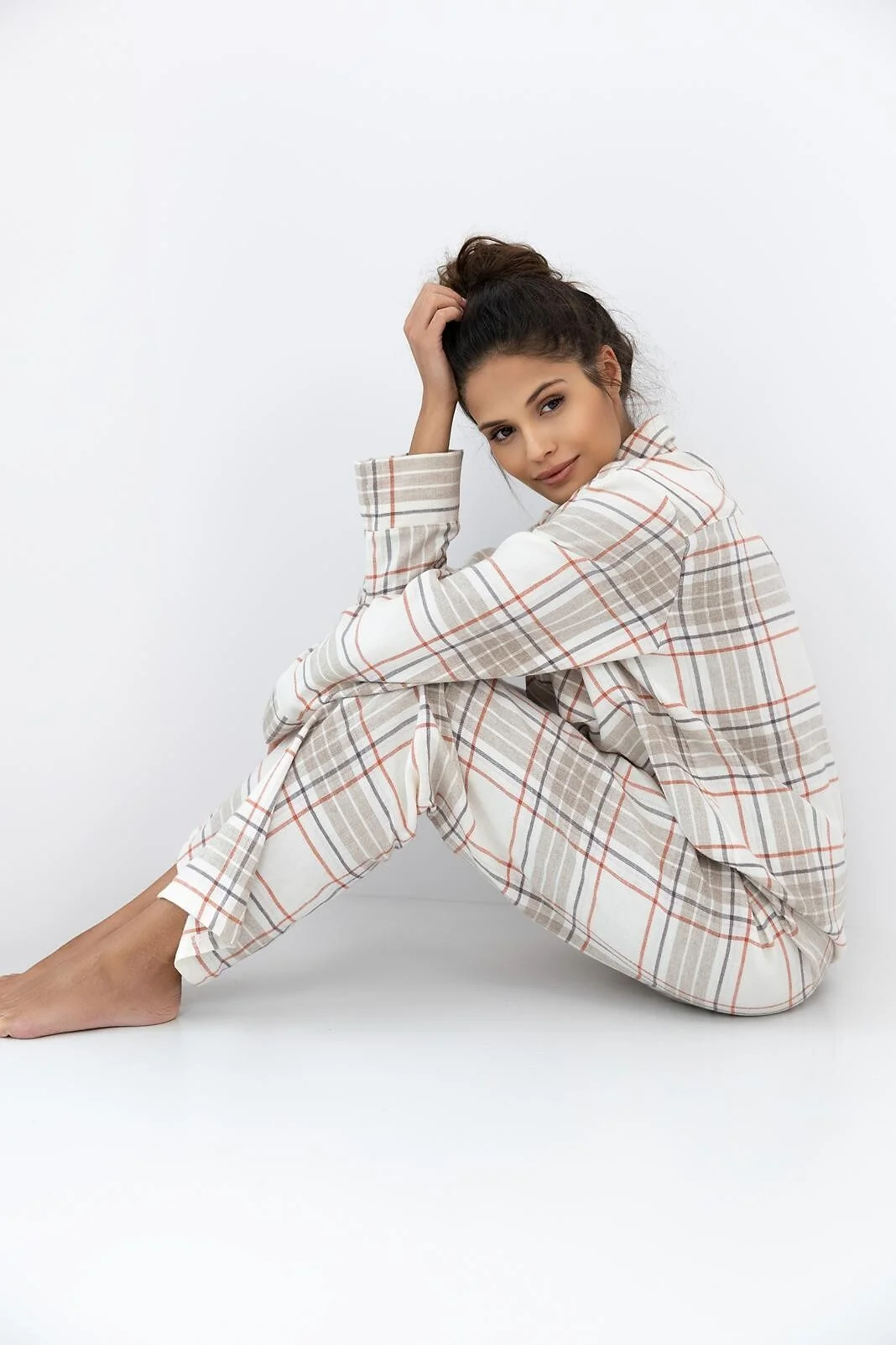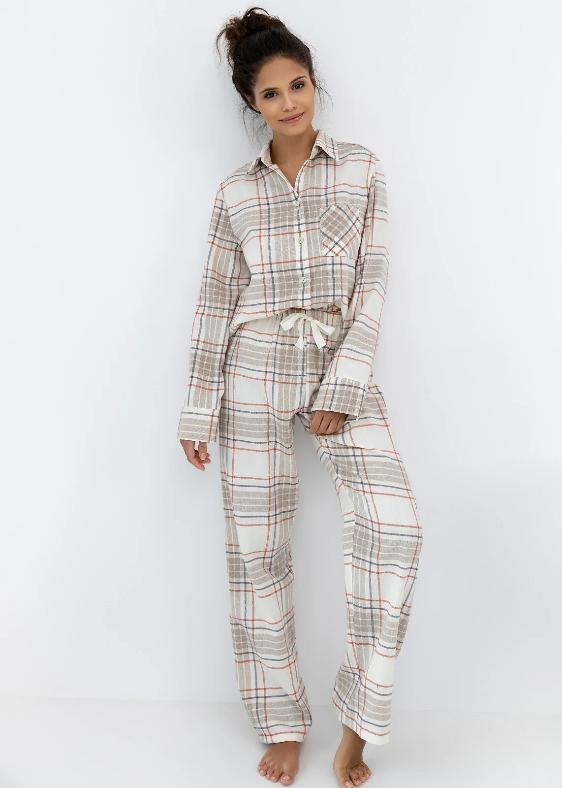 Piżama damska - wysokiej jakości bawełniana flanela - print w kratkę - bluza z długim rękawem - z kołnierzykiem, zapinana na guziki - na piersi kieszonka - długie spodnie - w pasie gumka obszyta bawełną z wiązanym troczkiem do regulacji   Skład: 90% bawełna, 10% poliester