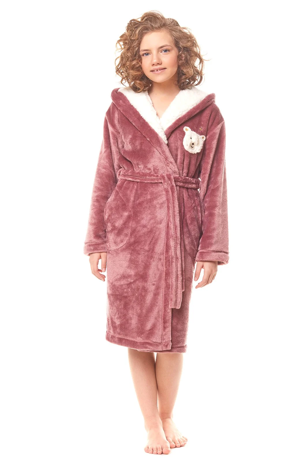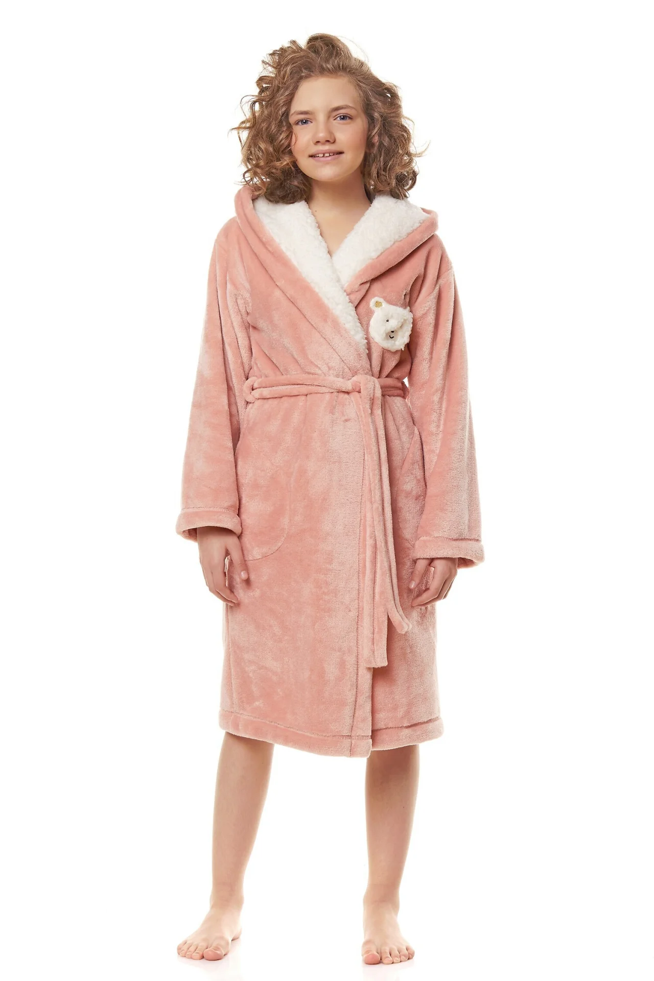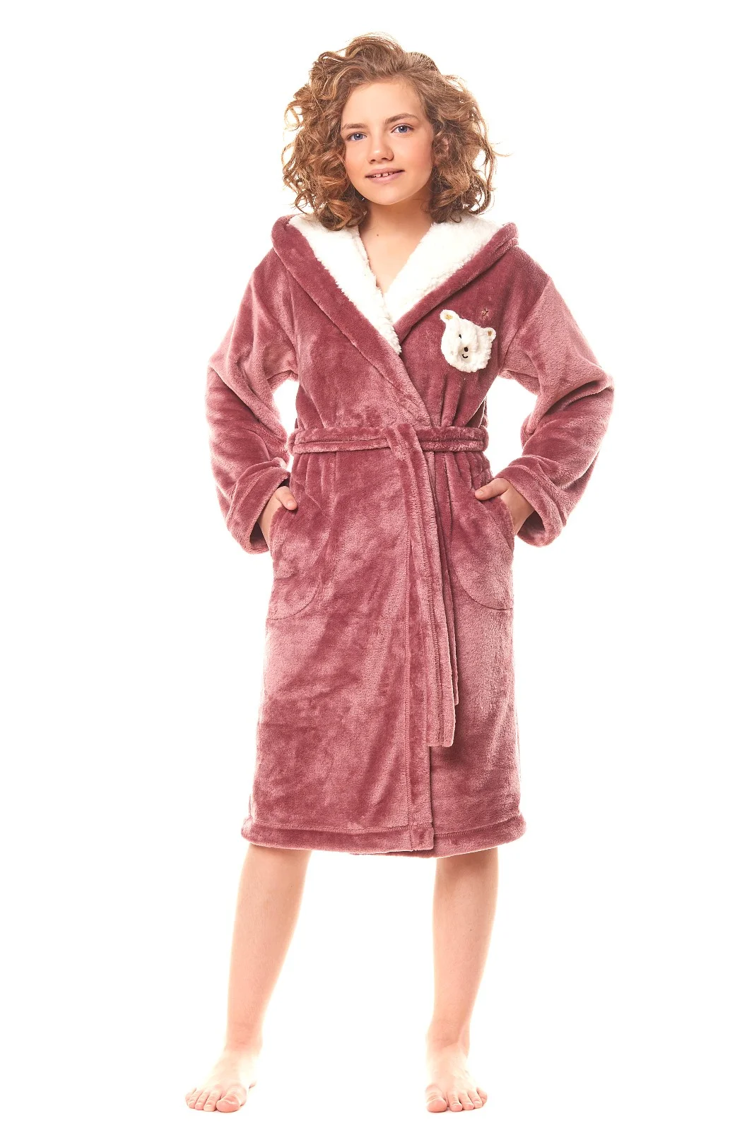 Szlafrok dziewczęcy - miła, gładka tkanina - kaptur obszyty białym futerkiem - na piersi ozdobna aplikacja z misiem - wiązany w pasie - na wysokości bioder wygodne kieszenie Skład: 100% poliester