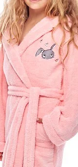 Szlafrok dziewczęcy z kapturem - miła, gładka tkanina - na piersi ozdobna aplikacja - wiązany w pasie - na wysokości bioder wygodne kieszenie   Skład: 100% poliester