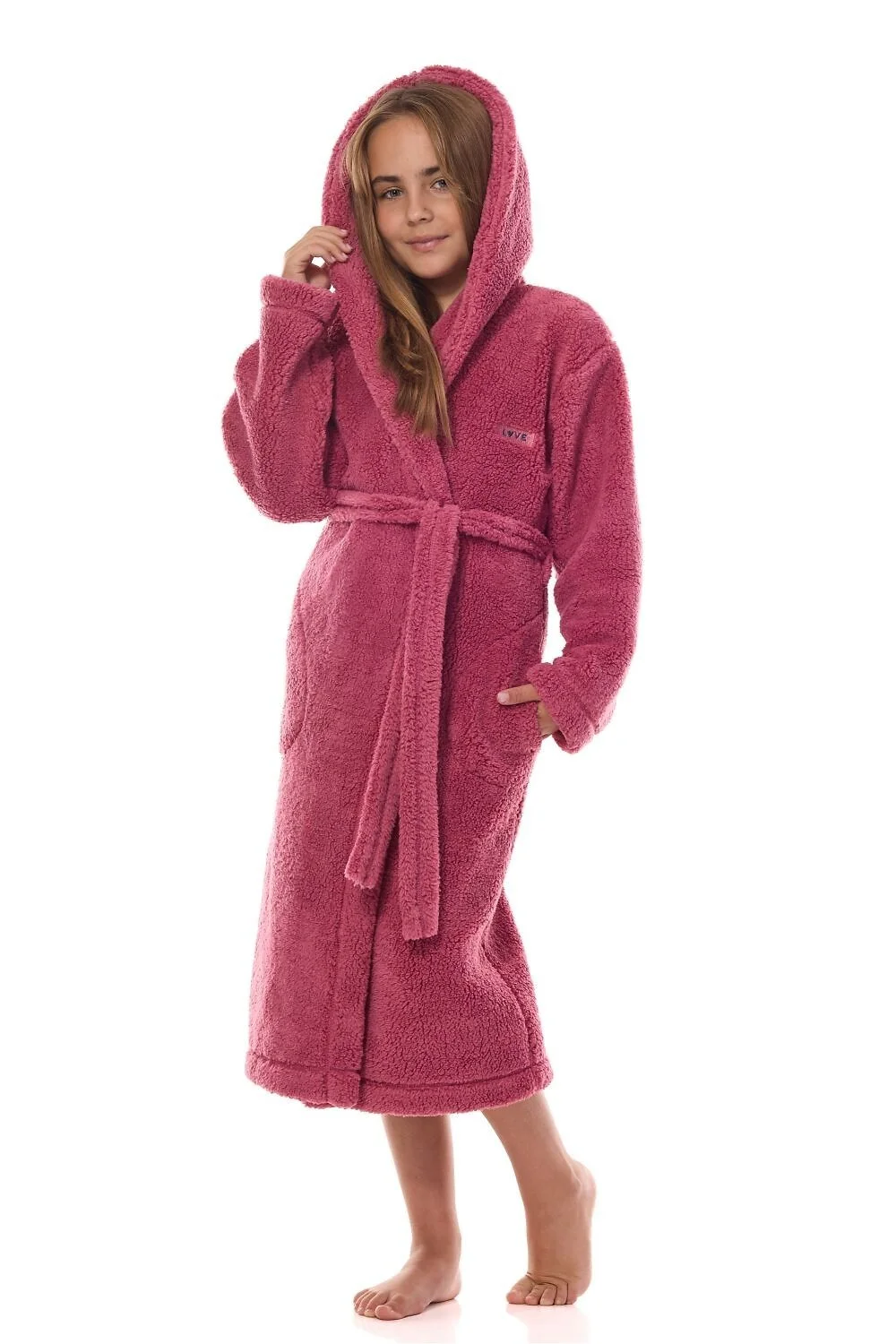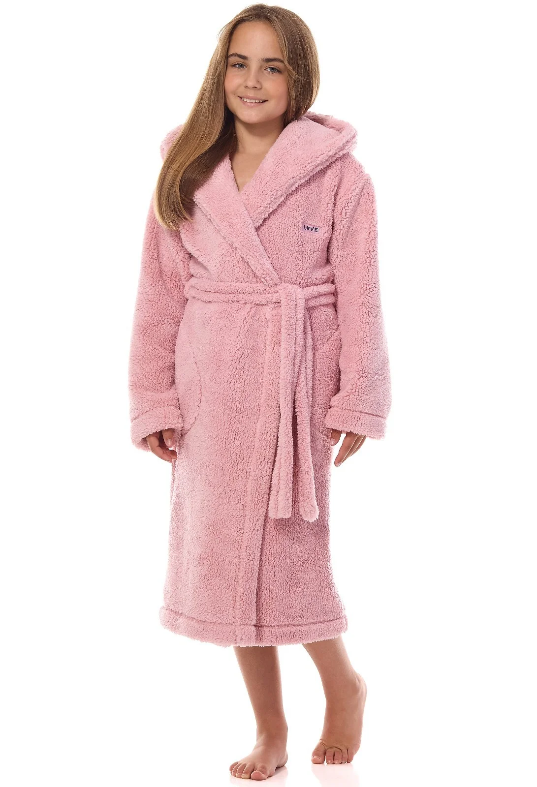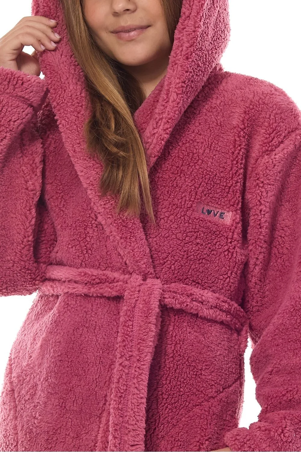 Szlafrok dziewczęcy z kapturem - miły materiał typu soft - na piersi ozdobna aplikacja z napisem LOVE - wiązany w pasie - na wysokości bioder wygodne kieszenie   Skład: 100% poliester
