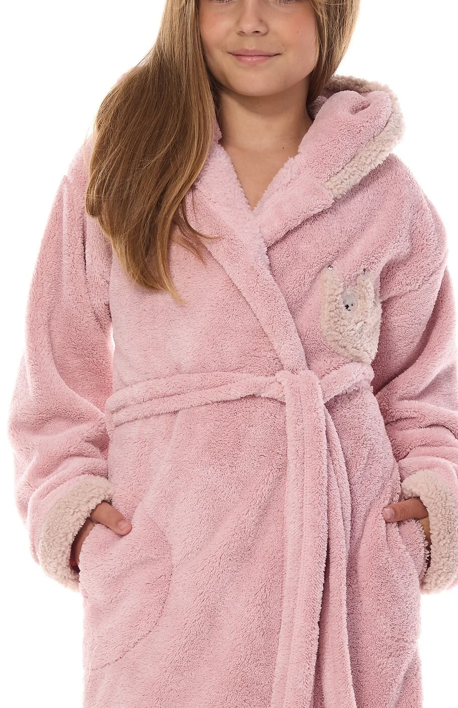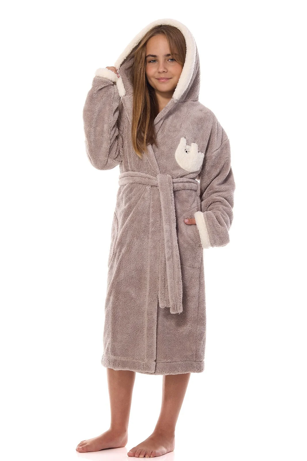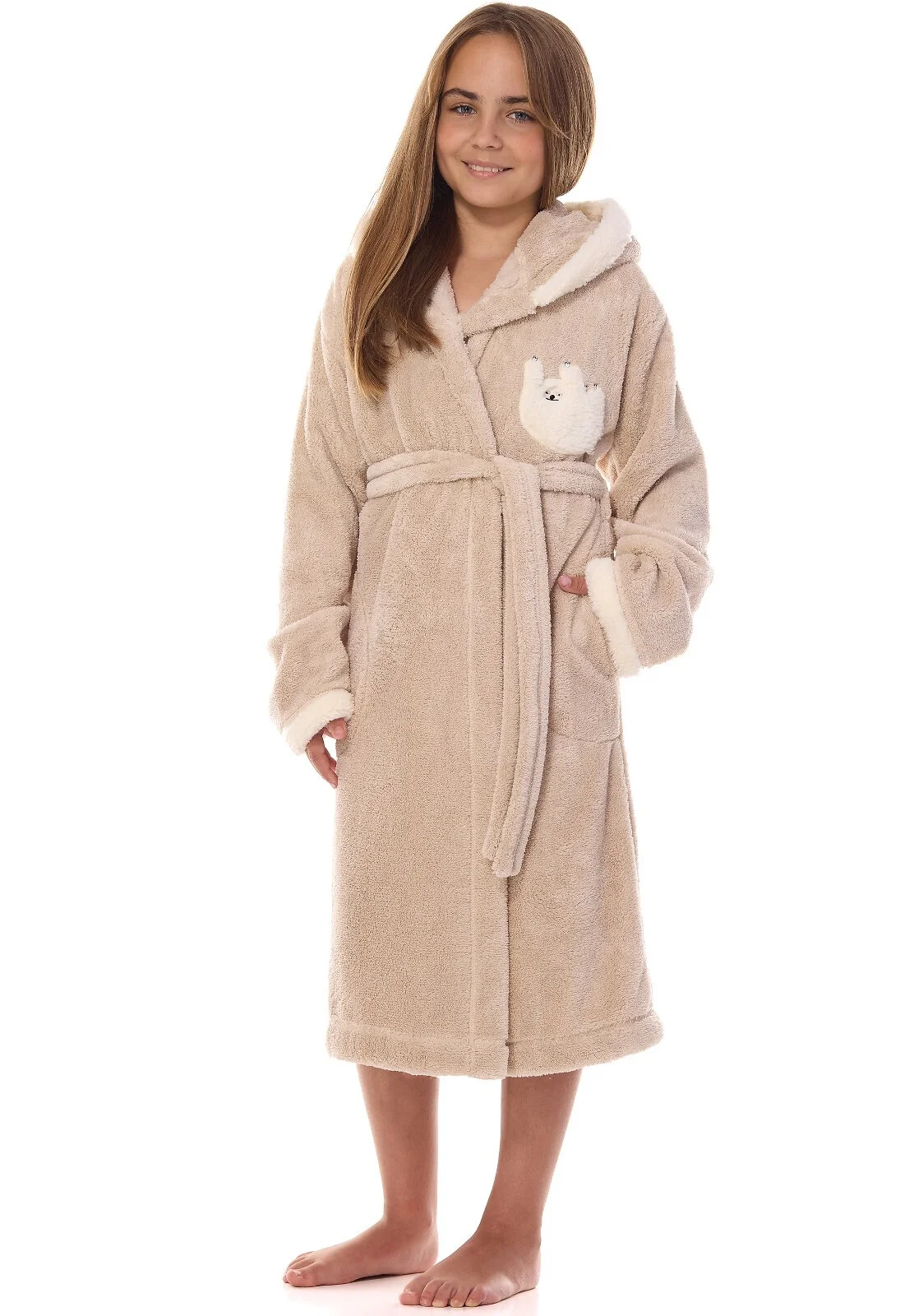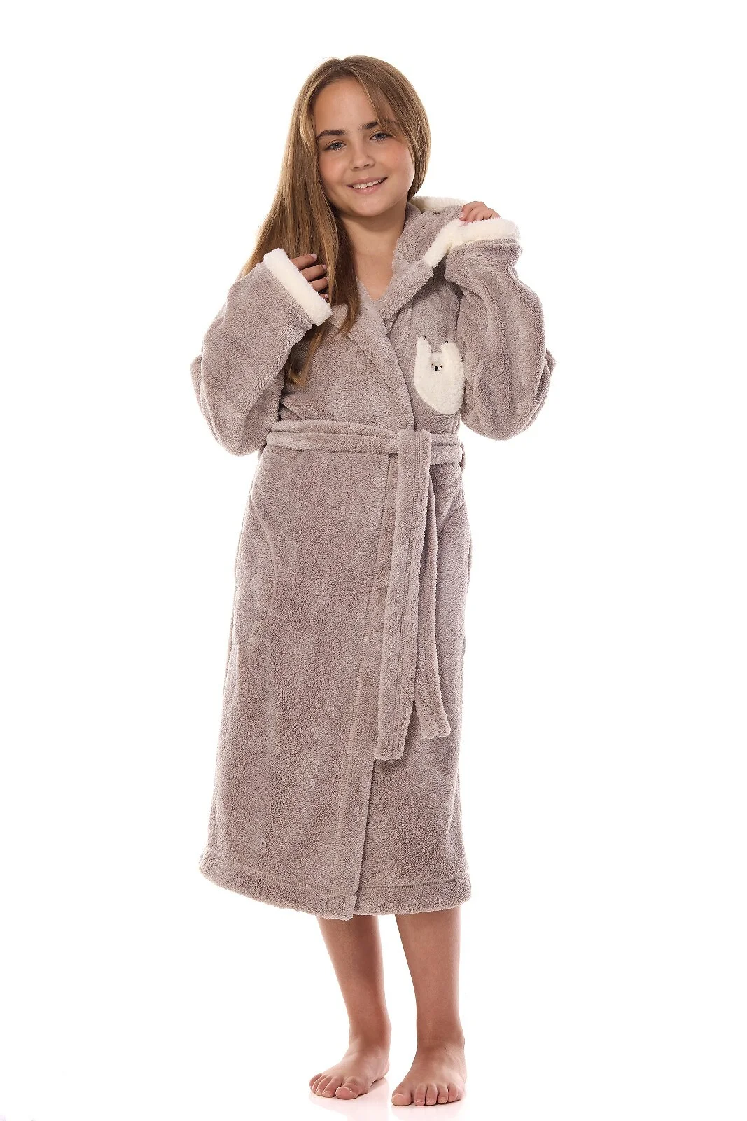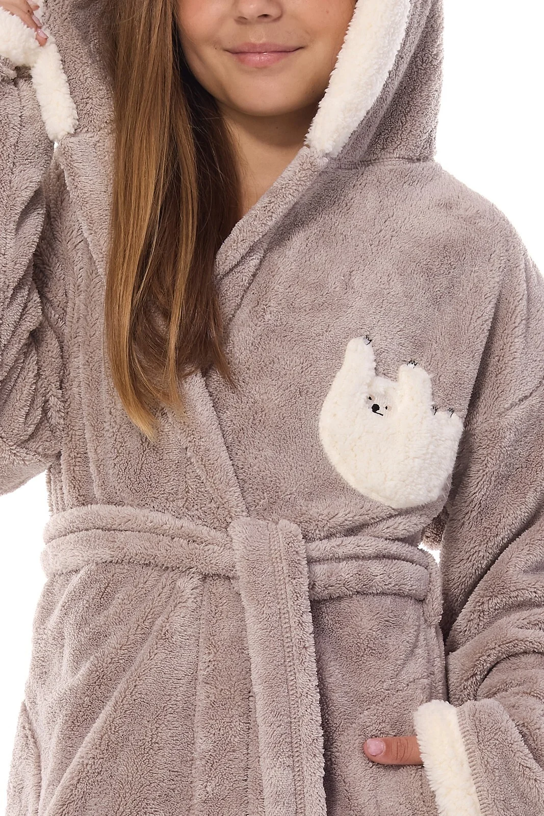 Szlafrok dziecięcy - miękka dzianina typu soft - z kapturem - na piersi puchata aplikacja z lemurem- wiązany w pasie - po bokach kieszenie   Skład: 100% poliester