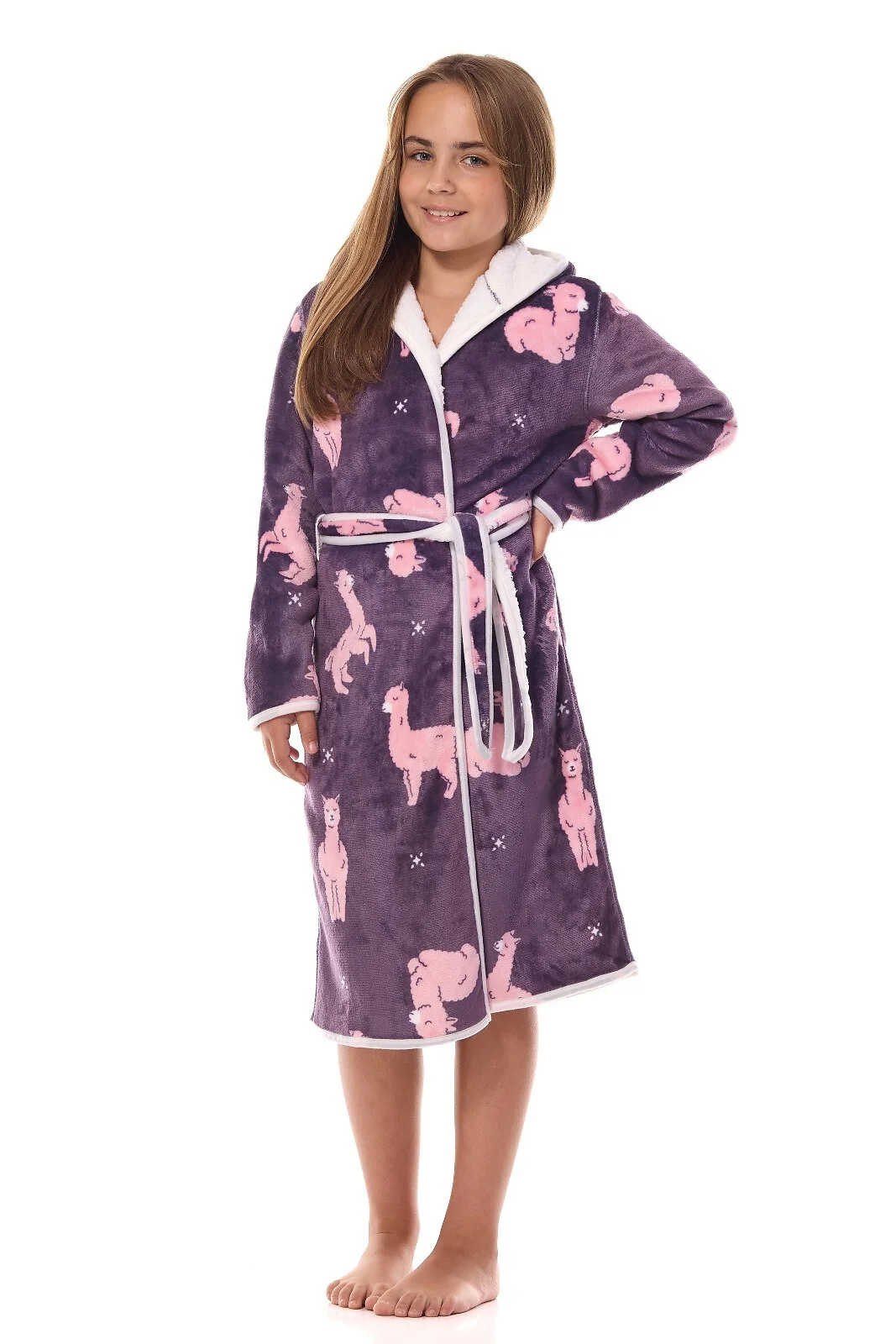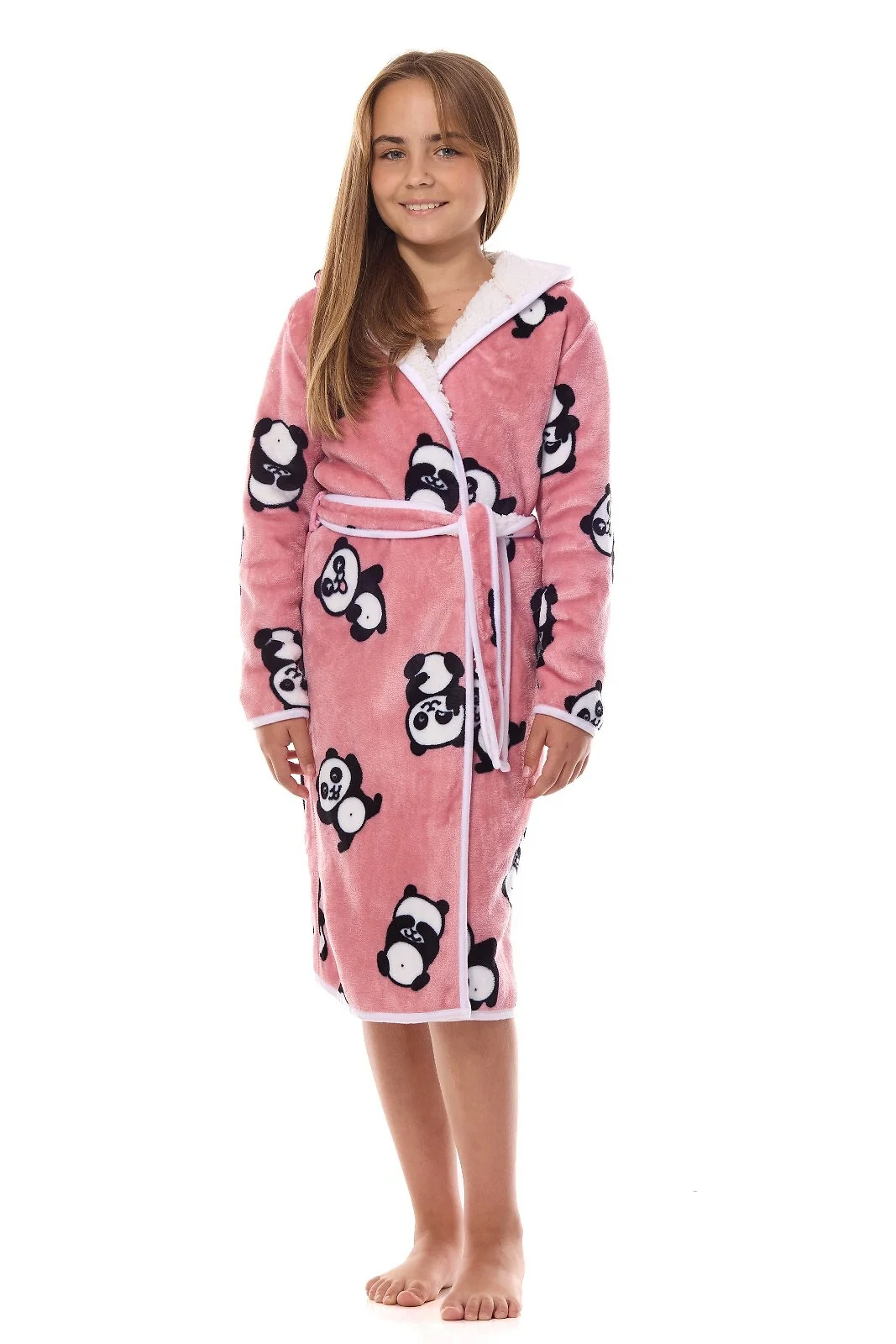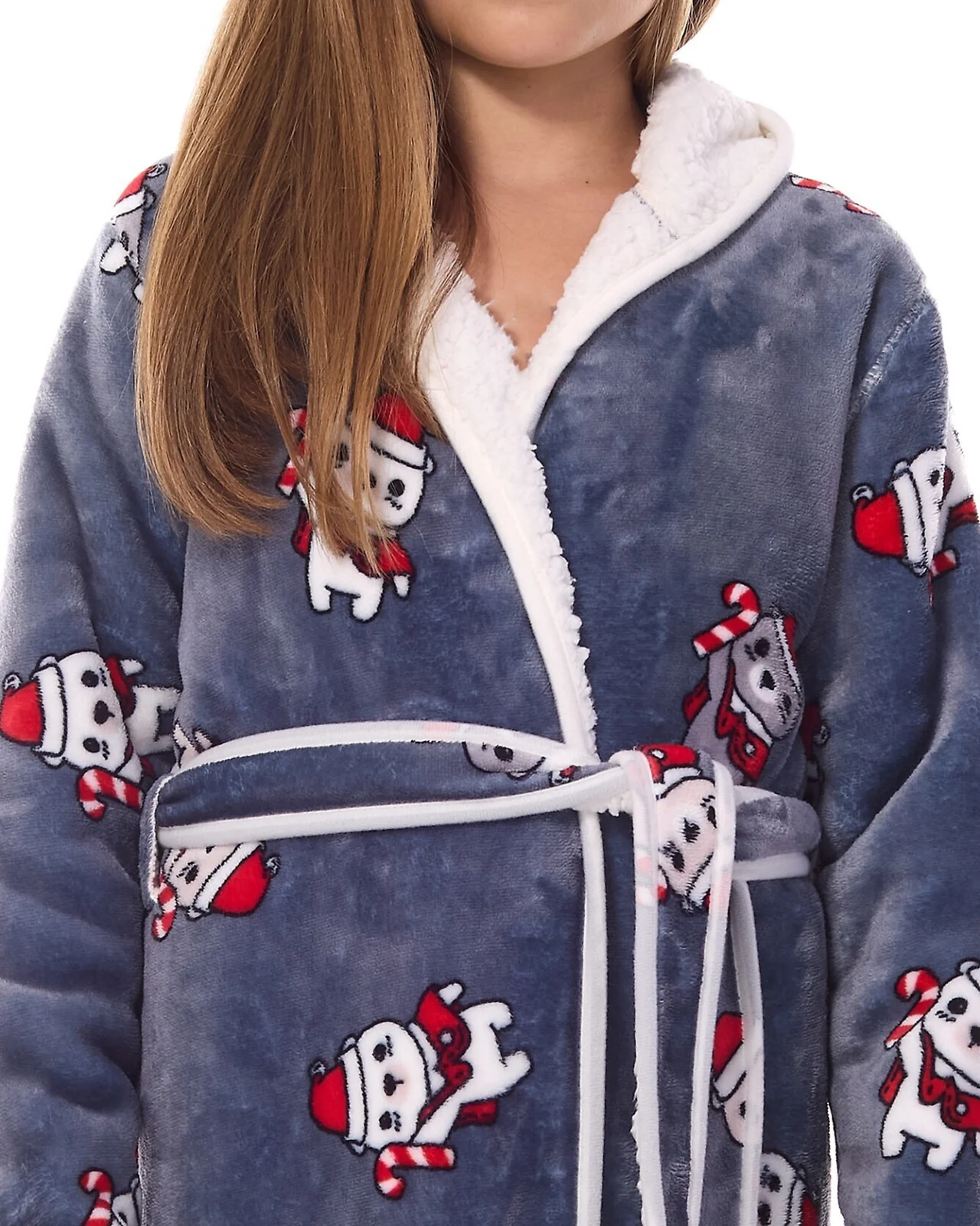 Szlafrok dziewczęcy z kapturem - miły materiał typu soft - ozdobny wzór w serca - wiązany w pasie - na wysokości bioder wygodne kieszenie   Skład: 100% poliester