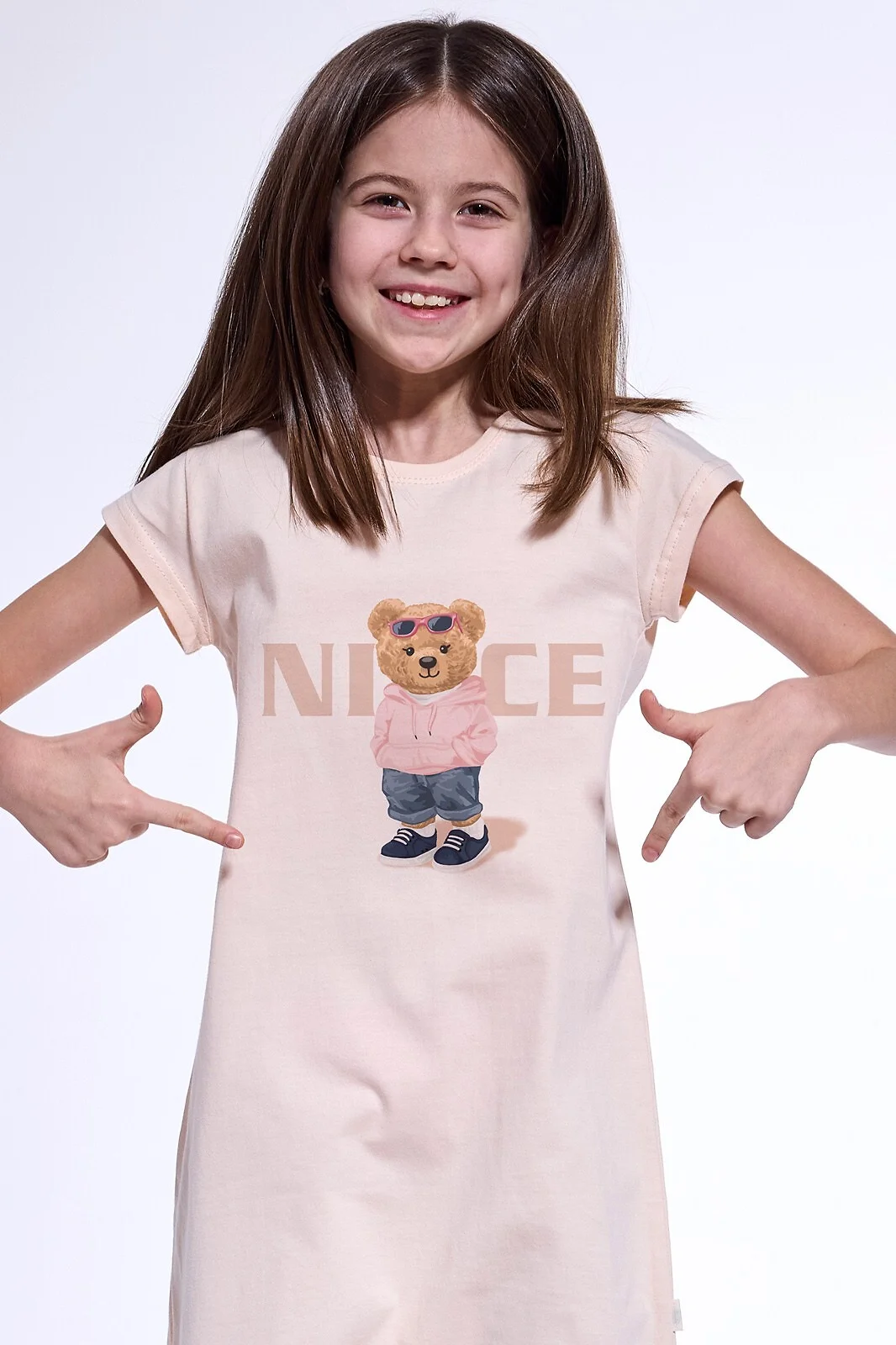 Koszula dziewczęca - miękka bawełna - okrągły dekolt - ozdobiona kolorowym nadrukiem - krótki rękaw - długość przed kolano    Skład: 100% bawełna