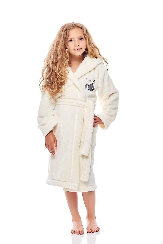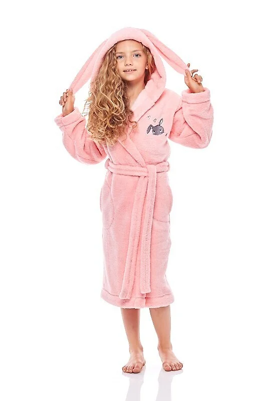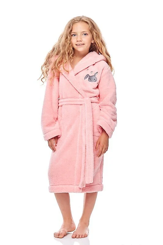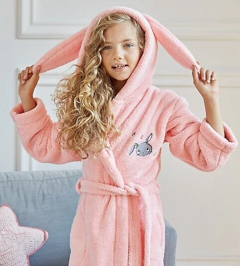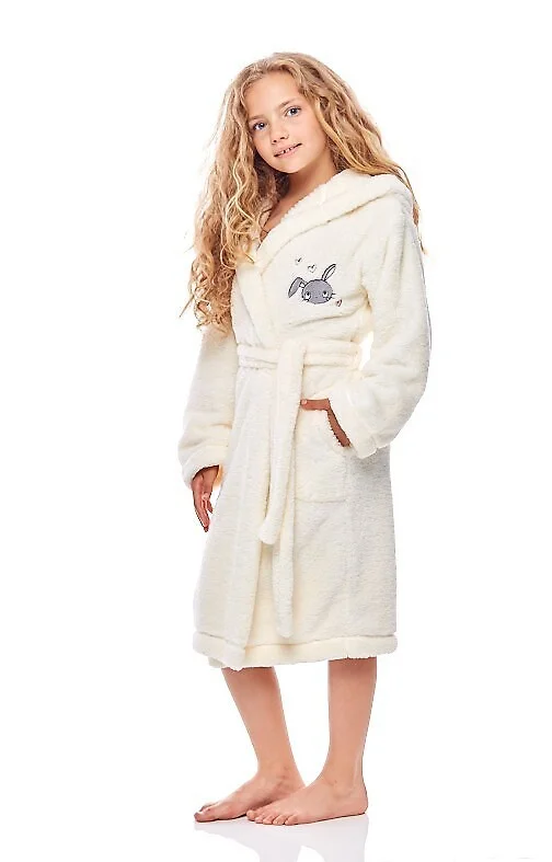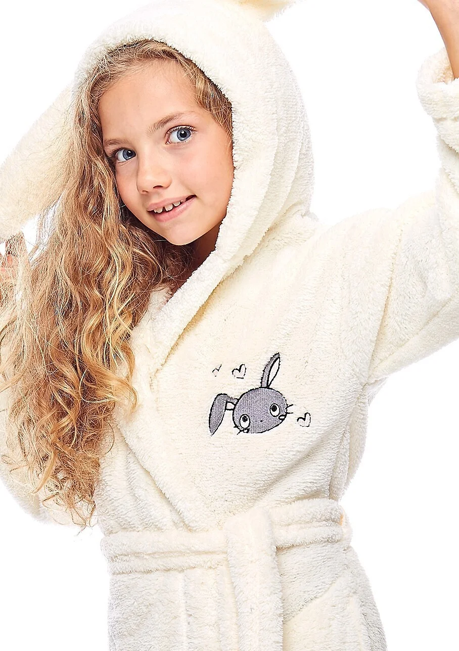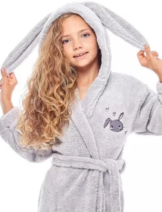 Szlafrok dziewczęcy - z kapturem zakończonym zabawnymi uszami - miła, miękka dzianina - na piersi ozdobna aplikacja - wiązany w pasie - na wysokości bioder wygodne kieszenie   Skład: 100% poliester