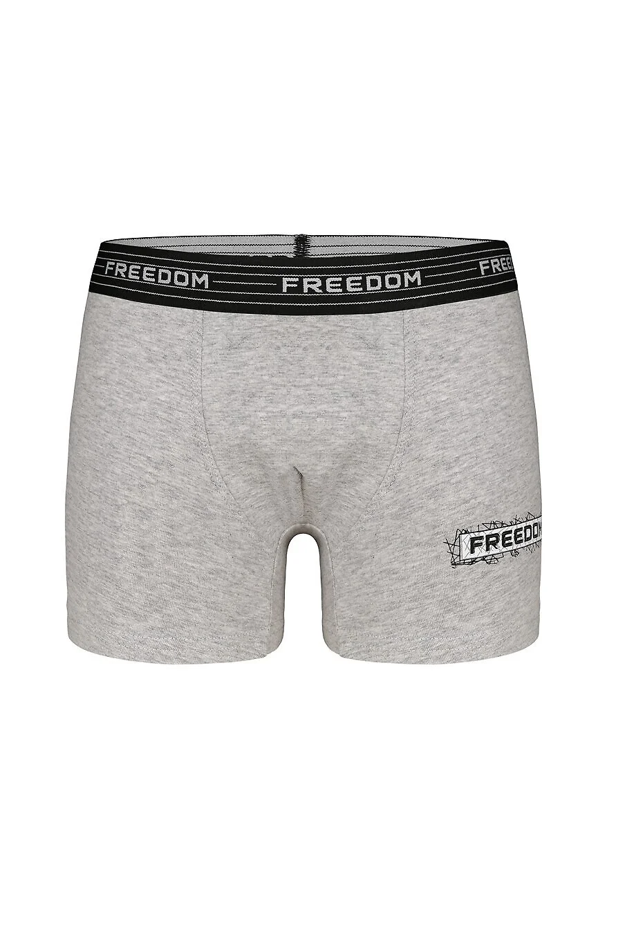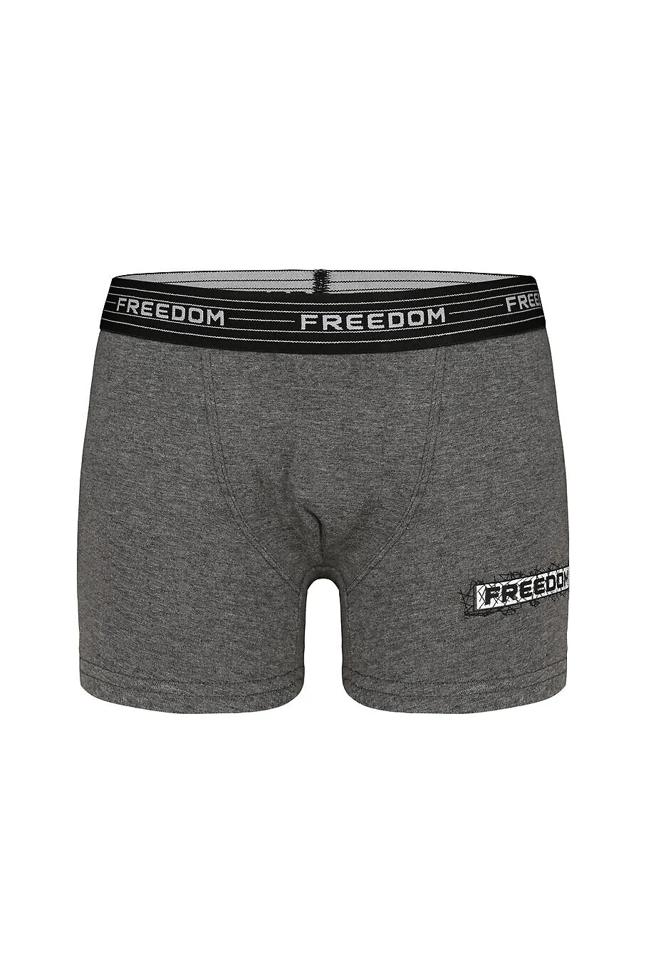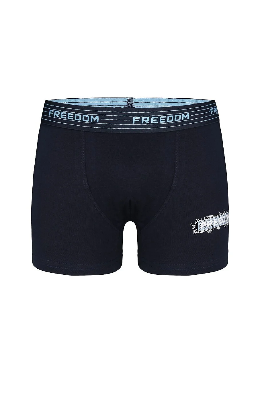 Bawełniane bokserki chłopięce - w pasie szeroka guma z kolorowym napisem - bezuciskowe wykończenie nogawek - doskonale przylegają do ciała - bok ozdobiony nadrukiem - pakowane w foliowy woreczek - dostępne kolory: granatowy, czarny, szary melanż, ciemny szary melanż, jeans melanż Skład: 95% bawełna, 5% elastan