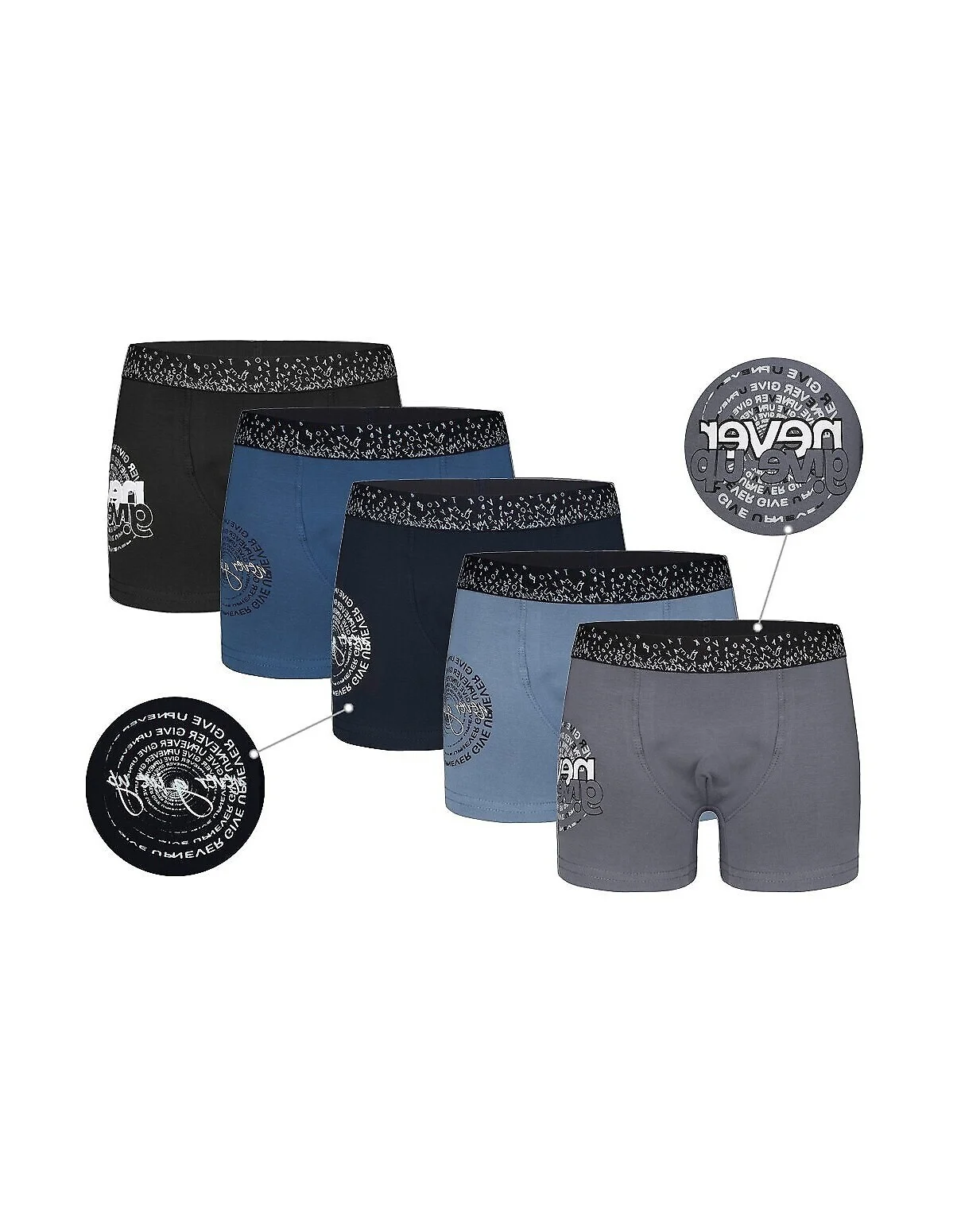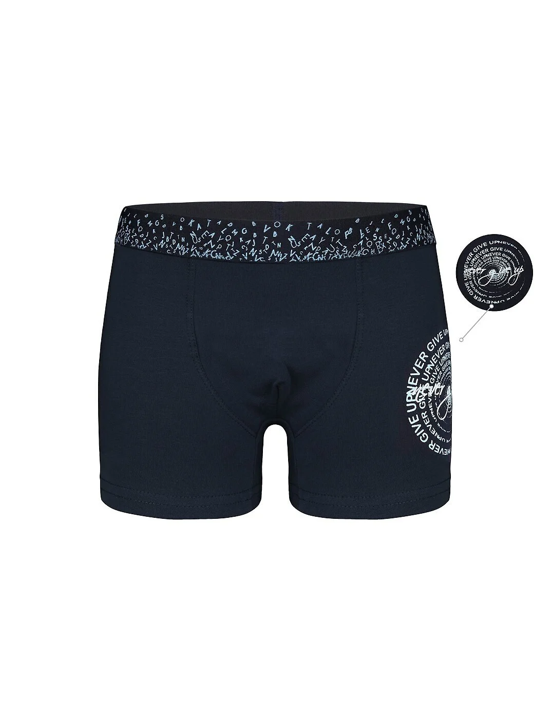 Bawełniane bokserki chłopięce - w pasie szeroka, ozdobna guma - bezuciskowe wykończenie nogawek - bok ozdobiony nadrukiem - doskonale przylegają do ciała - pakowane w foliowy woreczek - dostępne kolory wybierane losowo: granatowy, jeans, niebieski, szary, czarny Skład: 95% bawełna, 5% elastan