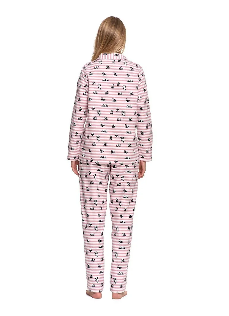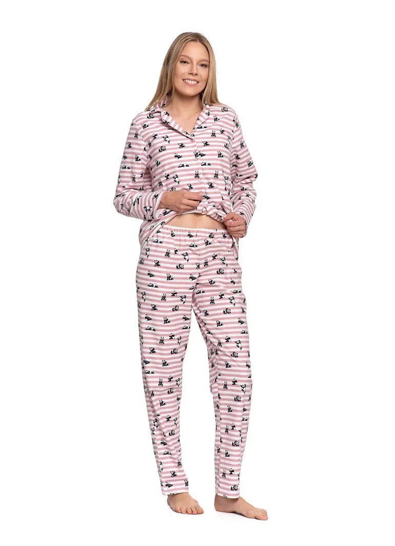 Piżama damska - wysokiej jakości bawełniana flanela - print w paski i zabawne pandy - bluza z długim rękawem - z kołnierzykiem, zapinana na guziki - długie spodnie z kieszeniami - w pasie gumka obszyta materiałem   Skład: 100% bawełna