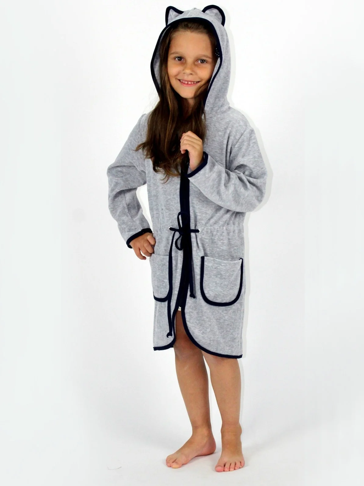 Szlafrok dziecięcy zapinany na suwak. Na bokach praktyczne kieszenie, ściągany w pasie. Kaptur ozdobiony słodkimi uszkami.