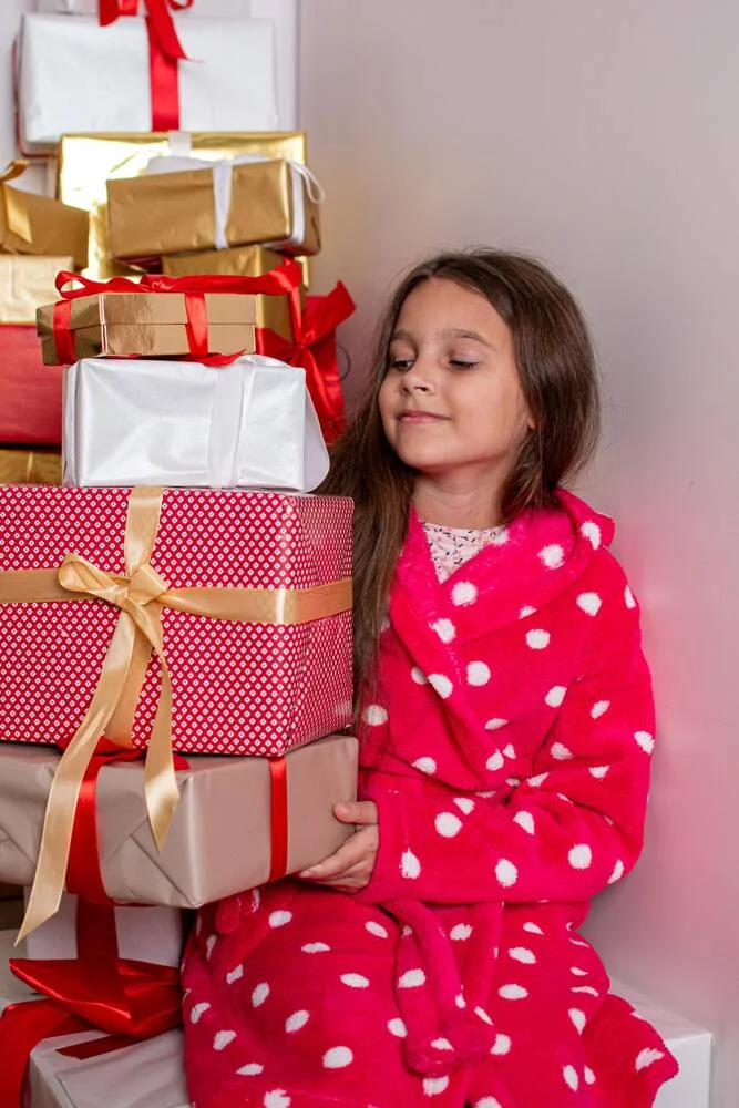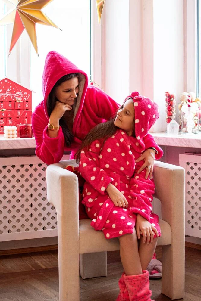 Szlafrok dziecięcy z kapturem. Wykonany z miękkiej dzianiny w kropki. Wiązany w pasie. Po bokach praktyczne kieszenie.