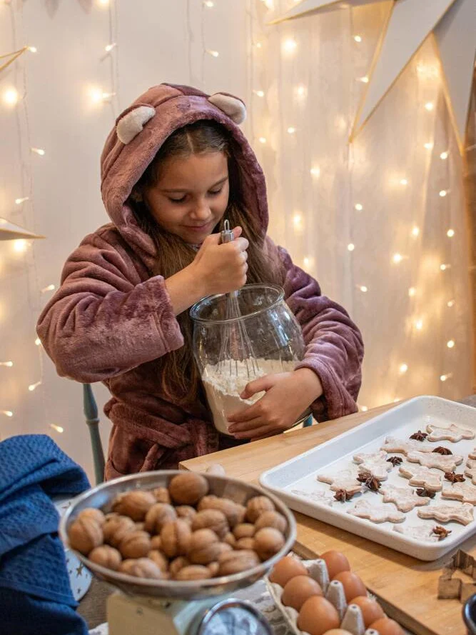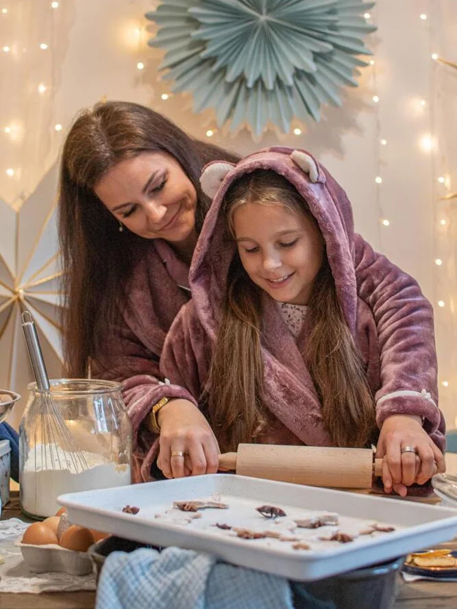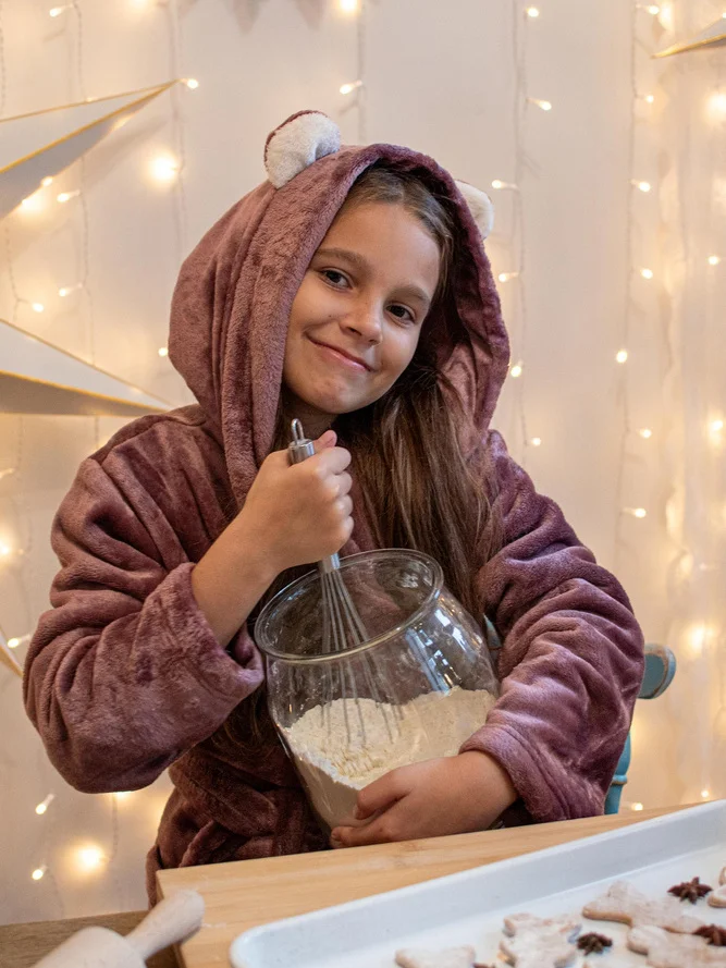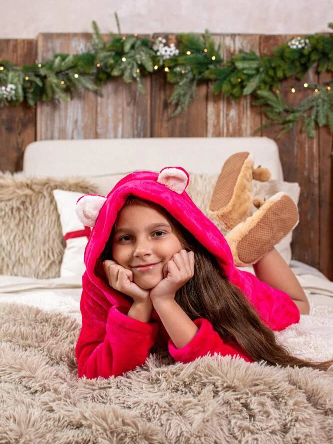 Szlafrok dziecięcy z kapturem z ozdobnymi uszami. Wykonany z miękkiej dzianiny. Wiązany w pasie.