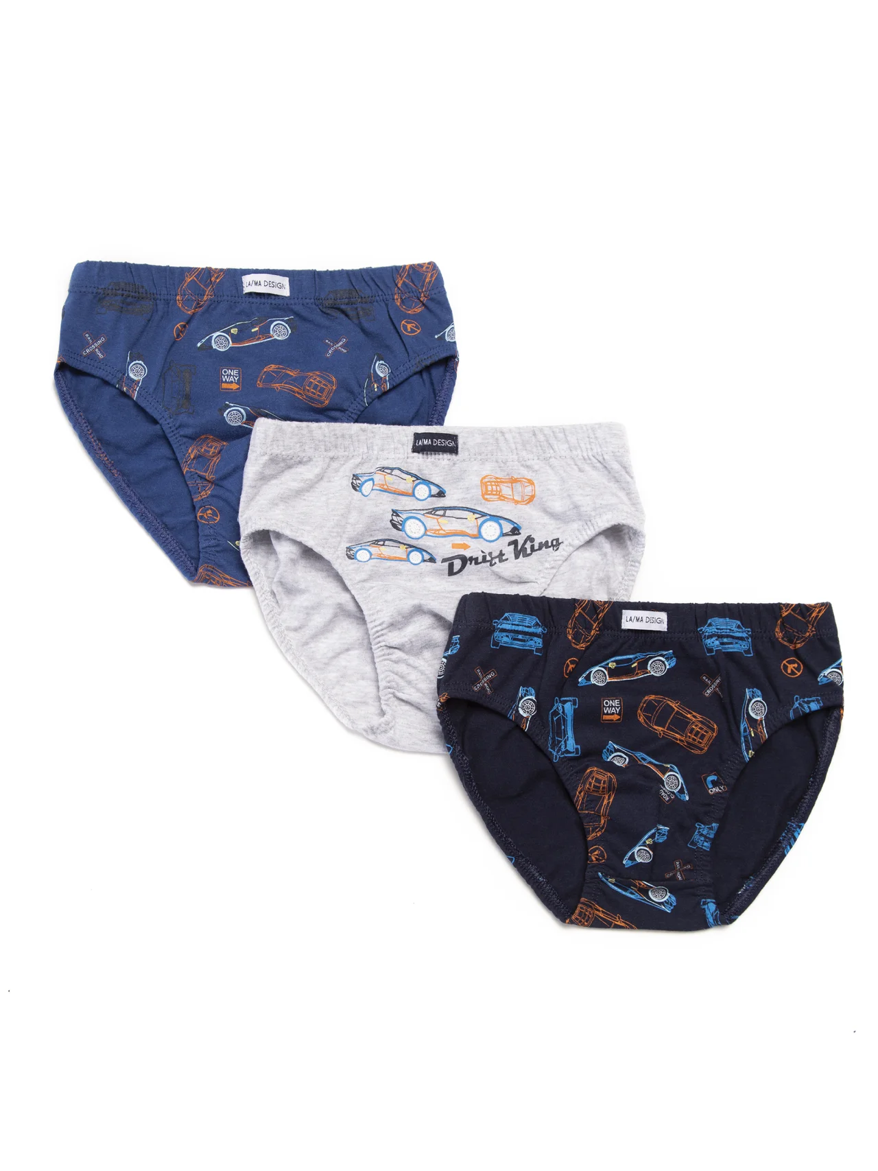 Slipy chłopięce wykonane z wysokiej jakości, kolorowej bawełny, zdobione modnymi wzorami. W pasie komfortowa guma w tunelu. Z przodu aplikacja z logo Lama. Pakowane w pudełko po trzy sztuki/ szary, jeans, granatowy.