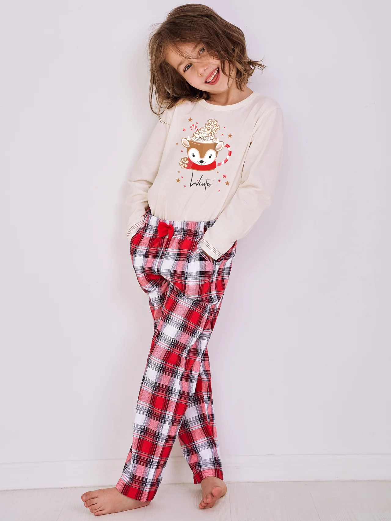 Piżamka dziewczęca bawełniana z długim rękawem i długimi spodniami. Koszulka zdobiona kolorowym nadrukiem, spodnie w kratę. Piżamka idealna na prezent świąteczny.