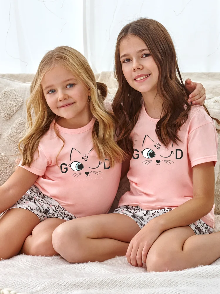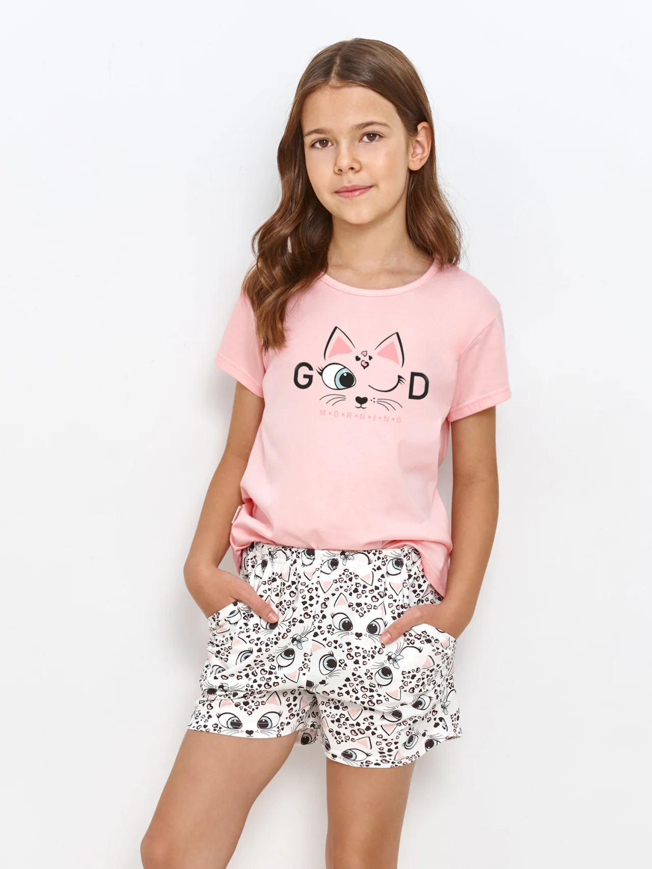 Letnia piżama dziewczęca wykonana z miłej w dotyku dzianiny bawełnianej. W komplecie koszulka z krótkim rękawem oraz spodenki o kroju szortów.