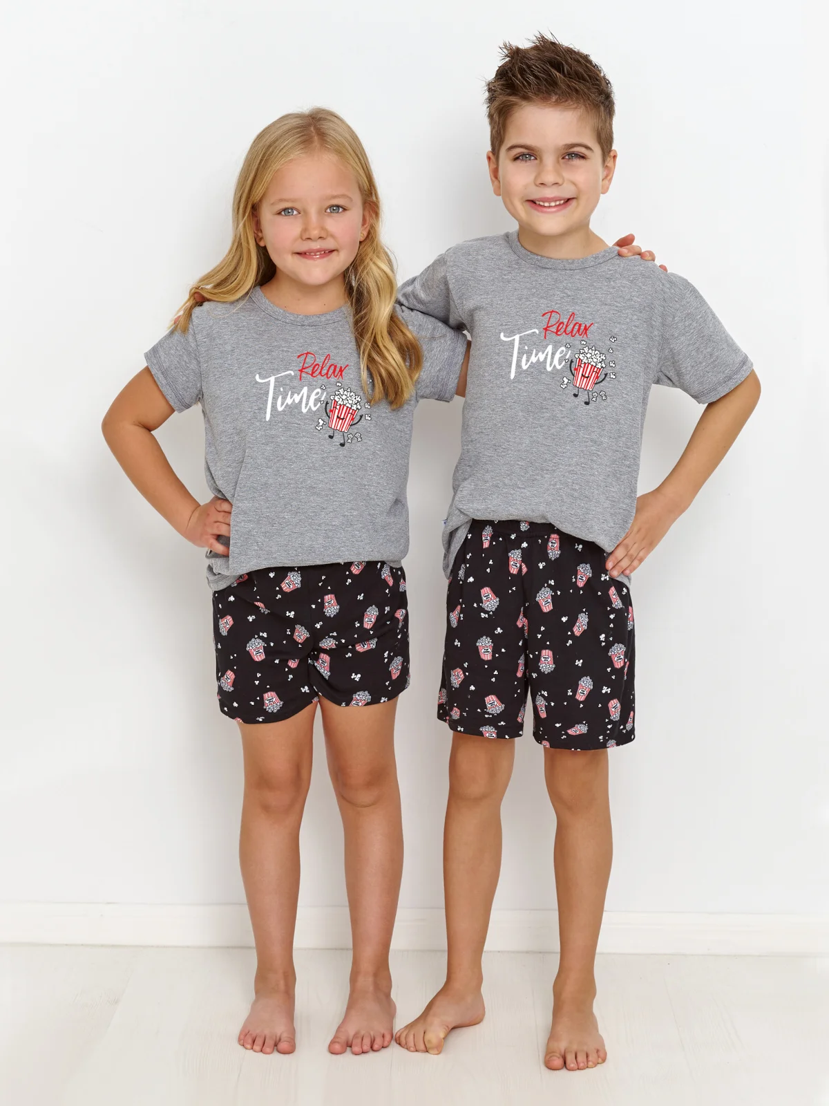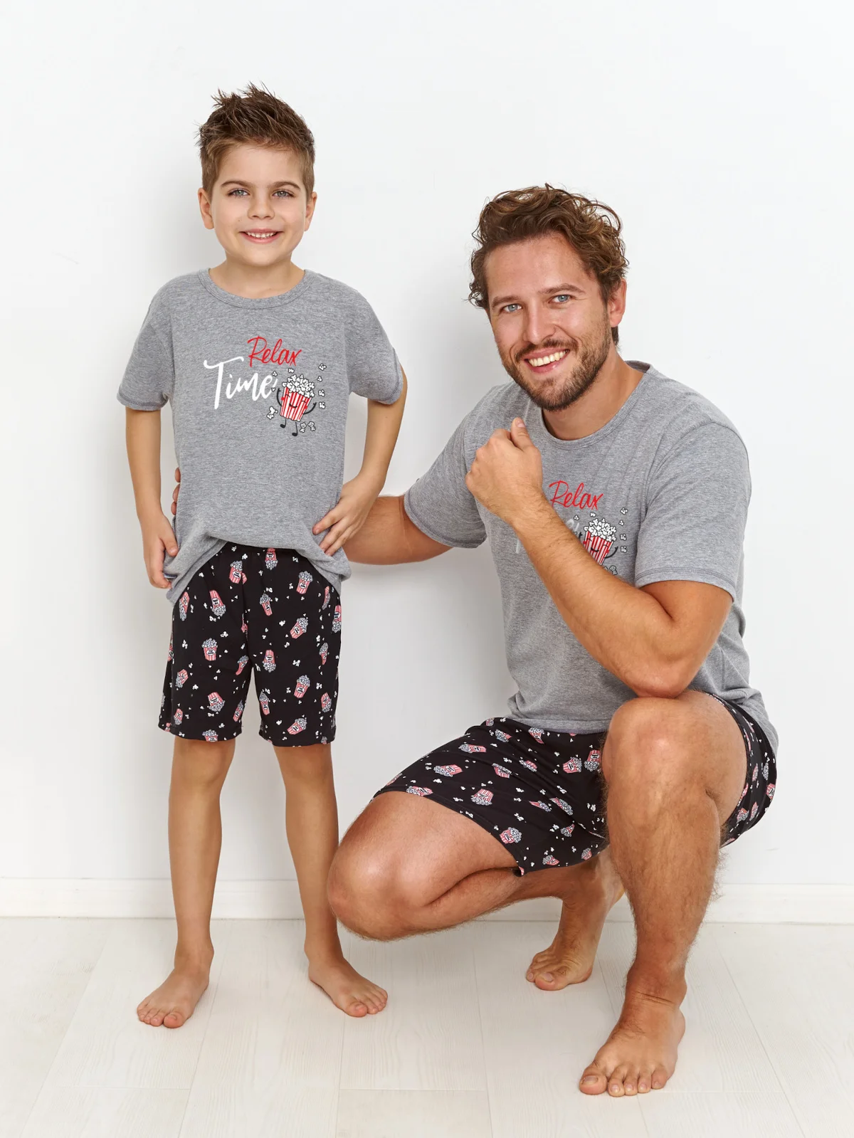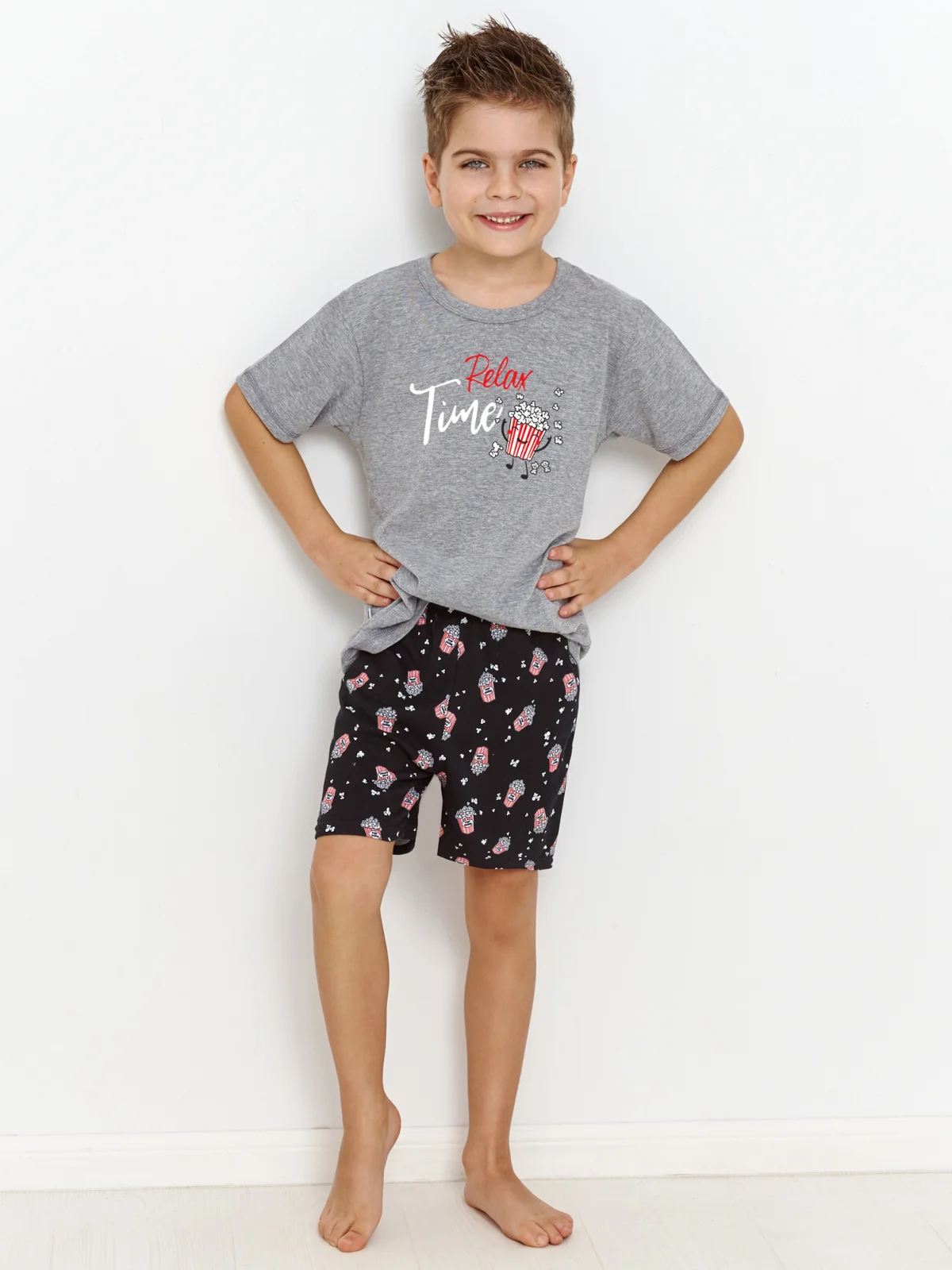 Piżama chłopięca z krótkim rękawem i ozdobnym nadrukiem. Spodnie krótkie wzorzyste.