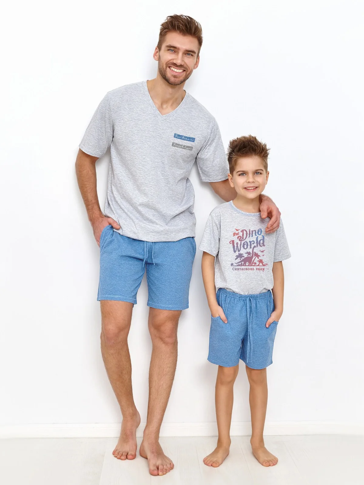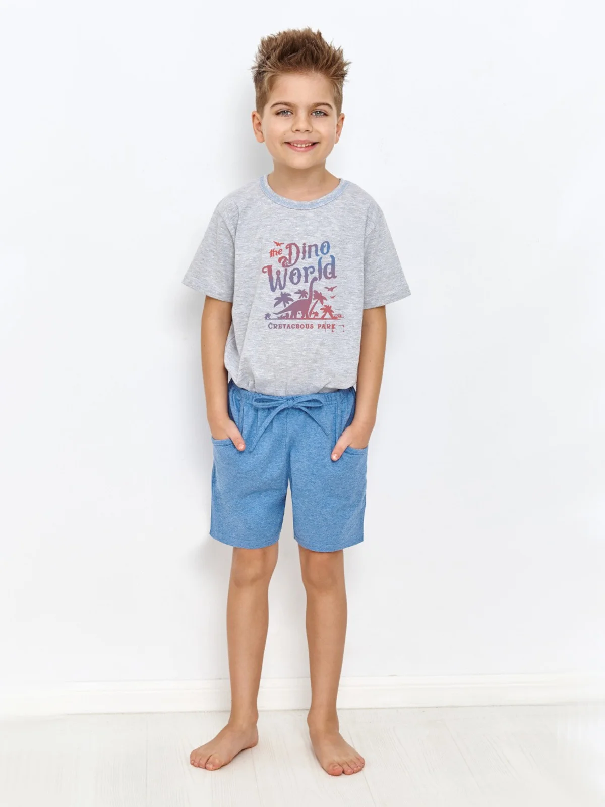 Piżama chłopięca z krótkim rękawem i ozdobnym nadrukiem. Spodnie krótkie z wygodną gumą w pasie.