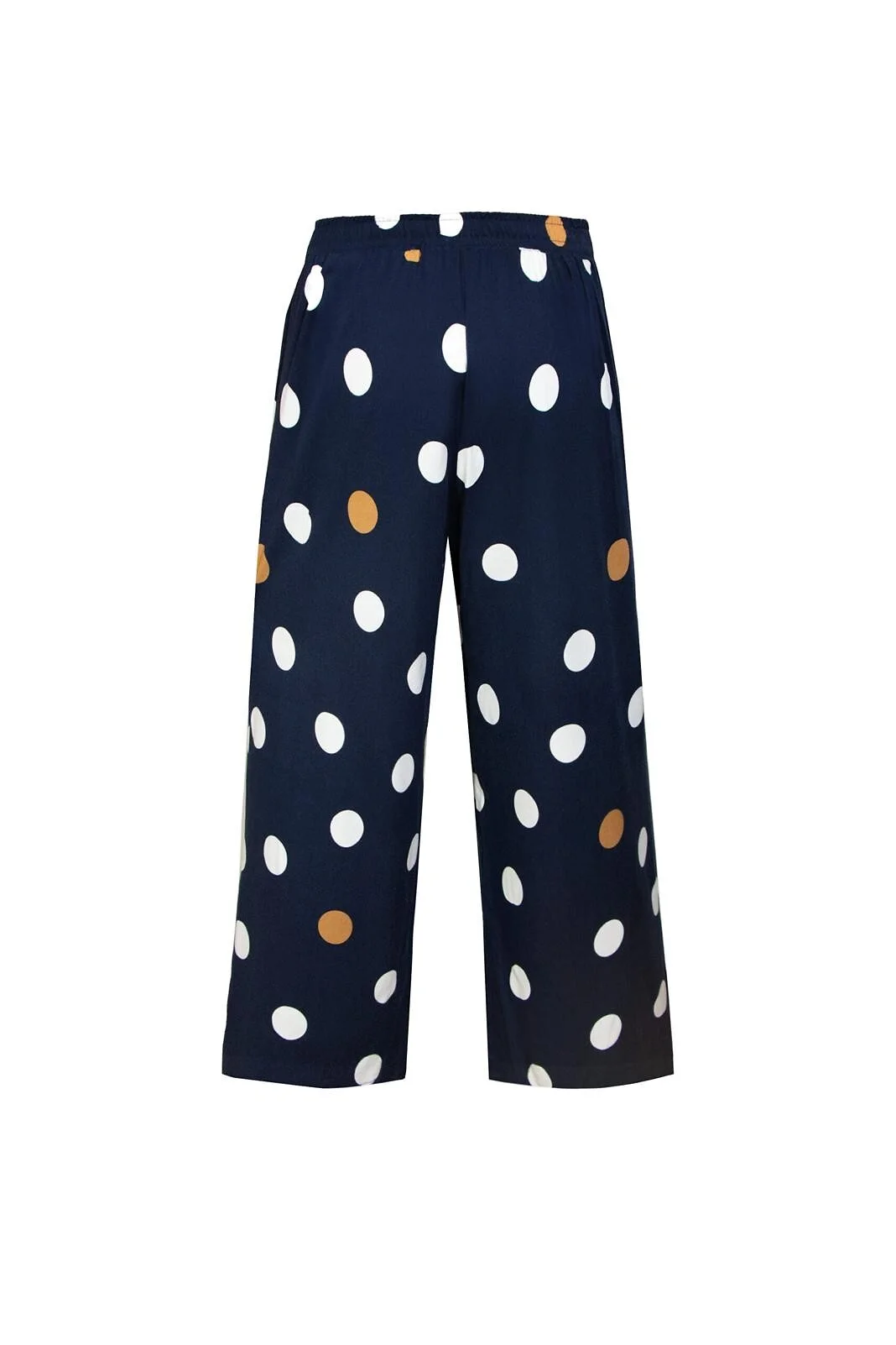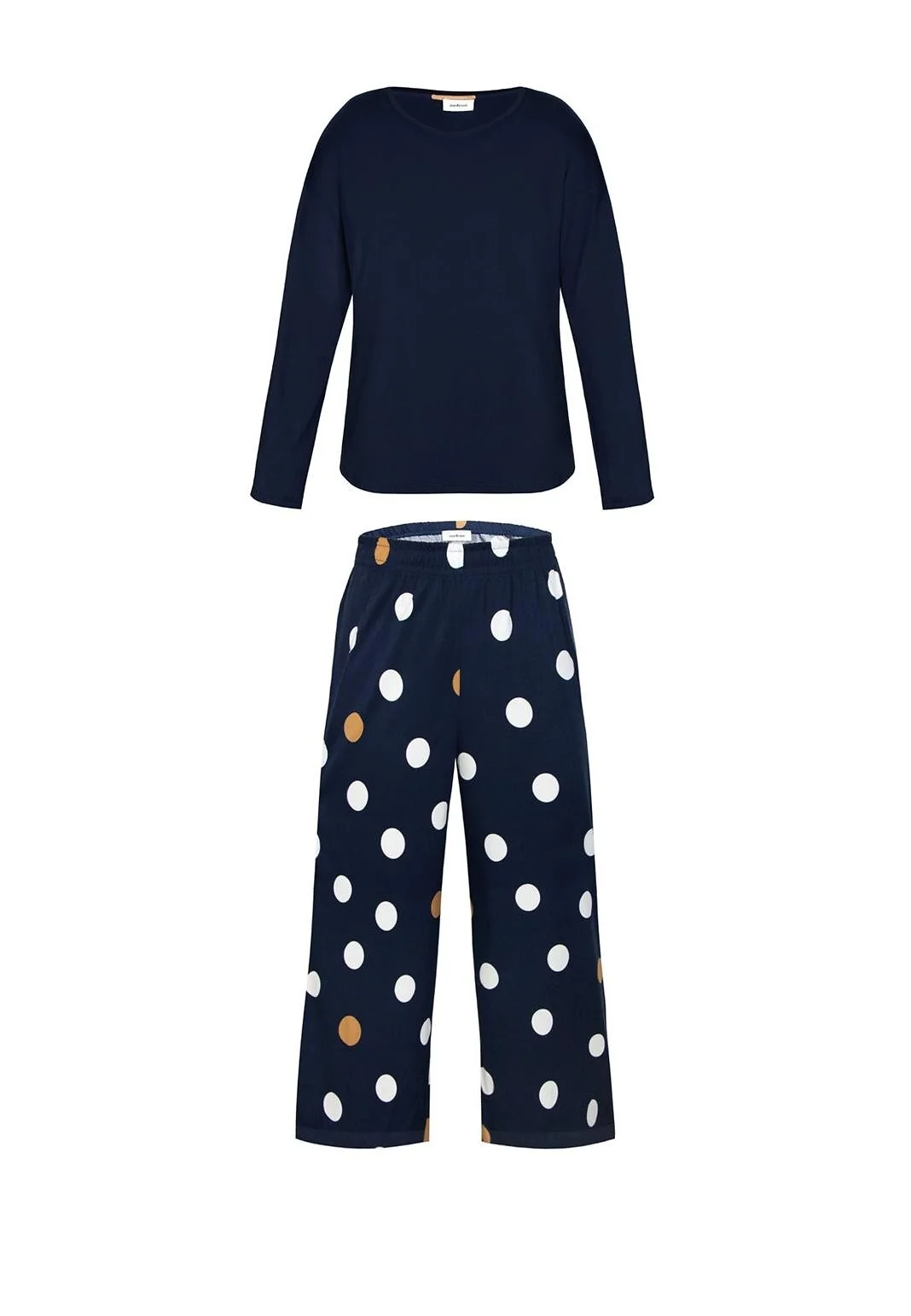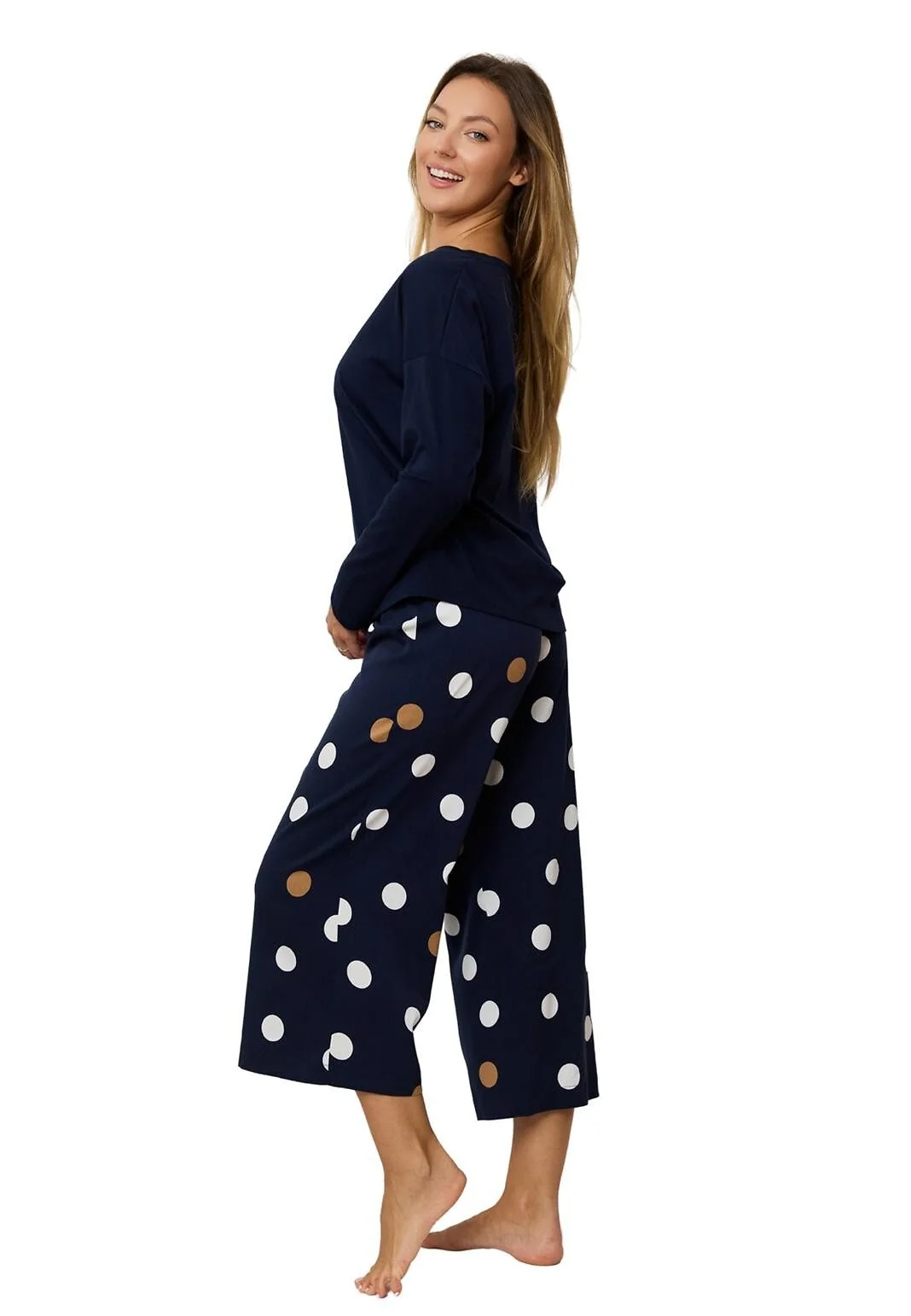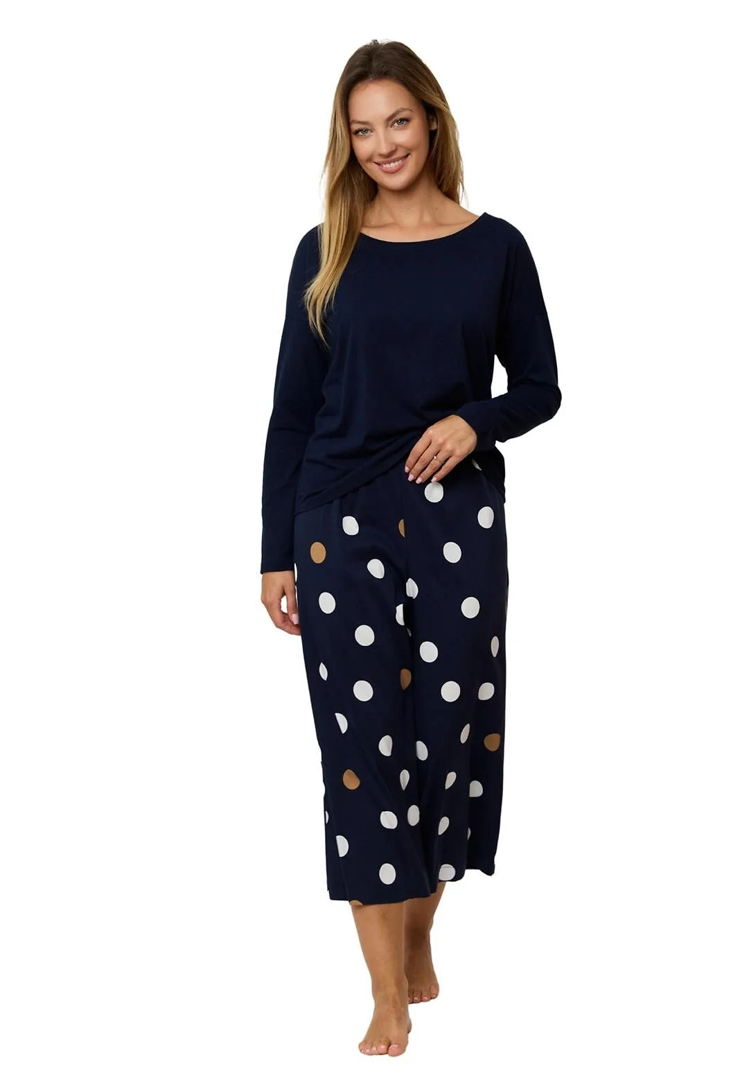 Piżama damska - koszulka z miękkiej dzianiny wiskozowej - długi rękaw - dekolt okrągły - do kompletu spodnie z materiału - ozdobione printem w grochy - długość 7/8 - pakowana w foliowy worek Skład: koszulka 93% wiskoza, 7% elastan, spodnie 98% wiskoza, 2% elastan
