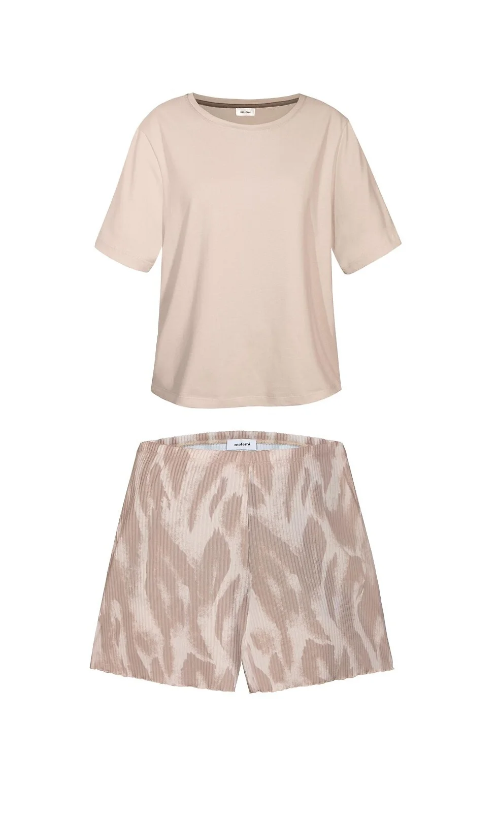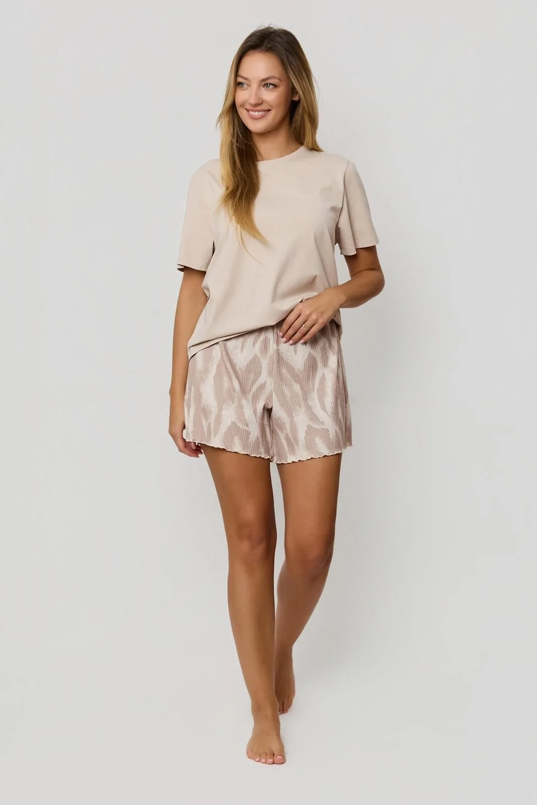 Piżama damska - wysokiej jakości dzianina - gładka, bawełniana koszulka z krótkim rękawem - dekolt okrągły - do kompletu krótkie, wzorzyste spodenki - struktura materiału w prążek - pakowana w foliowy worek Skład: koszulka 95% bawełna, 5% elastan, spodnie 65% wiskoza, 32% poliester, 3% elastan