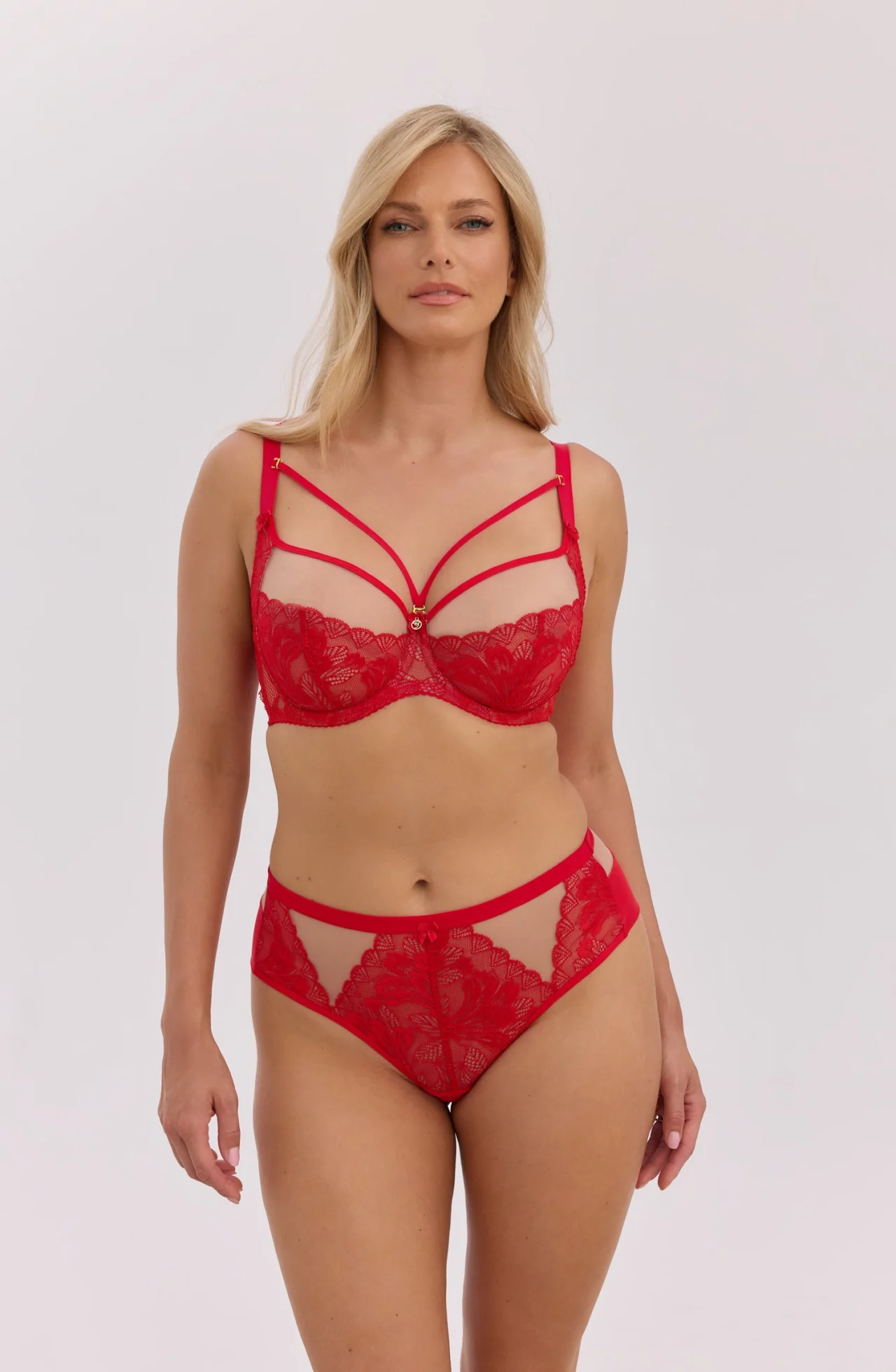 • wykonany z intensywnie czerwonej koronki, zachwyca subtelnym wzorem,
