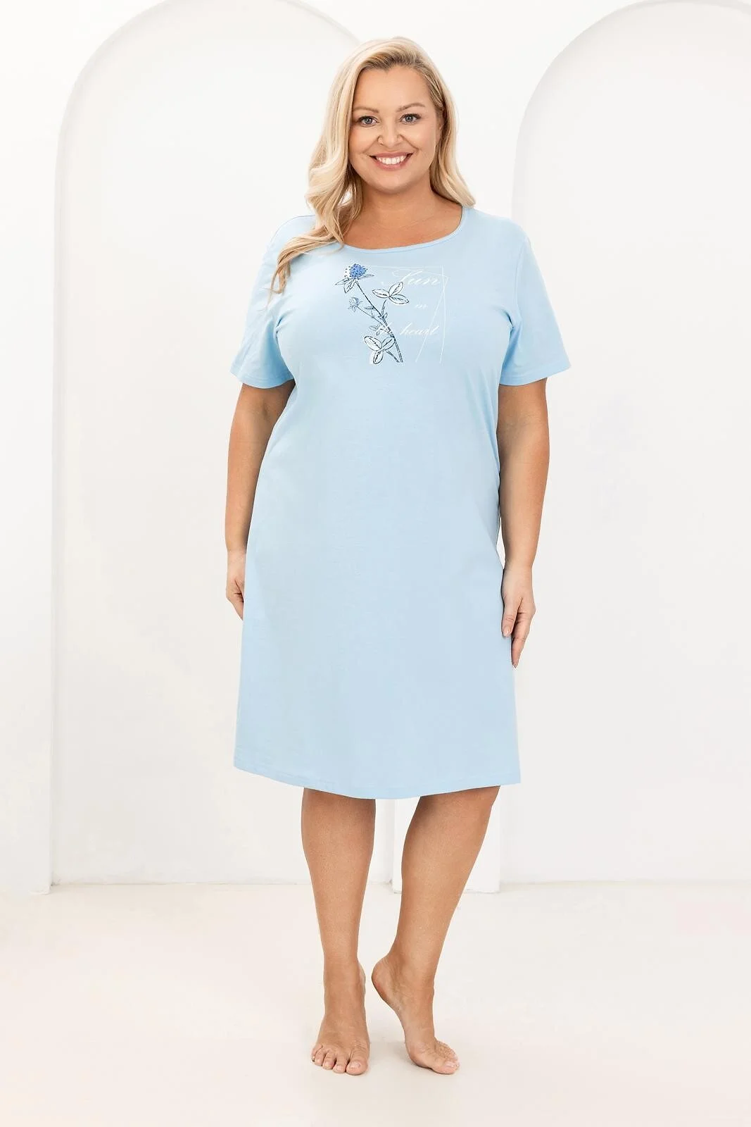 Bawełniana koszula damska - krótki rękaw - dekolt półokrągły - przód ozdobiony nadrukiem - długość przed kolano   Skład: 100% bawełna