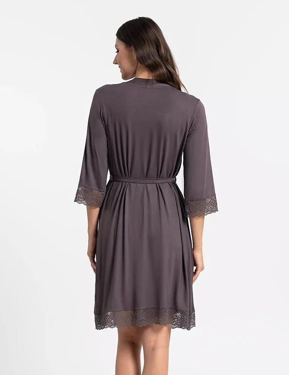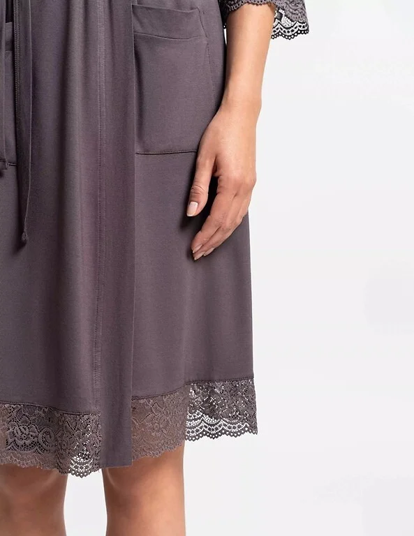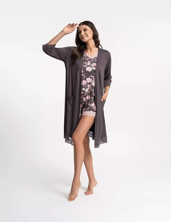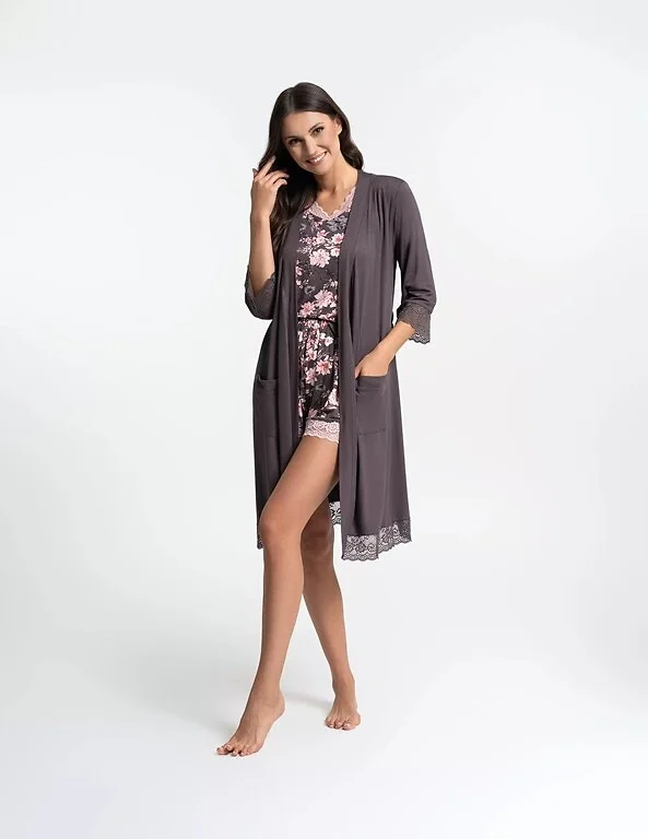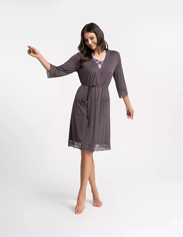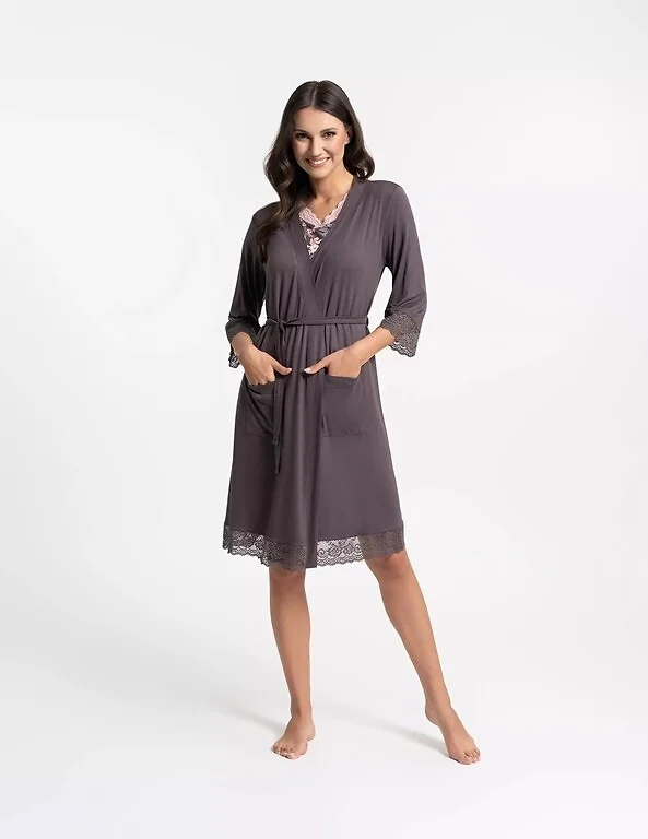 Szlafrok damski- z wysokiej jakości wiskozy- rękaw o długości 7/8- wiązany w pasie- mankiety i dół wykończone ażurową koronkąSkład: 95% wiskoza, 5% elastan