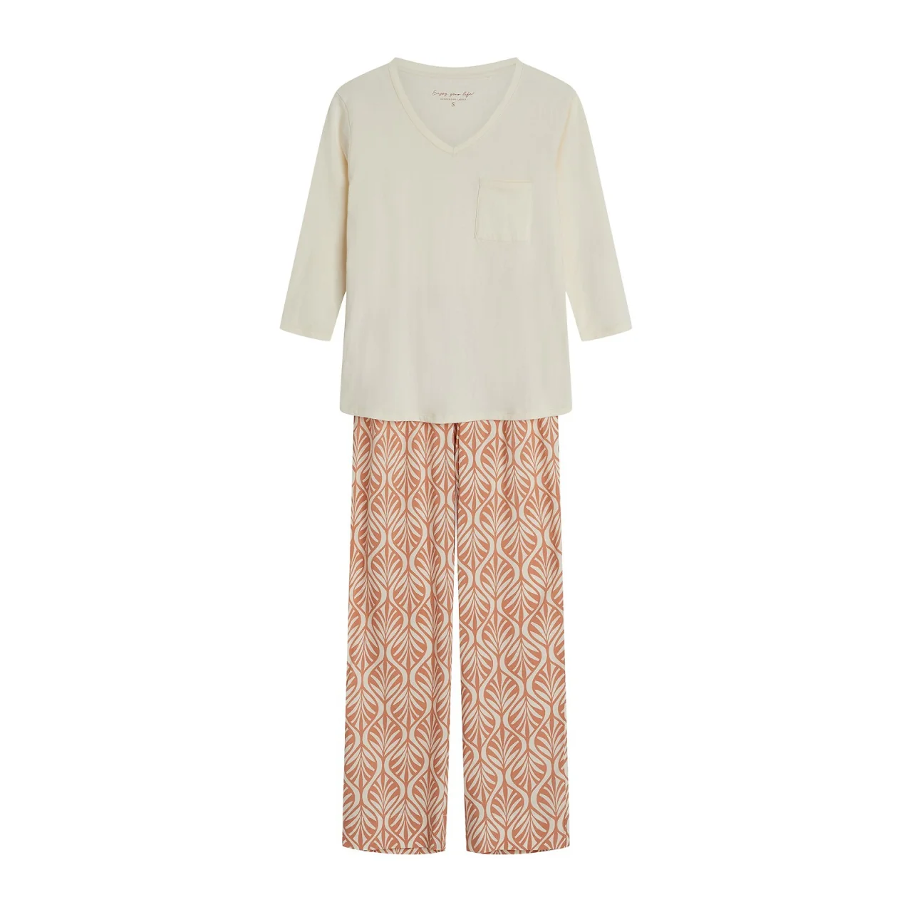 Piżama damska - wysokiej jakości materiały - koszulka z rękawem 3/4 - na wysokości piersi kieszonka - dekolt w szpic - do kompletu długie, wzorzyste spodnie - wykonane z wiskozowej tkaniny   Skład: koszulka 100% bawełna; spodnie 100% wiskoza