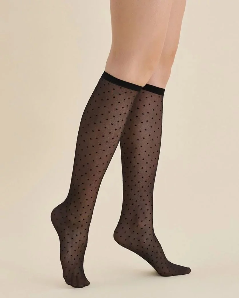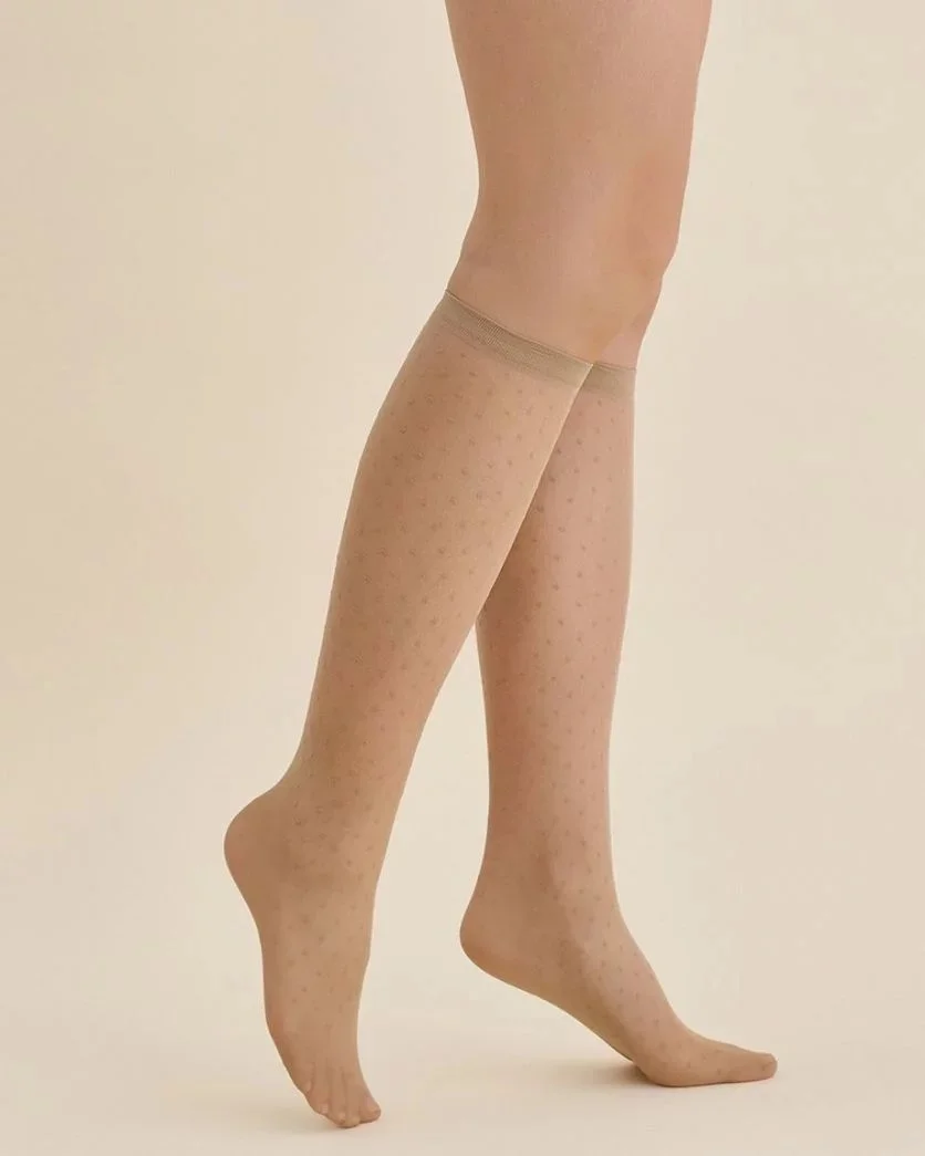 • cienkie z drobnymi kropkami na tle lekko transparentnej dzianiny,